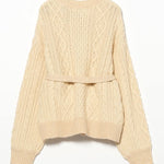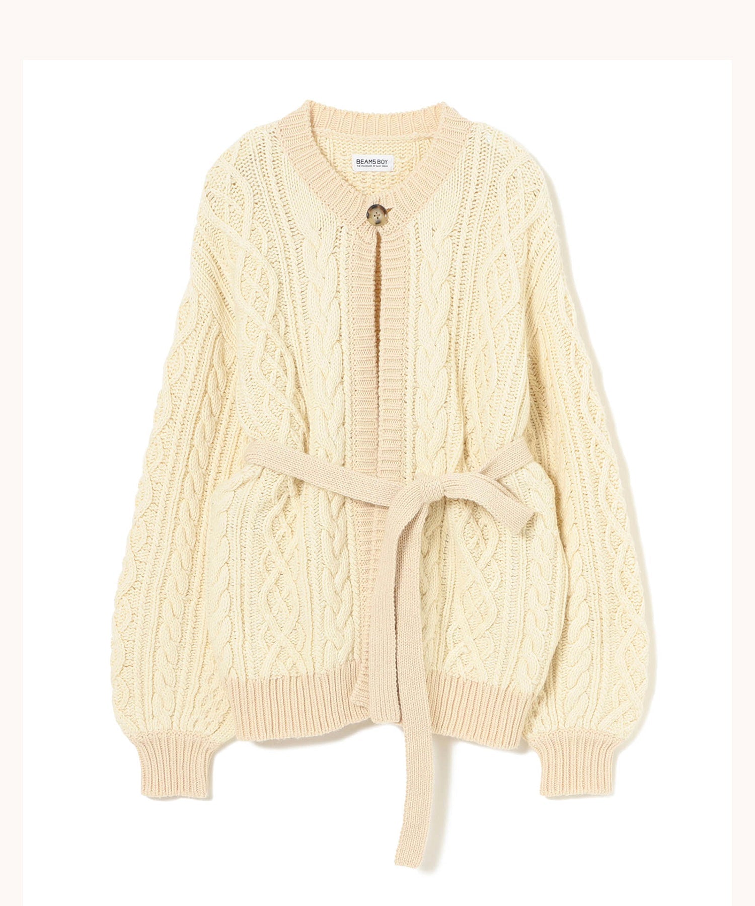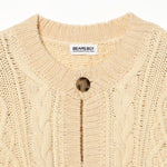 This Aran‑inspired cardigan re‑imagines classic cable knits with a modern touch—one‑button closure, a removable belt to shape the silhouette, and a striking two‑tone colour contrast between body and rib. The combination of timeless Aran patterns and updated tailoring creates a piece where heritage and refinement coexist seamlessly.