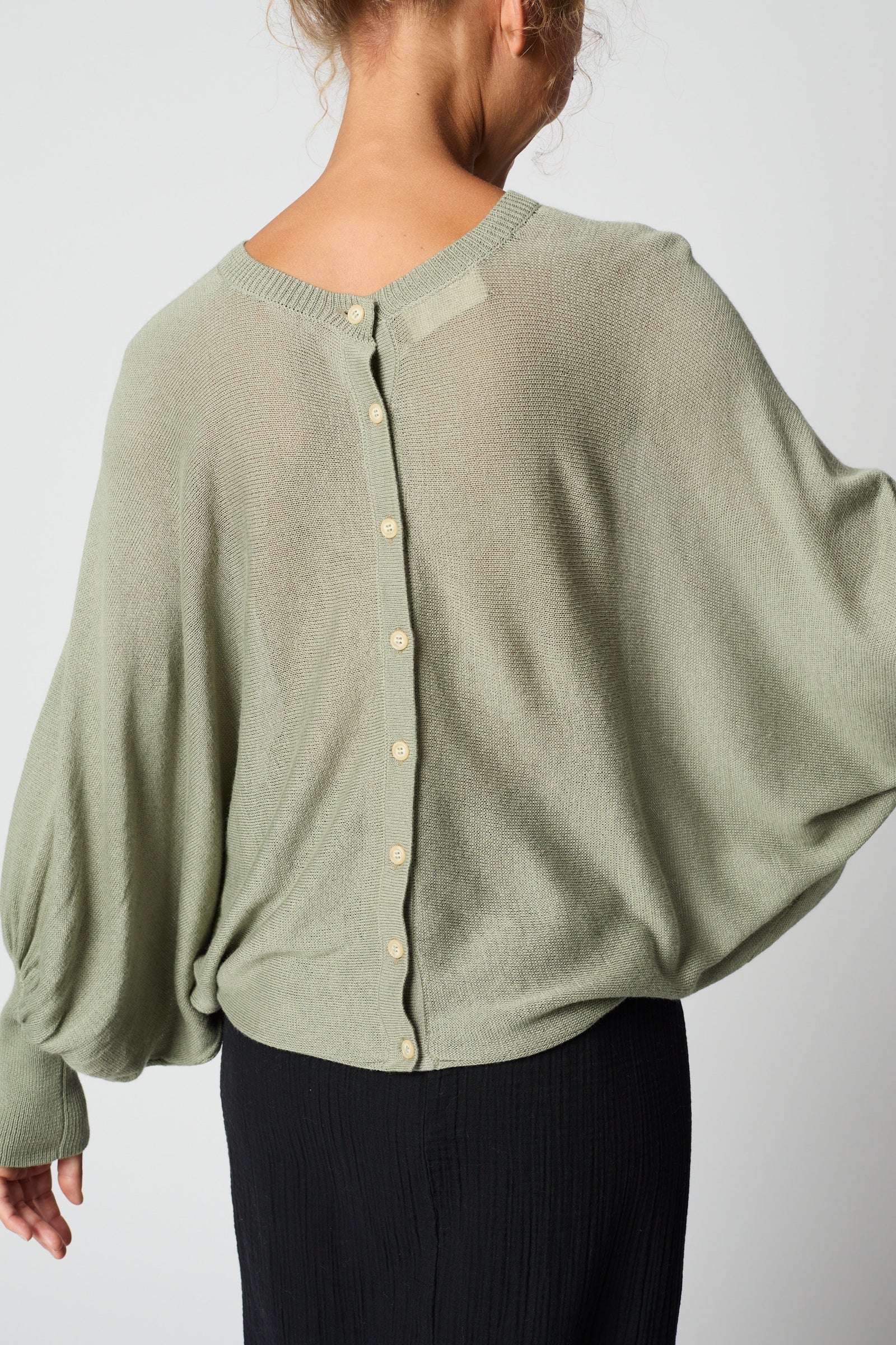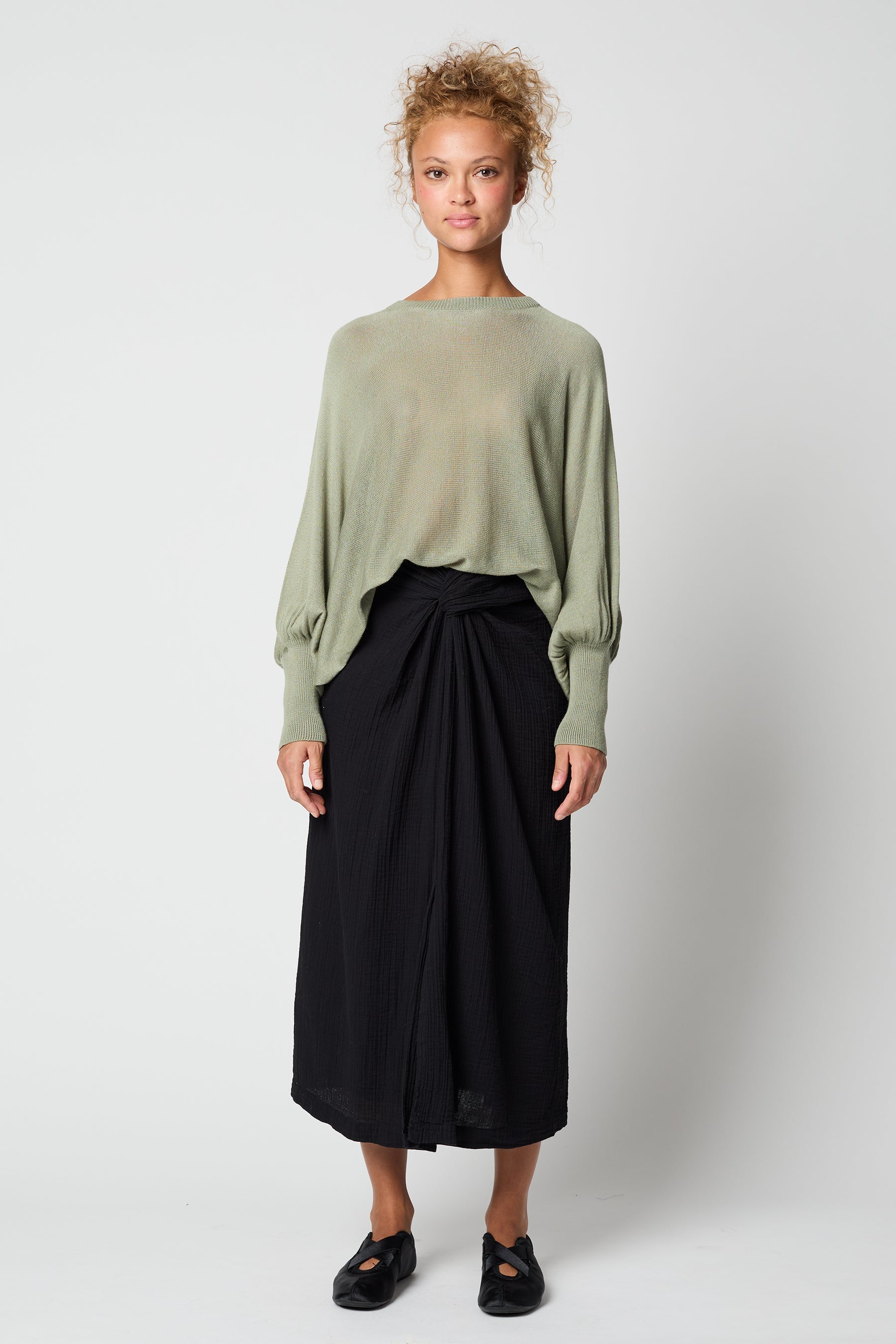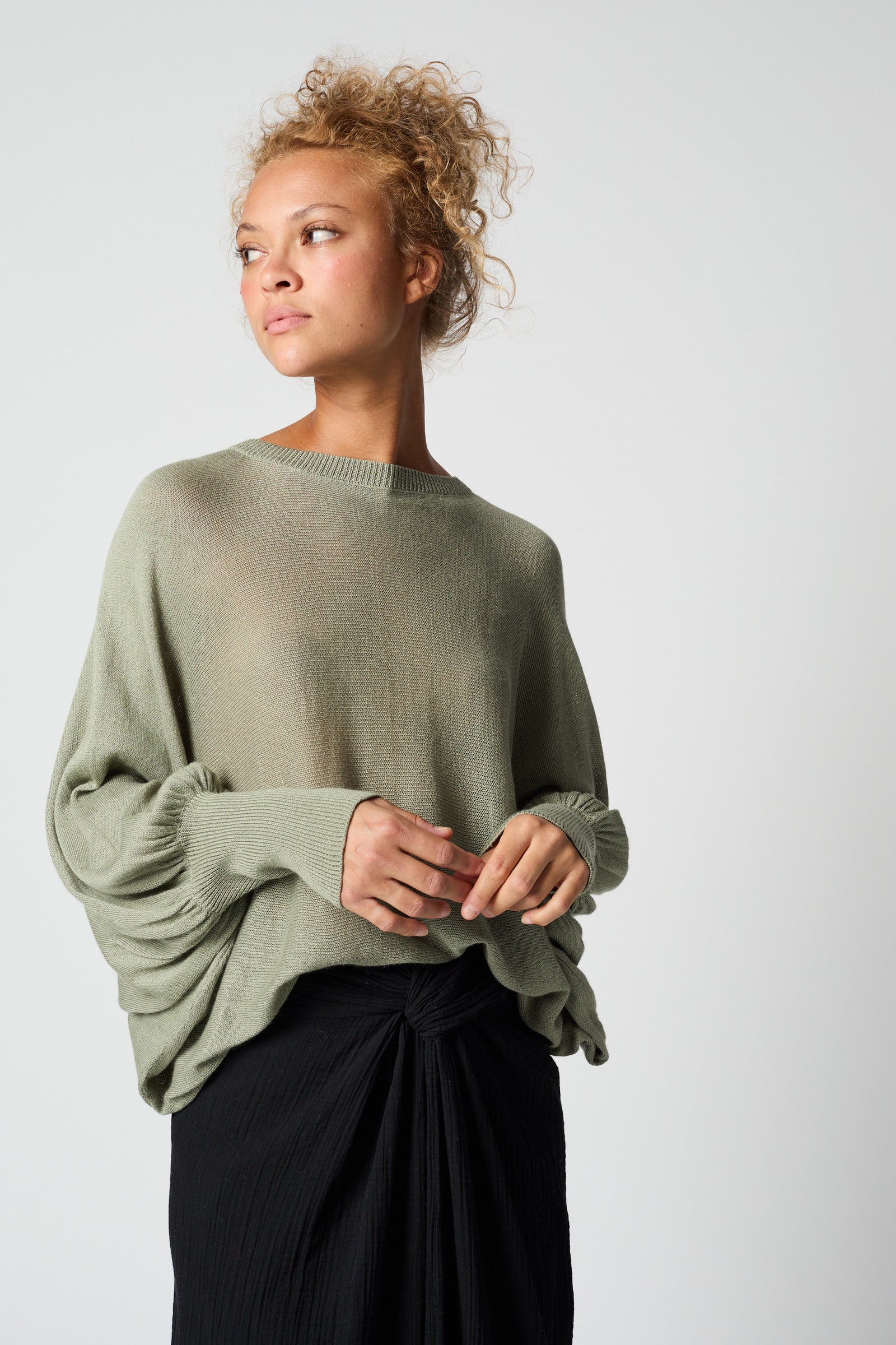 Graceful knit top in our fine gauge cotton viscose blend. Dramatic batwing sleeves add a voluminous counterpoint to the otherwise minimalistic sensibility of the Cecilia.