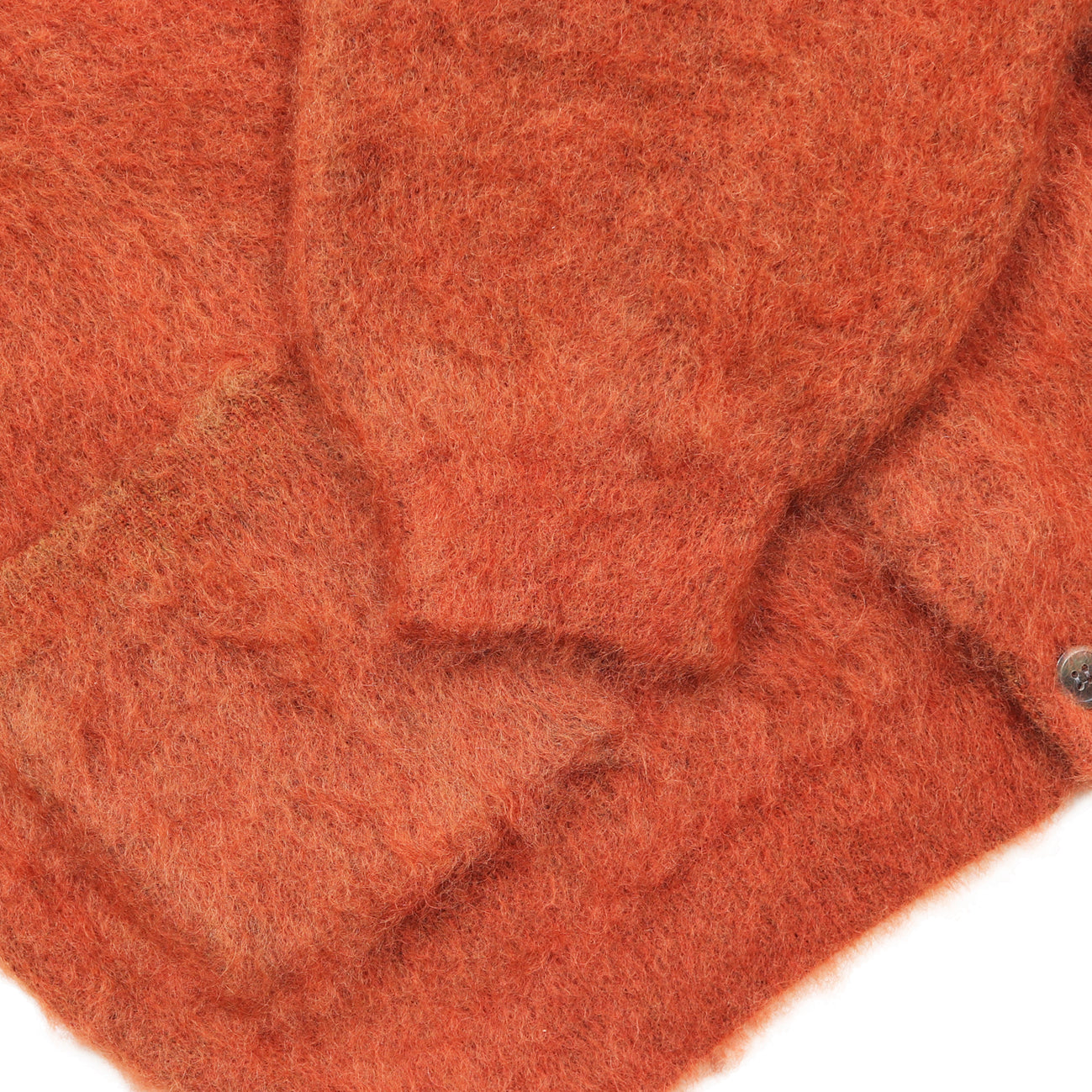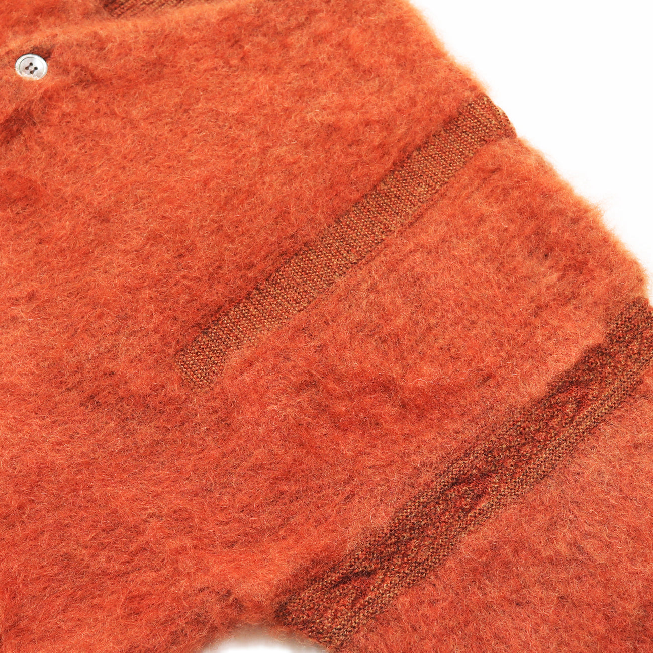 This cardigan is inspired by the image of snow-covered mountains turning red under the sunset, evoking the serene and majestic presence of a snowy peak. With a voluminous, relaxed silhouette, the mohair fuzz mimics the sunset's glow on the mountain, and shadows are expressed through textured areas on the shoulders and sleeve roots. Crafted from a rare blend of kid mohair with a soft, lustrous finish, it features a plating knit technique using two colors to create depth. Natural black pearl buttons add a unique iridescence to each piece.