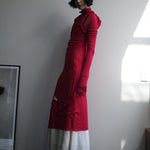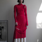 A dress with an asymmetric design made from 90% Tencel and 10% cashmere. The luxurious Tencel-cashmere fabric combines the smooth, moisture-absorbing properties of Tencel with the softness and warmth of cashmere. It is lightweight, comfortable, and environmentally friendly, with a refined sheen. The asymmetric design offers a unique look while maintaining a flattering silhouette through carefully crafted cuts and details, making it suitable for elegant wear.