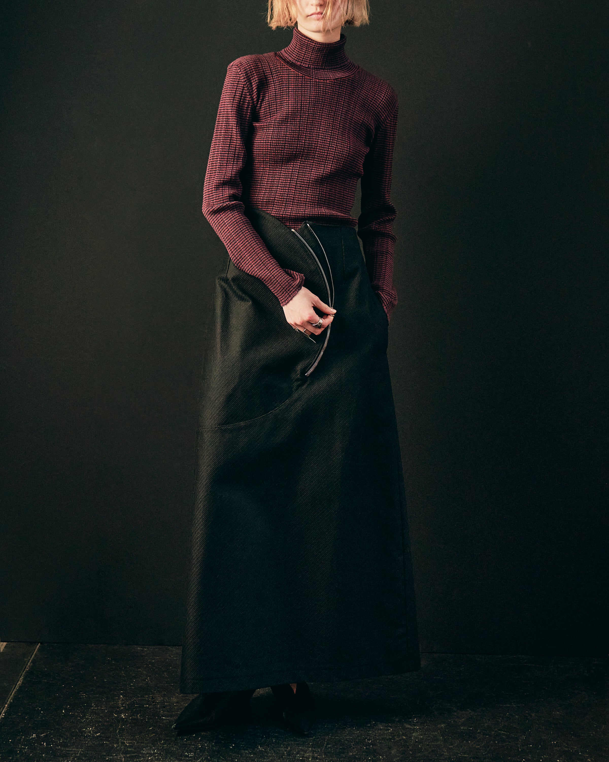 The circular side is high-waisted, while the left side is just right at the waist, creating a balance that creates a rhythm even with a simple outfit.