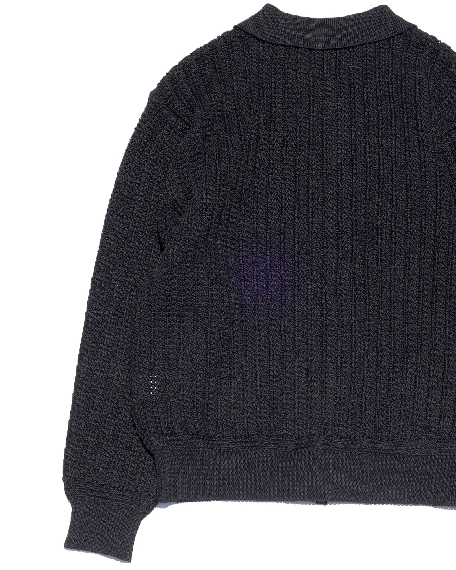Crafted from crisp and airy cotton resembling ramie, the Crochet Polo Cardigan offers a refreshing handfeel perfect for spring and summer. Inspired by vintage hand-knitted patterns, this versatile piece works effortlessly as both a cardigan and a shirt, showcasing intricate crochet detailing and refined aesthetics.