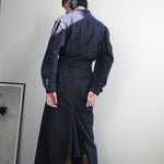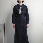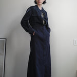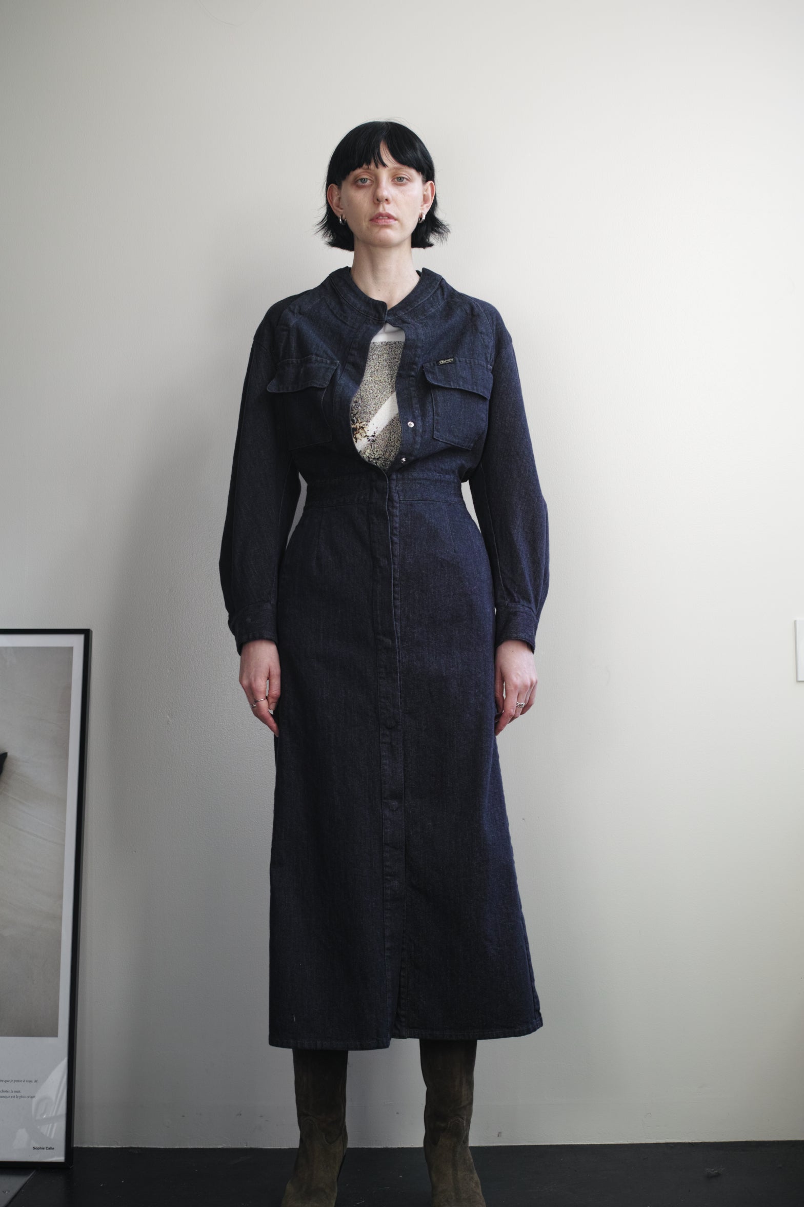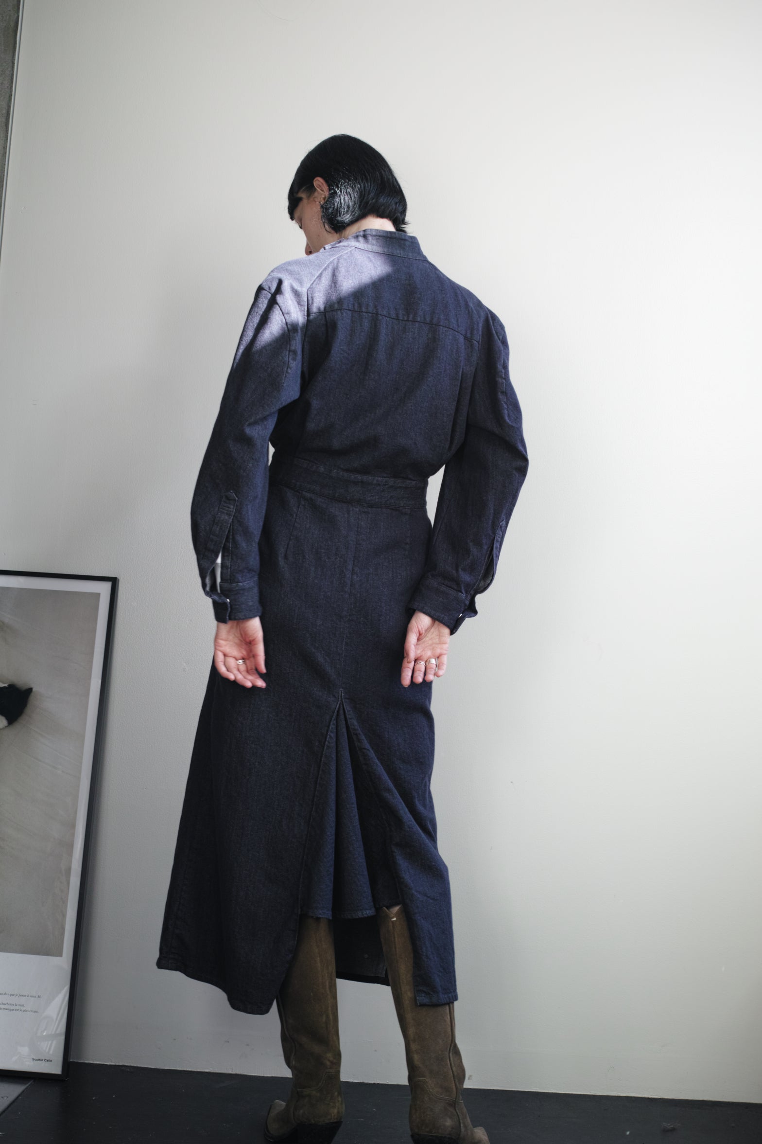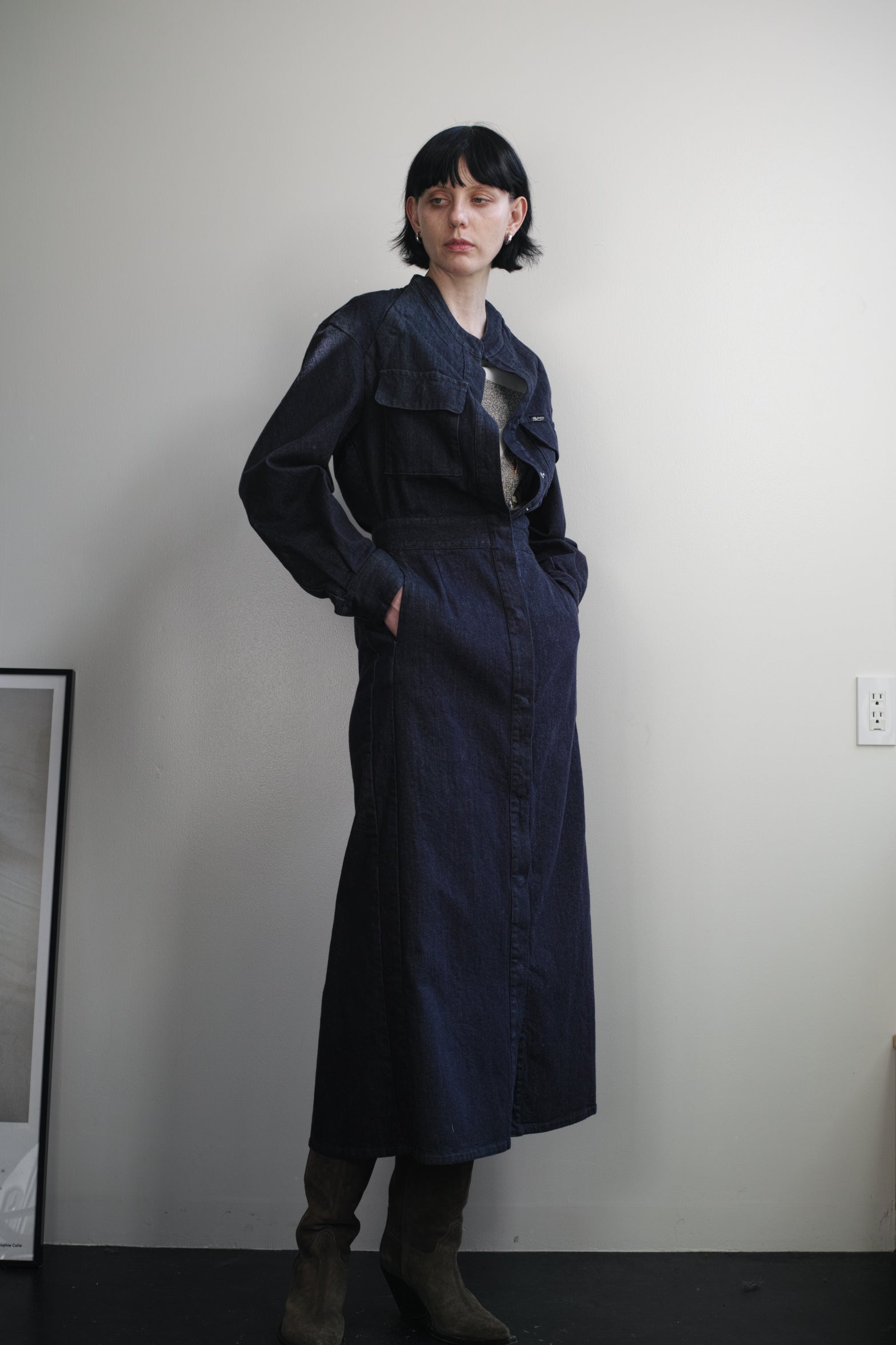 A refined denim overall with a sophisticated finish. Made from a blend of 98% cotton and 2% polyurethane, using 8.4 oz uneven thread stretch denim. The navy color features fade-resistant denim. The distinctive collar design is crafted to create a beautiful silhouette when the buttons are left open.
