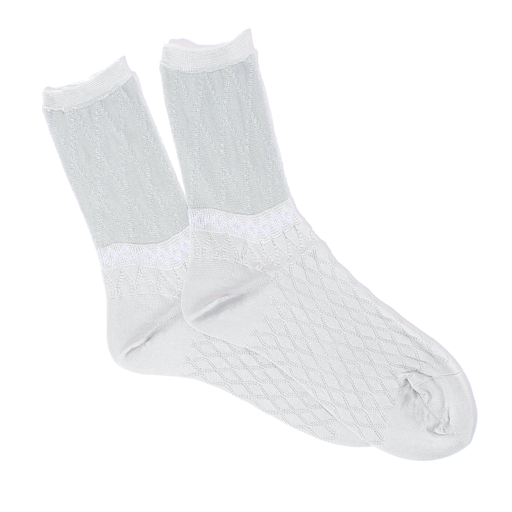 The upper part of the sock is made of sparkling ultra-fine lame thread and organdy fabric, which are double woven with a diamond pattern to create a sheer fabric.