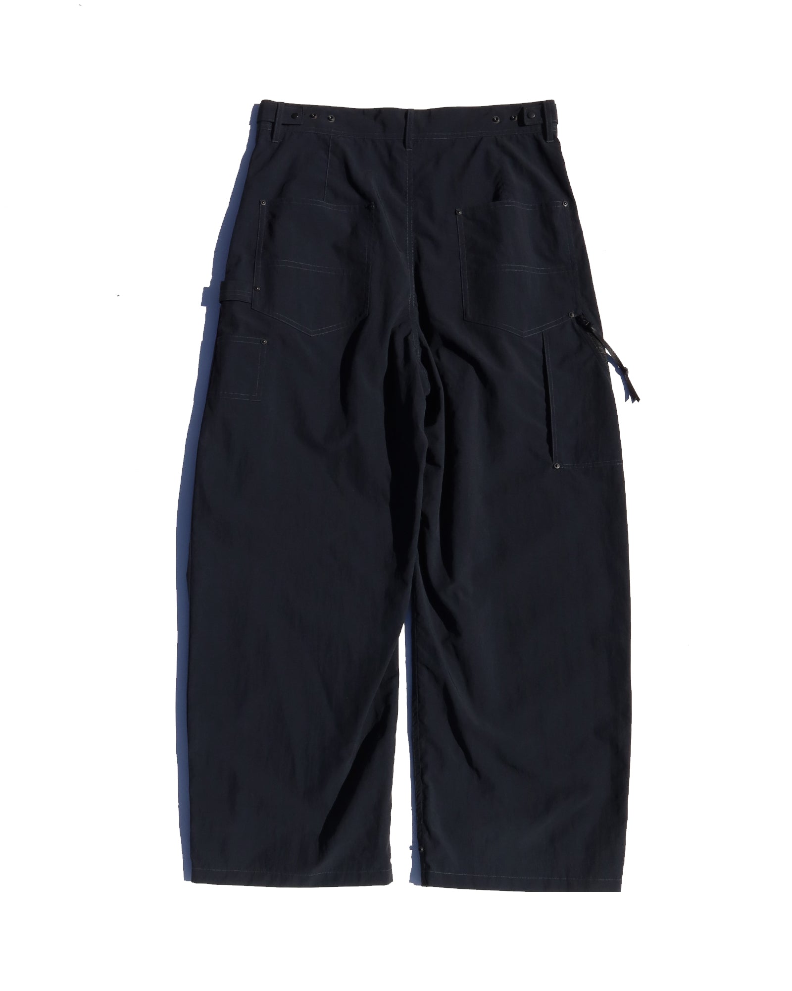 These high-waisted trousers feature a wide silhouette with structured volume at the knees for ease of motion. A single front pleat and adjustable hem snaps allow for a customizable look and fit.