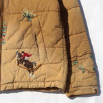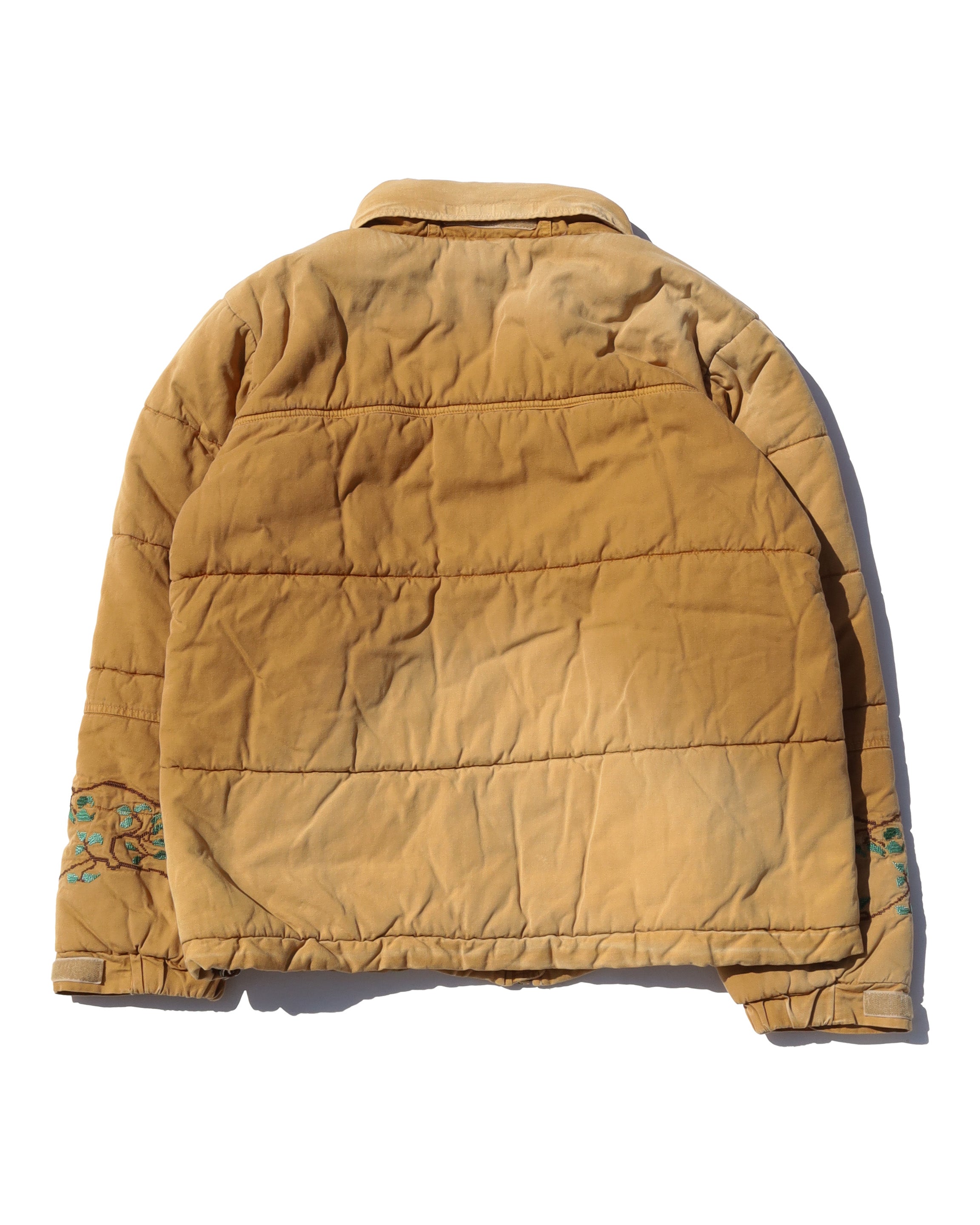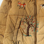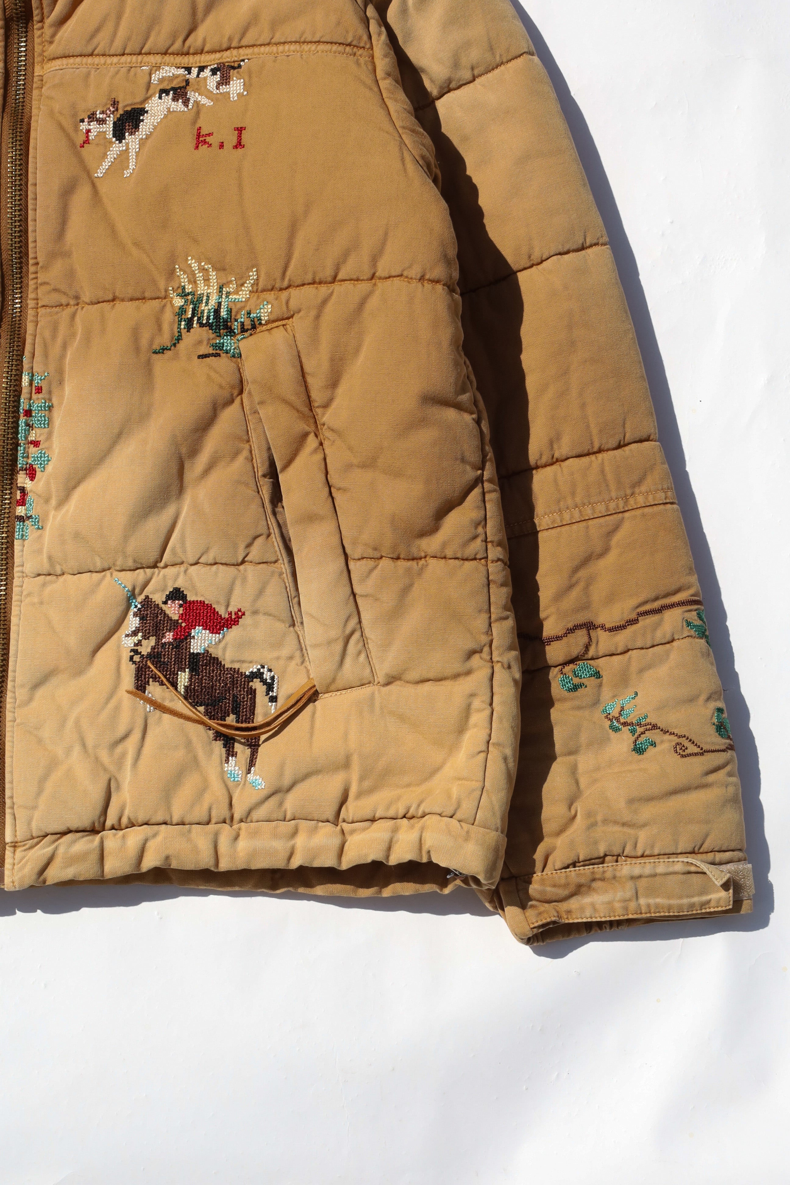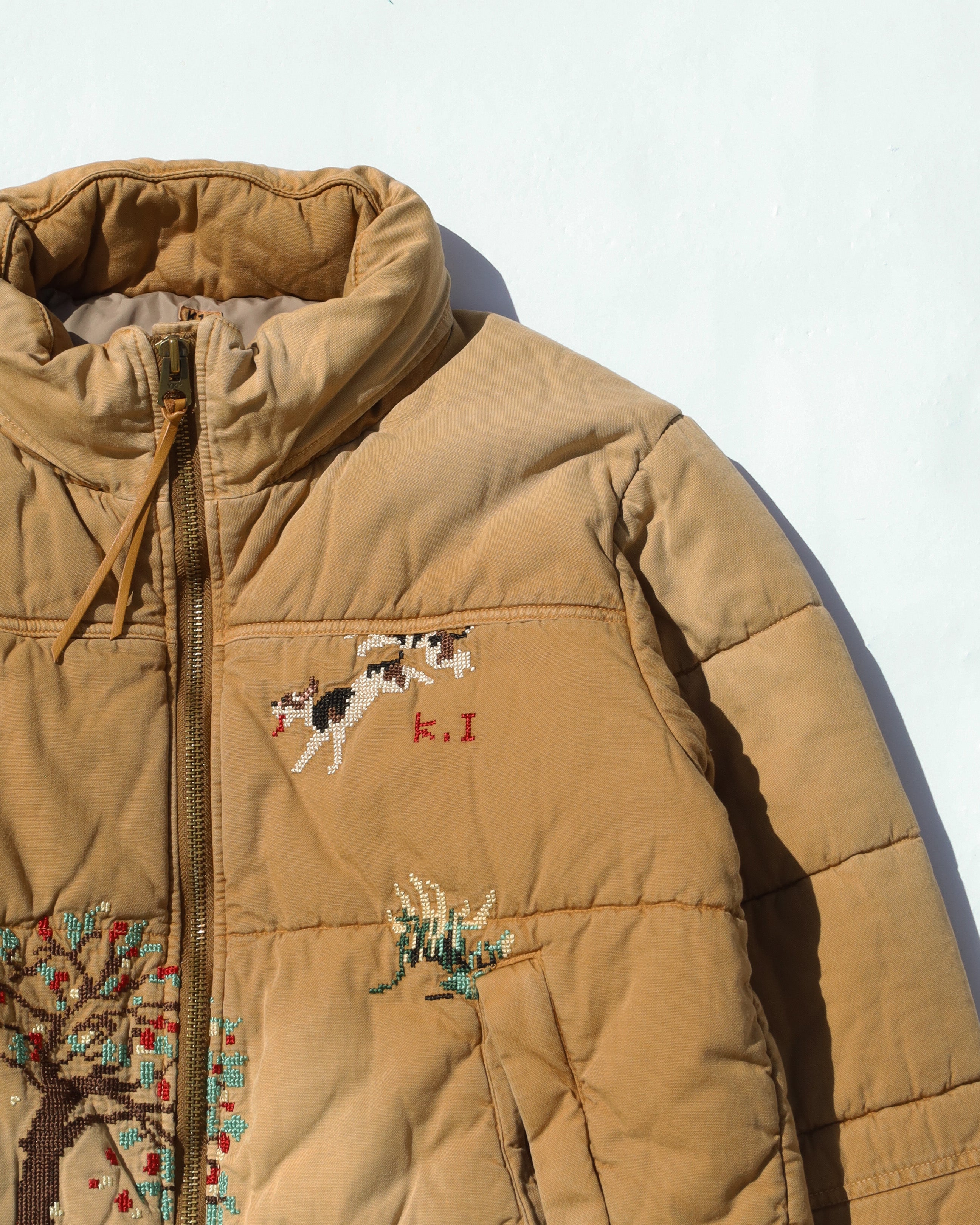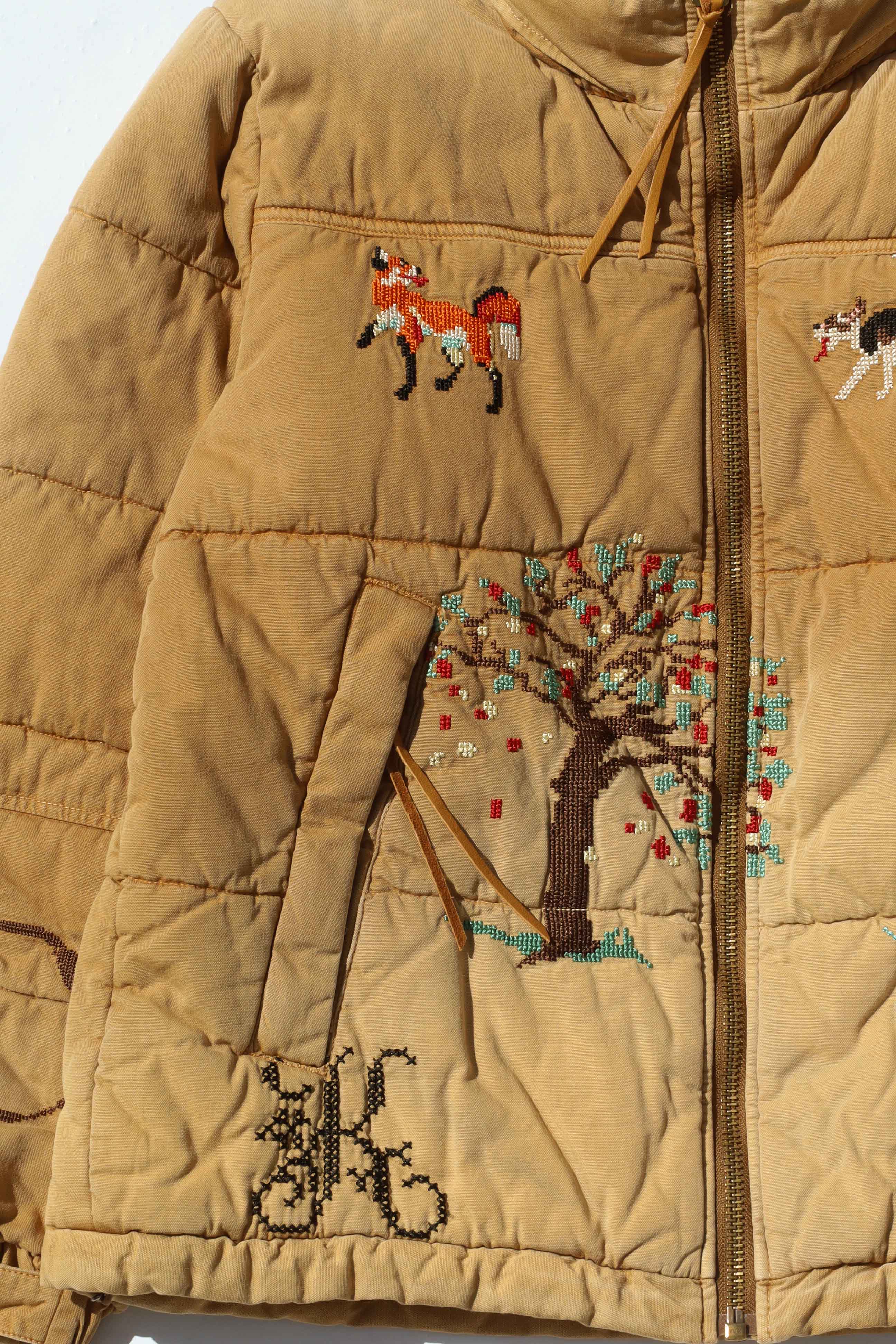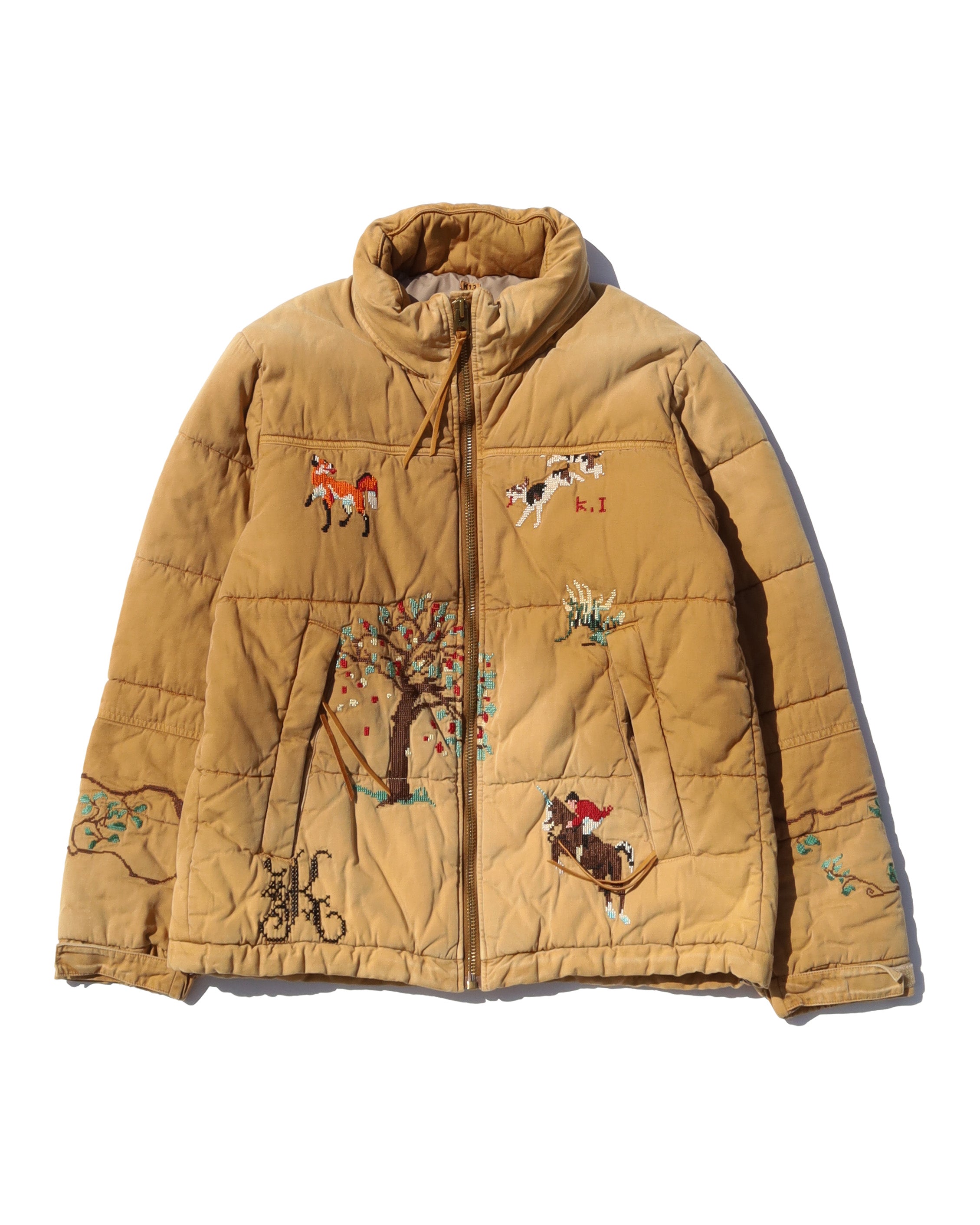 The Embroidery Puffer Jacket is a unique take on classic outerwear, blending warmth and heritage detail. Crafted from 100% cotton in a soft beige tone, the jacket features an embroidered motif inspired by traditional British fox hunting scenes. Each piece is finished by hand with a vintage wash, giving it rich depth and one-of-a-kind character. A signature winter style from KHOKI, built with both artistry and comfort in mind.
