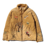 - A beautifully nostalgic puffer jacket with artistic embroidery and vintage charm