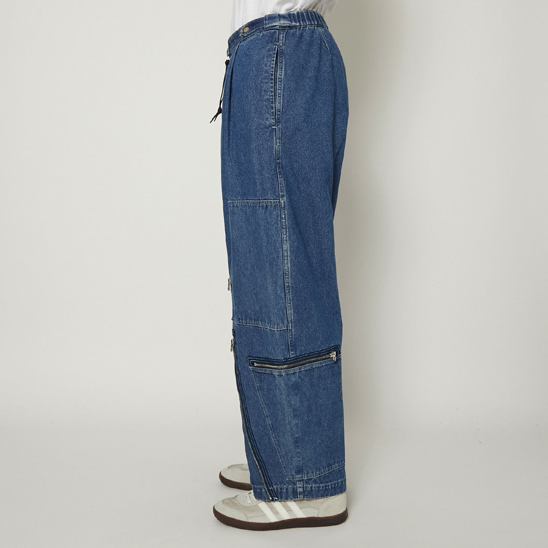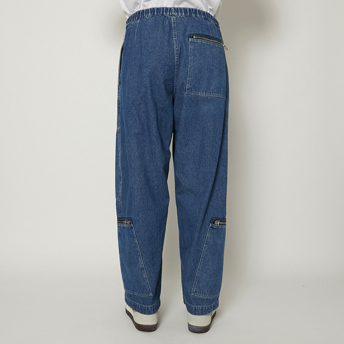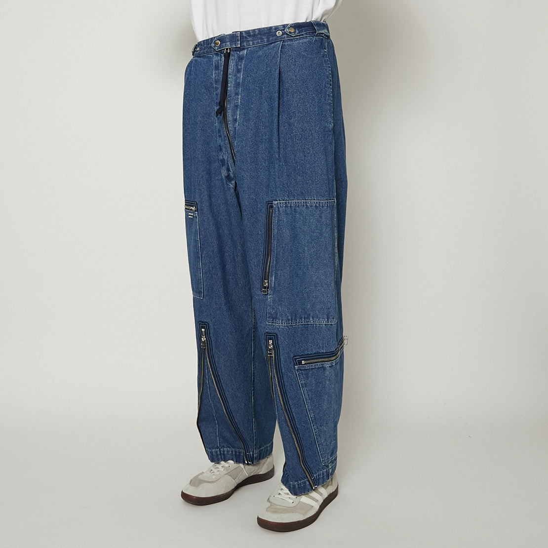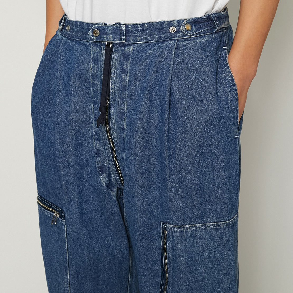 These pants combine the classic texture of 1980s vintage denim with modern design, featuring denim from the 1980s and raw denim from Okayama. The waist design allows for easy size adjustment, and the functional zipper at the hem offers versatility in silhouette, providing a comfortable fit with a wide-leg style.