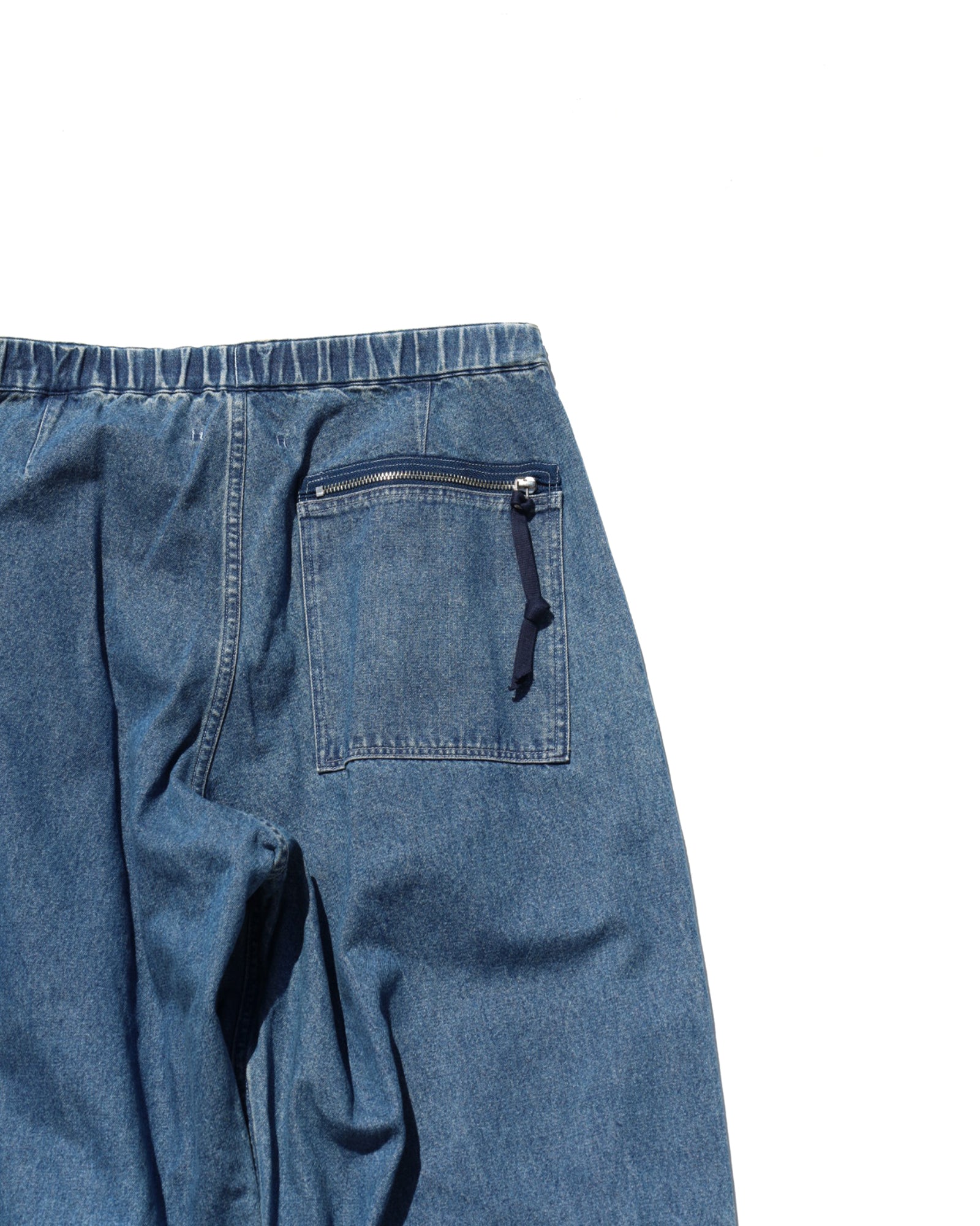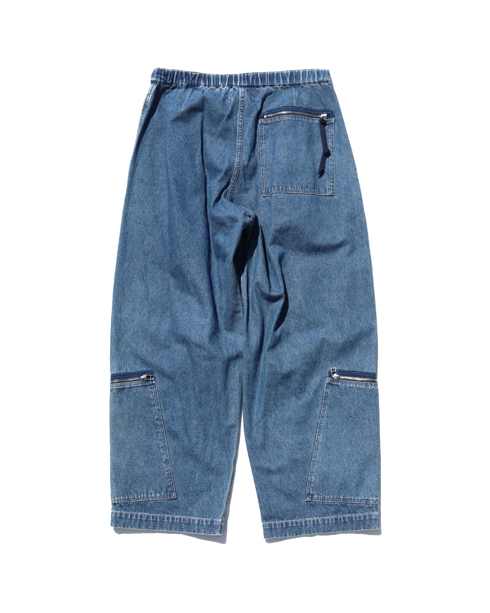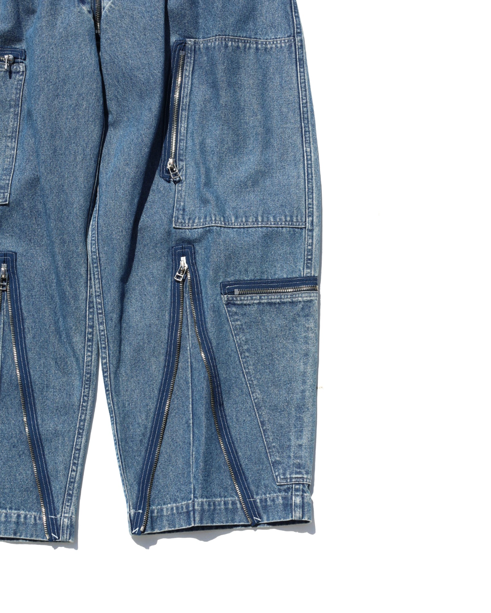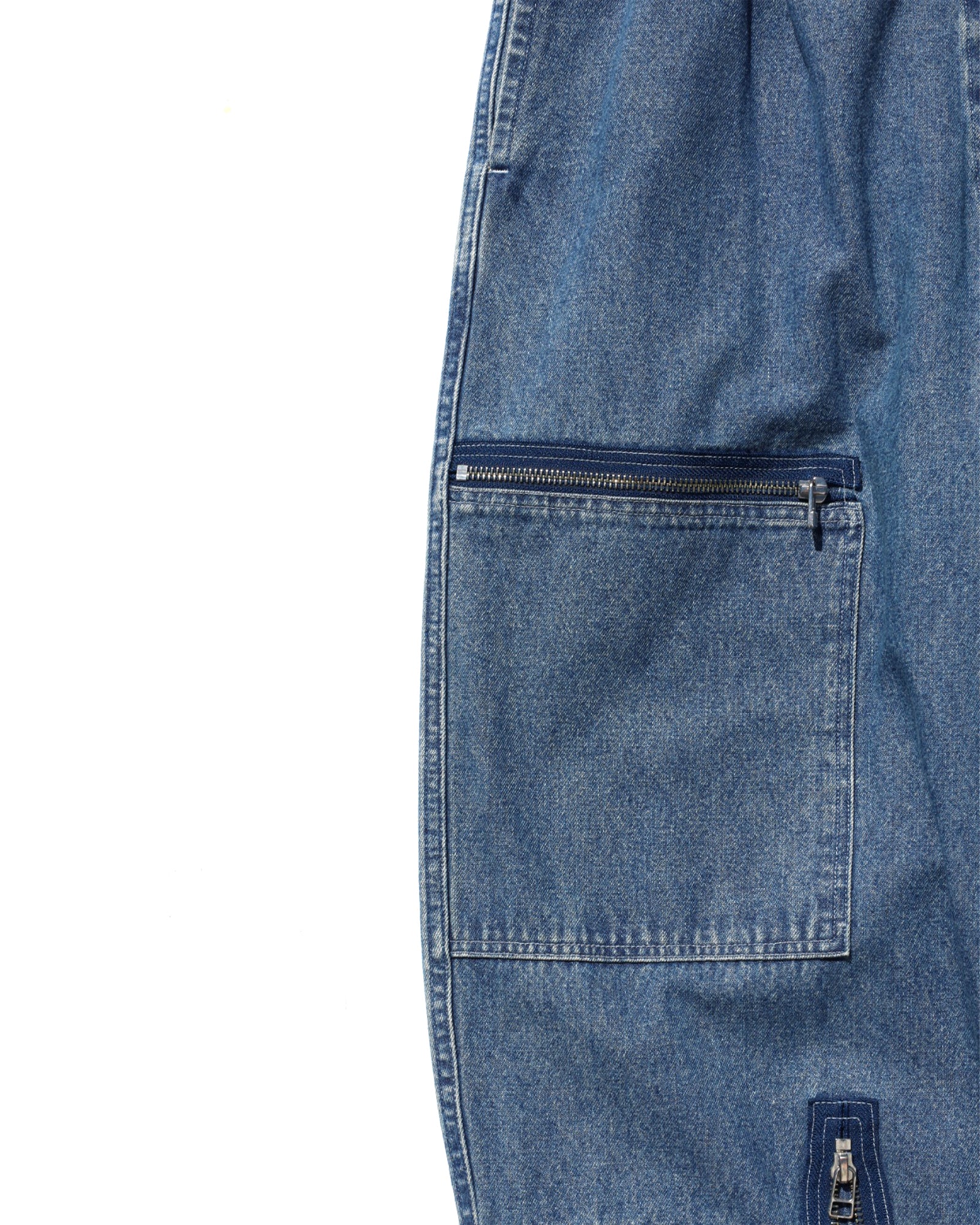 These pants combine the classic texture of 1980s vintage denim with modern design, featuring denim from the 1980s and raw denim from Okayama. The waist design allows for easy size adjustment, and the functional zipper at the hem offers versatility in silhouette, providing a comfortable fit with a wide-leg style.