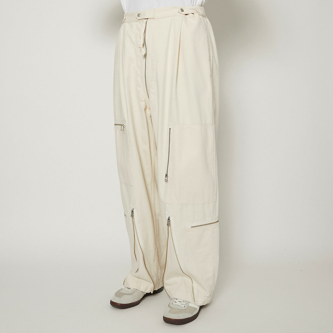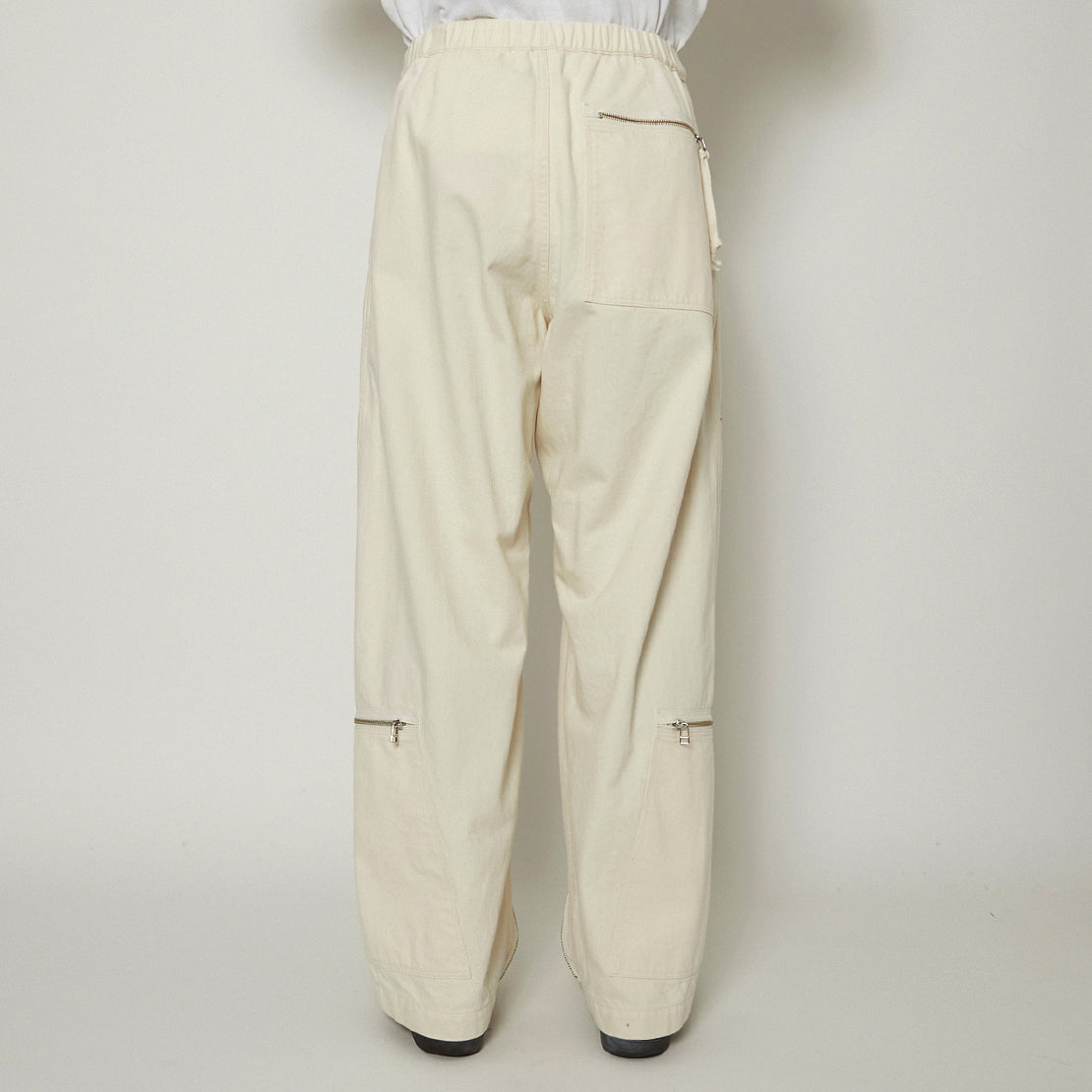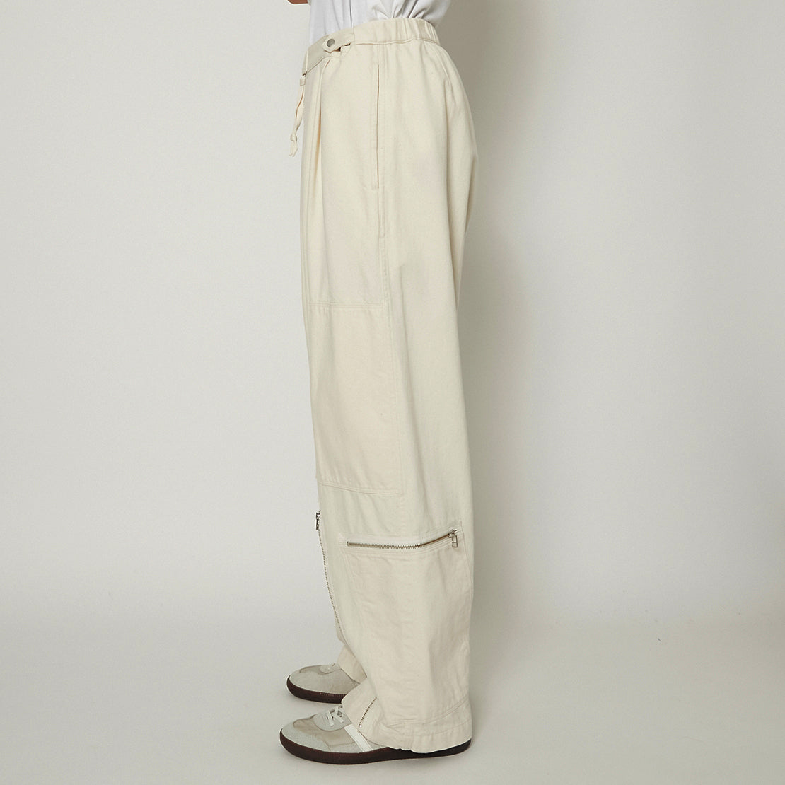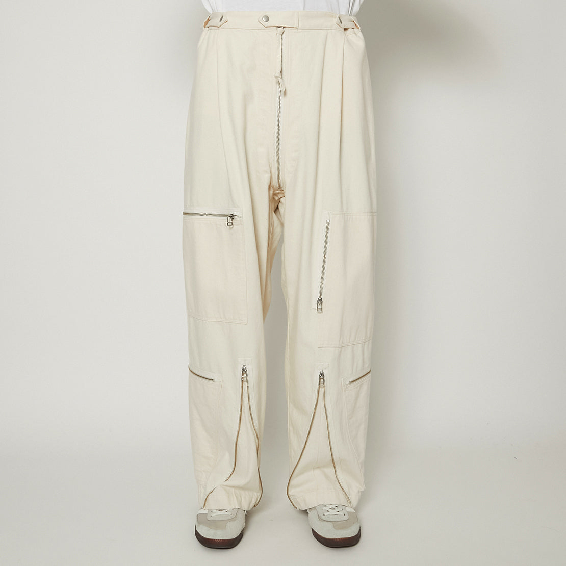 These pants combine the classic texture of 1980s vintage denim with modern design, featuring denim from the 1980s and raw denim from Okayama. The waist design allows for easy size adjustment, and the functional zipper at the hem offers versatility in silhouette, providing a comfortable fit with a wide-leg style.