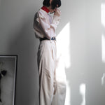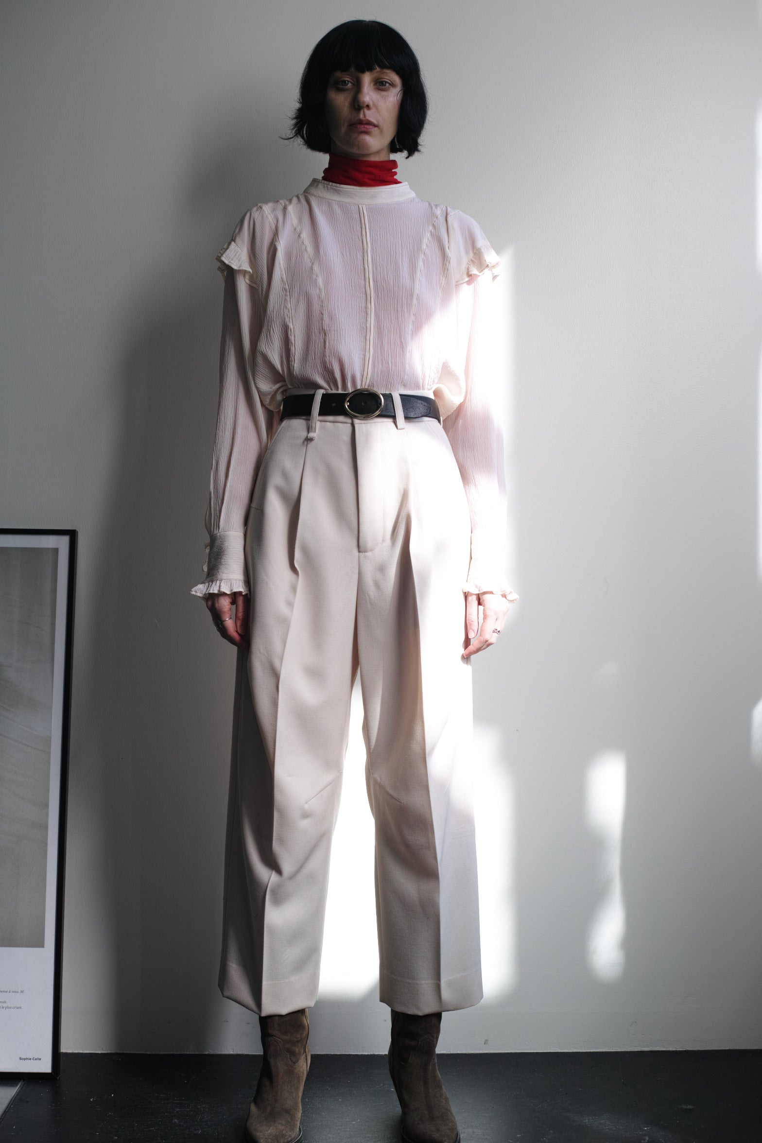 A 100% silk top made with a single-layer construction. The use of crape de Chine fabric, treated with a garment wash, creates a textured appearance. The unique lightness and softness of silk, combined with a beautiful drape, enhance the silhouette.