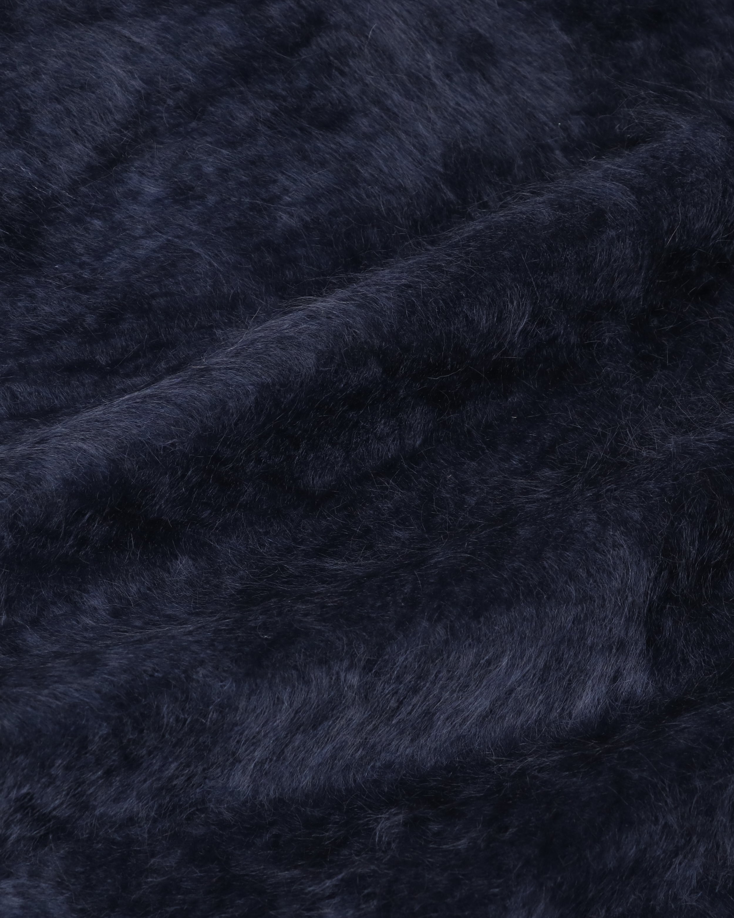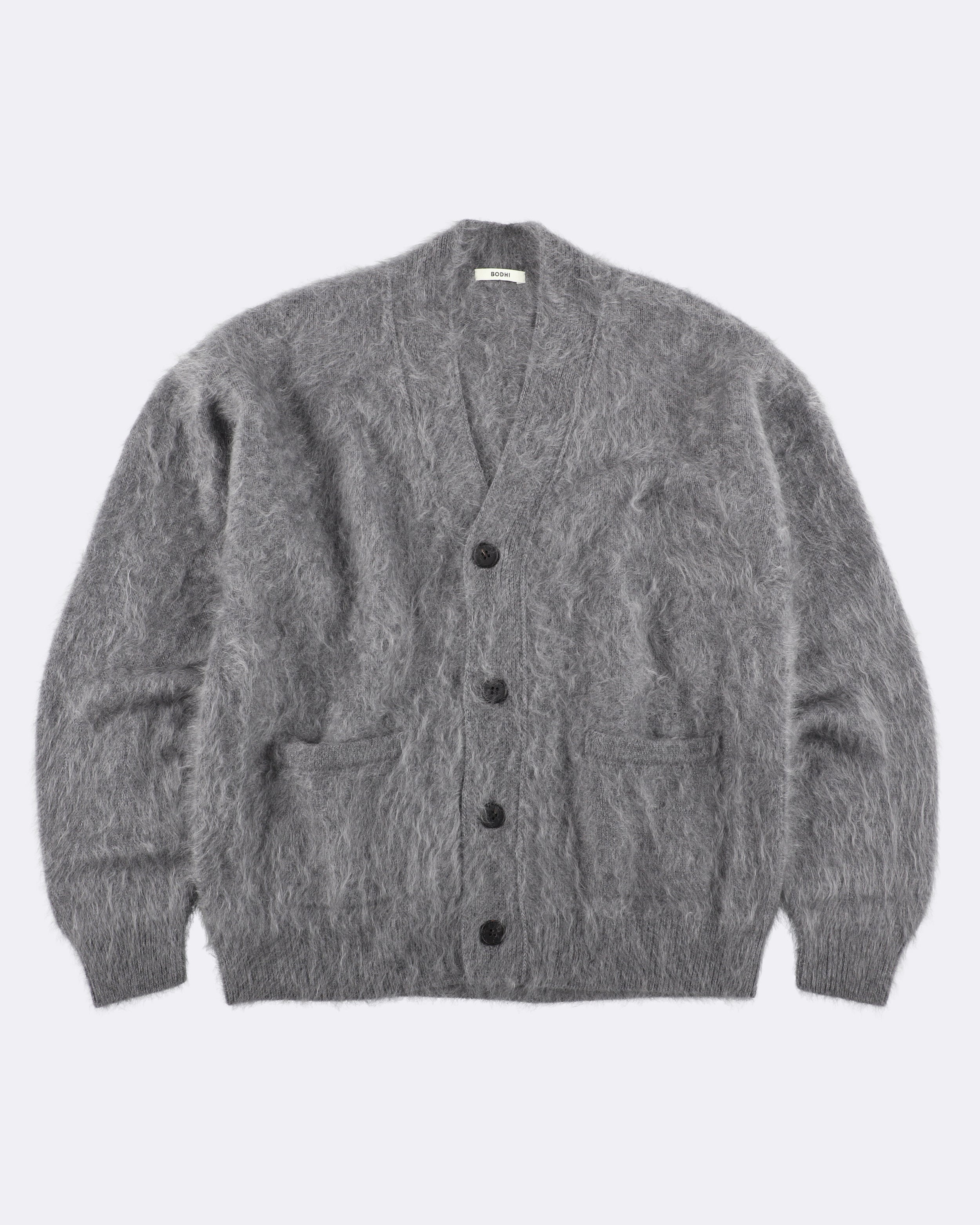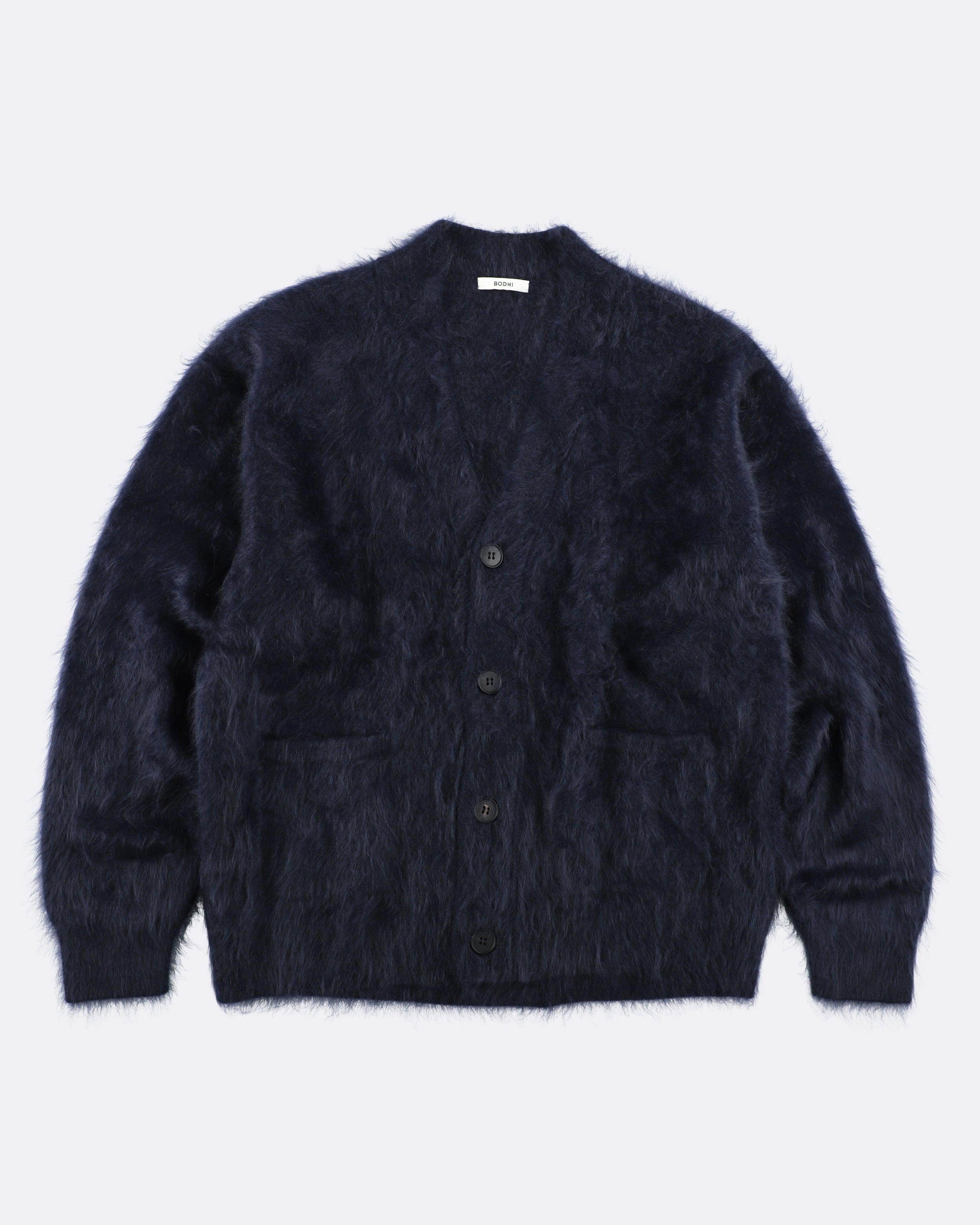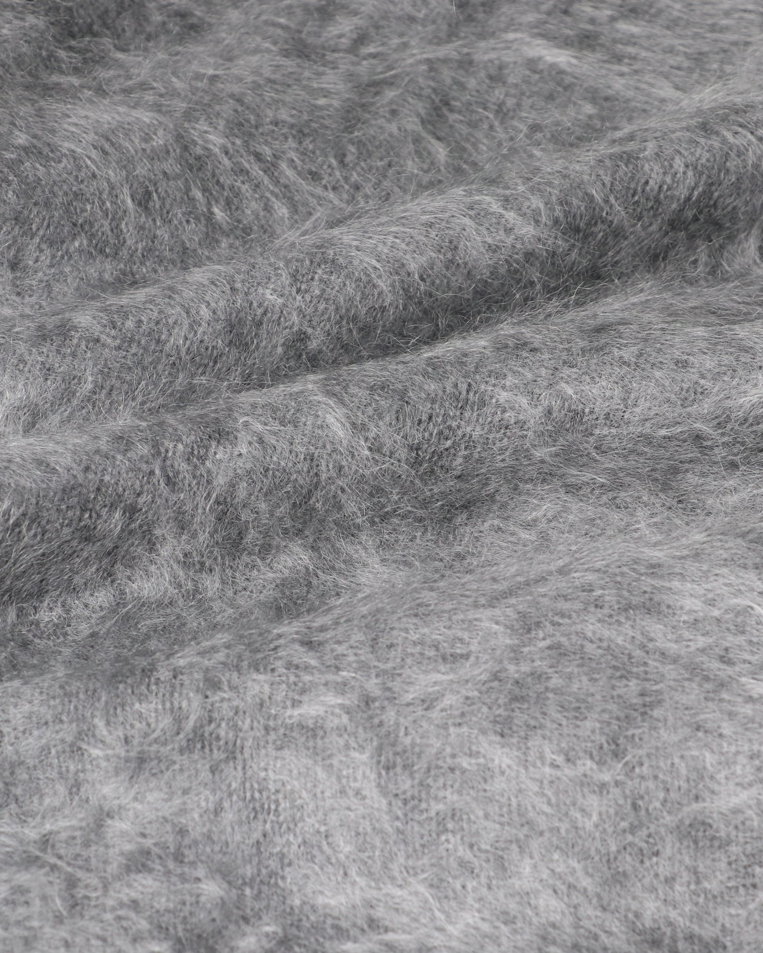 A cardigan made of 100% cashmere, processed to achieve a mohair-like texture. Featuring a classic box silhouette with wide, non-restrictive ribbing and slit pockets for both practicality and a touch of accent. The high-quality finish ensures no shedding, even with regular wear.