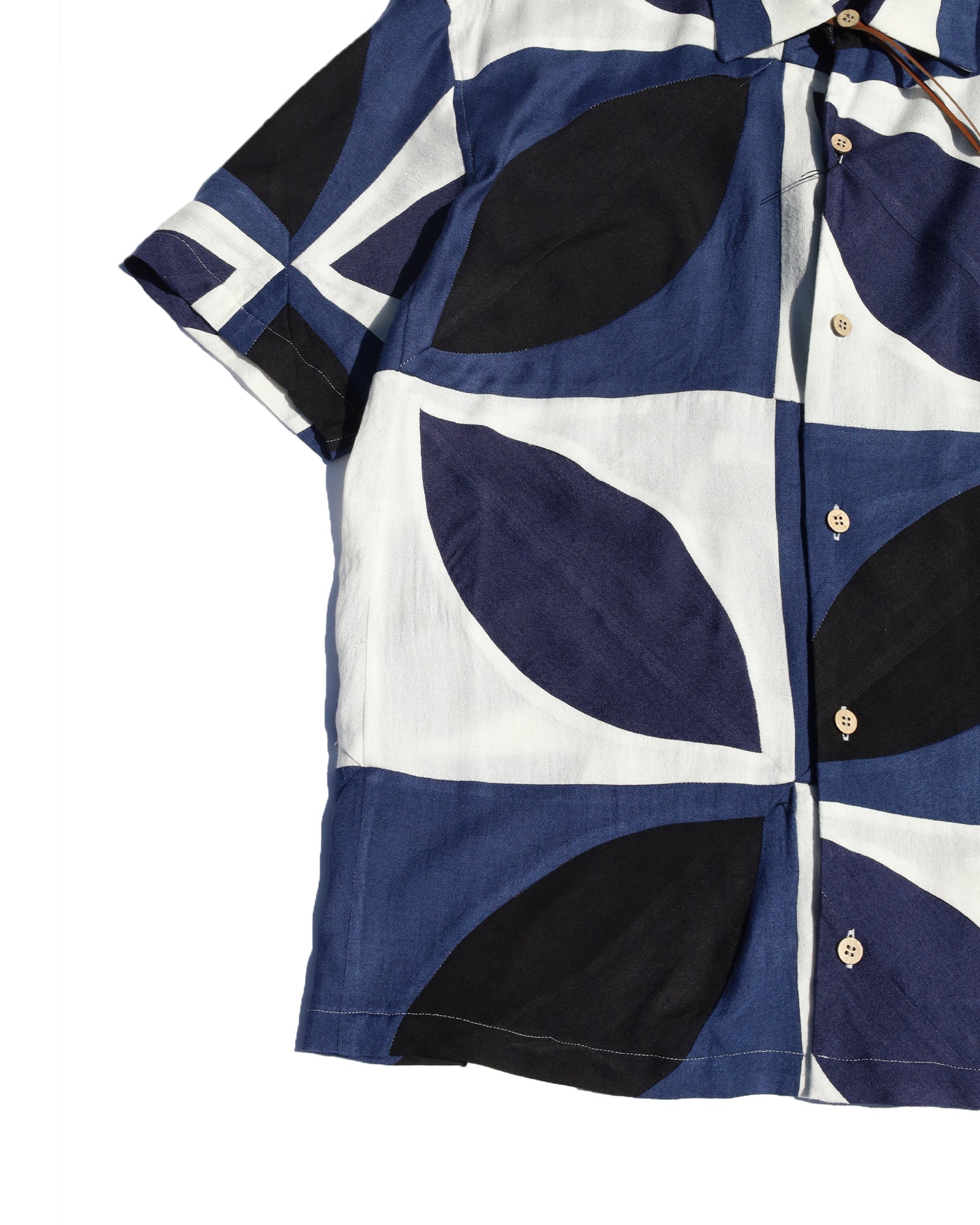 This signature patchwork shirt from KHOKI draws inspiration from American quilt patterns. The collar features an adjustable leather string, allowing it to be styled as both an open collar and a regular collar—perfect for varied styling.