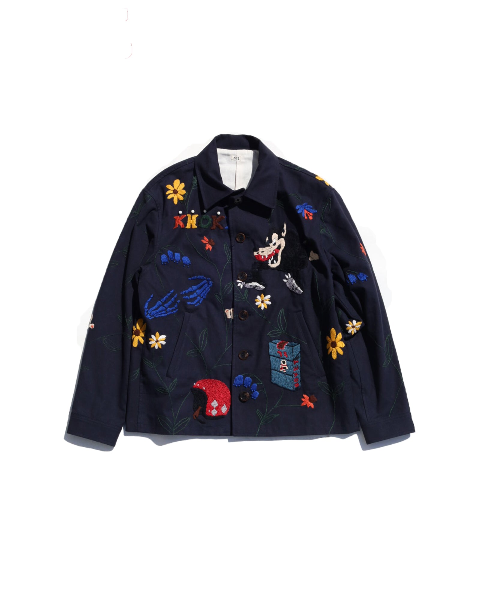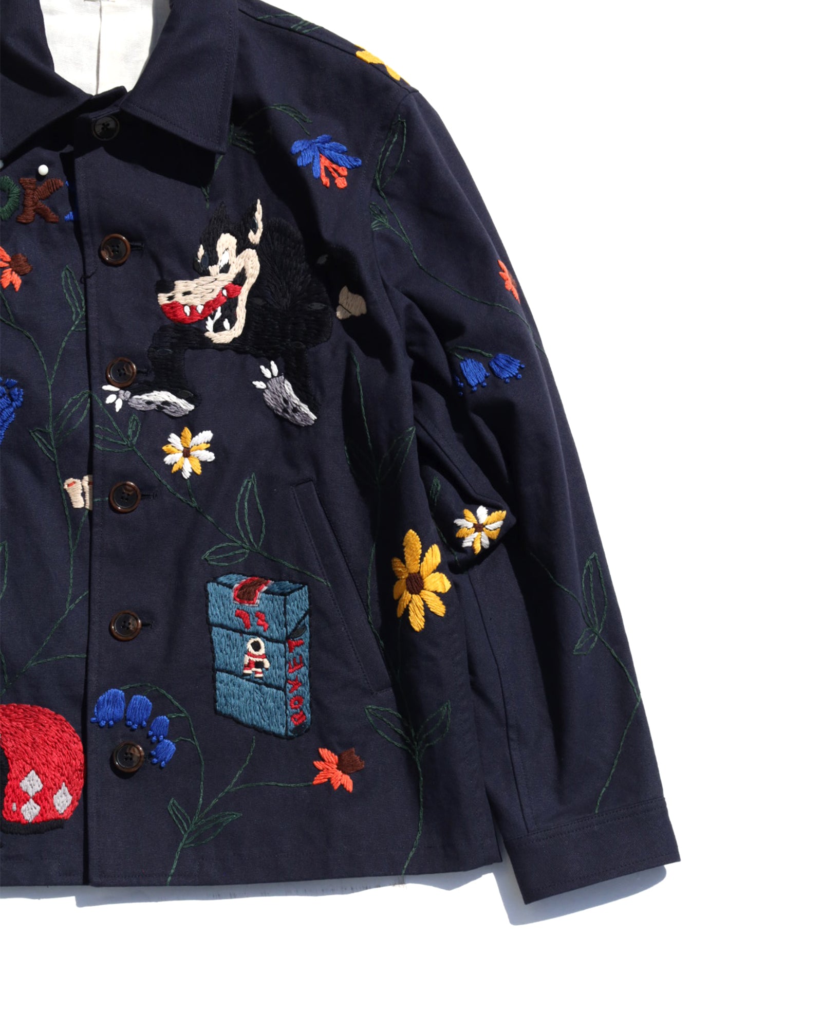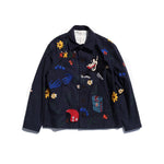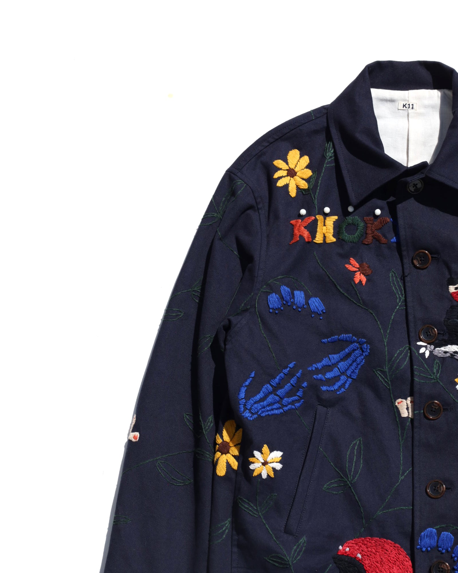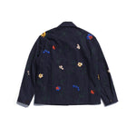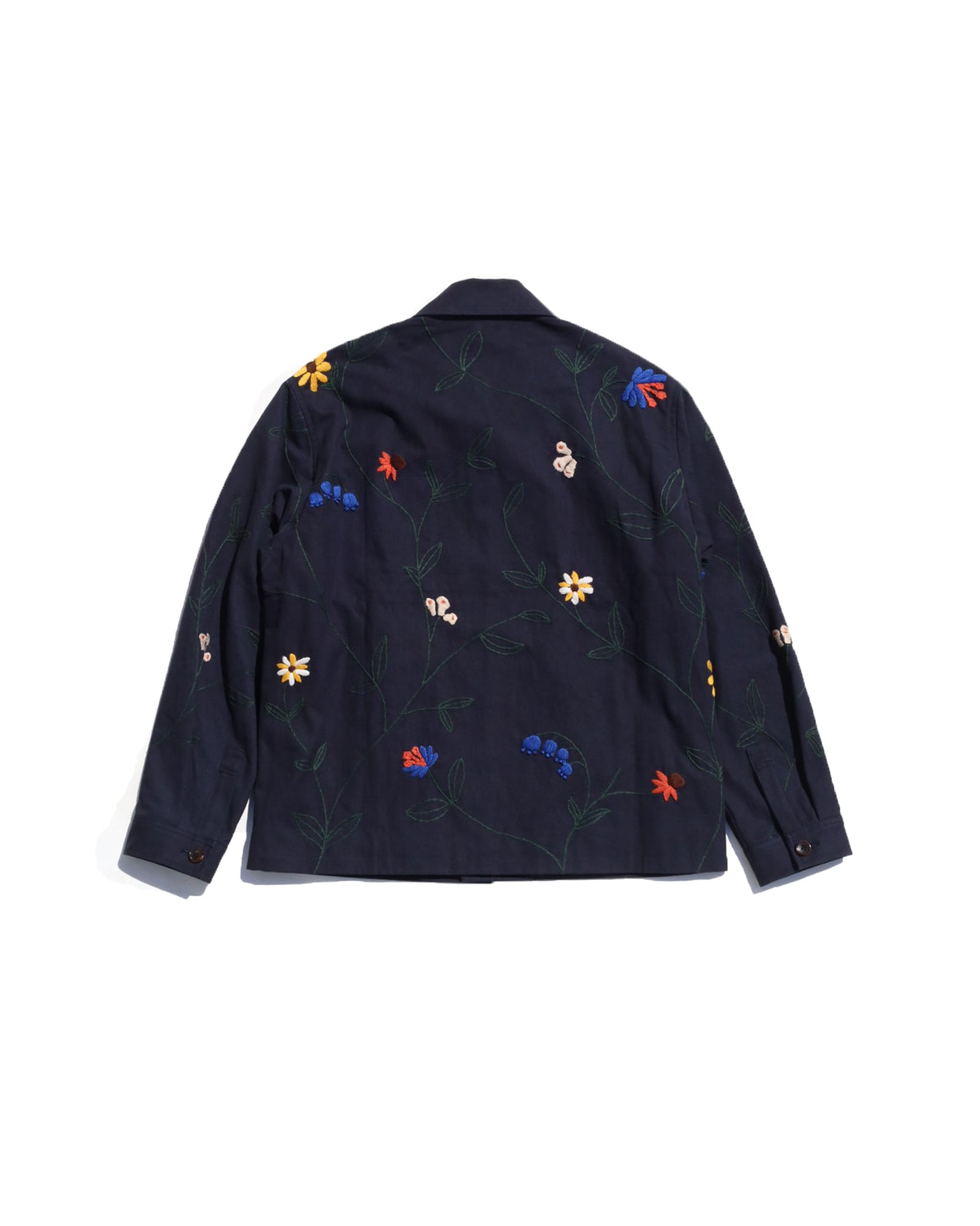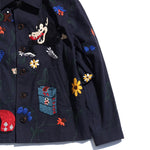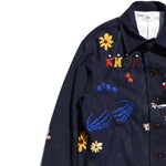 A work jacket with hand embroidery all over.