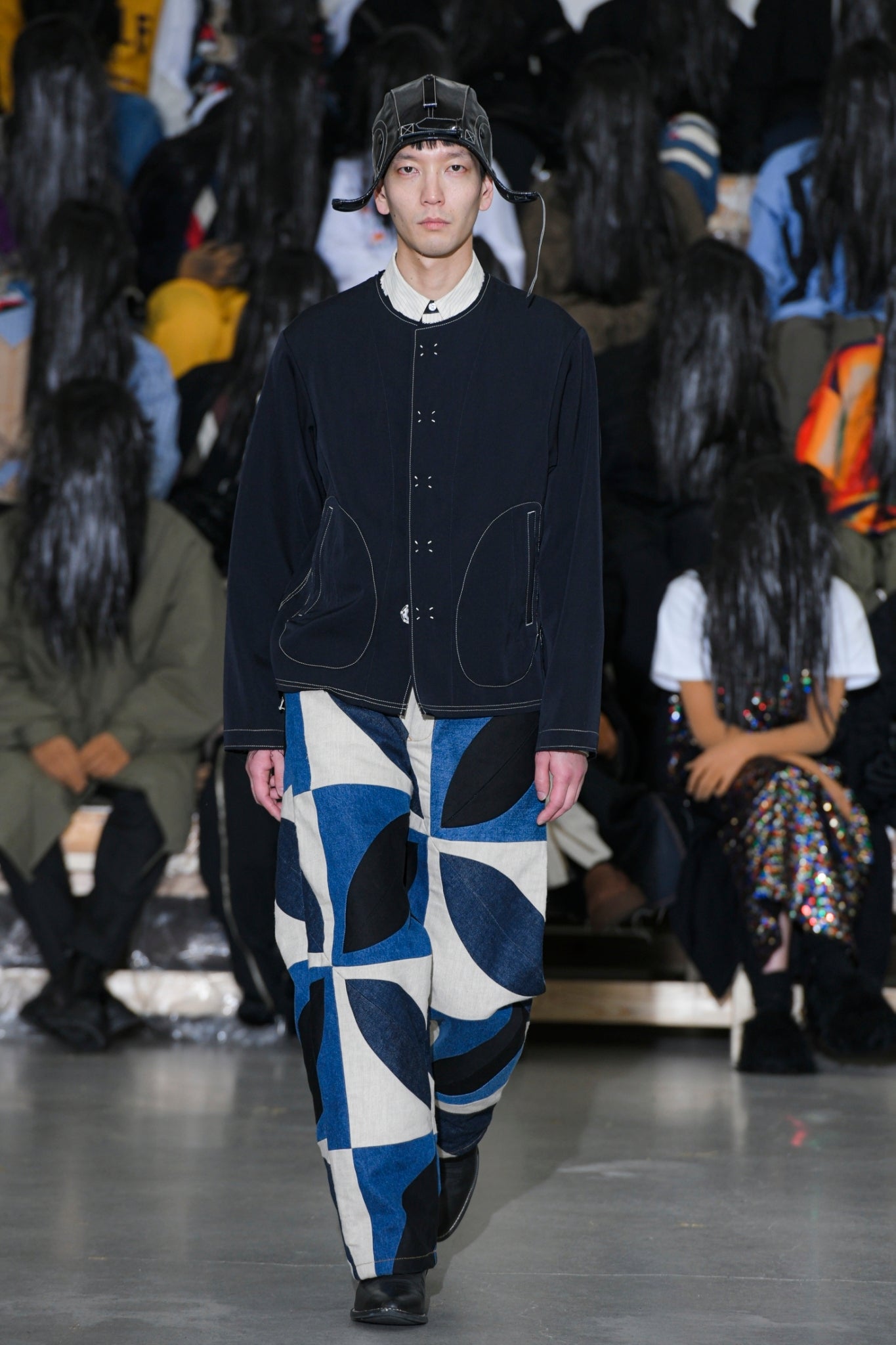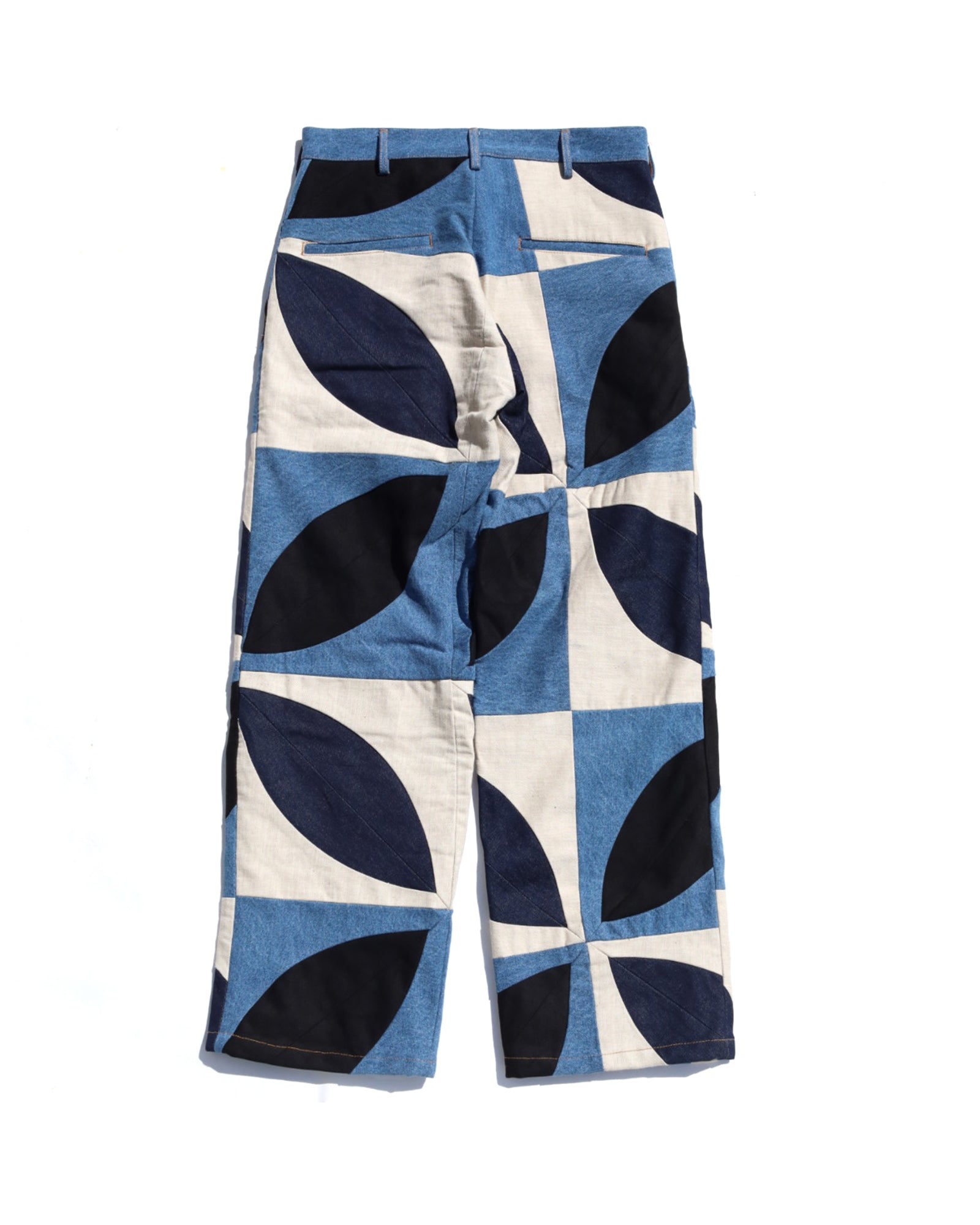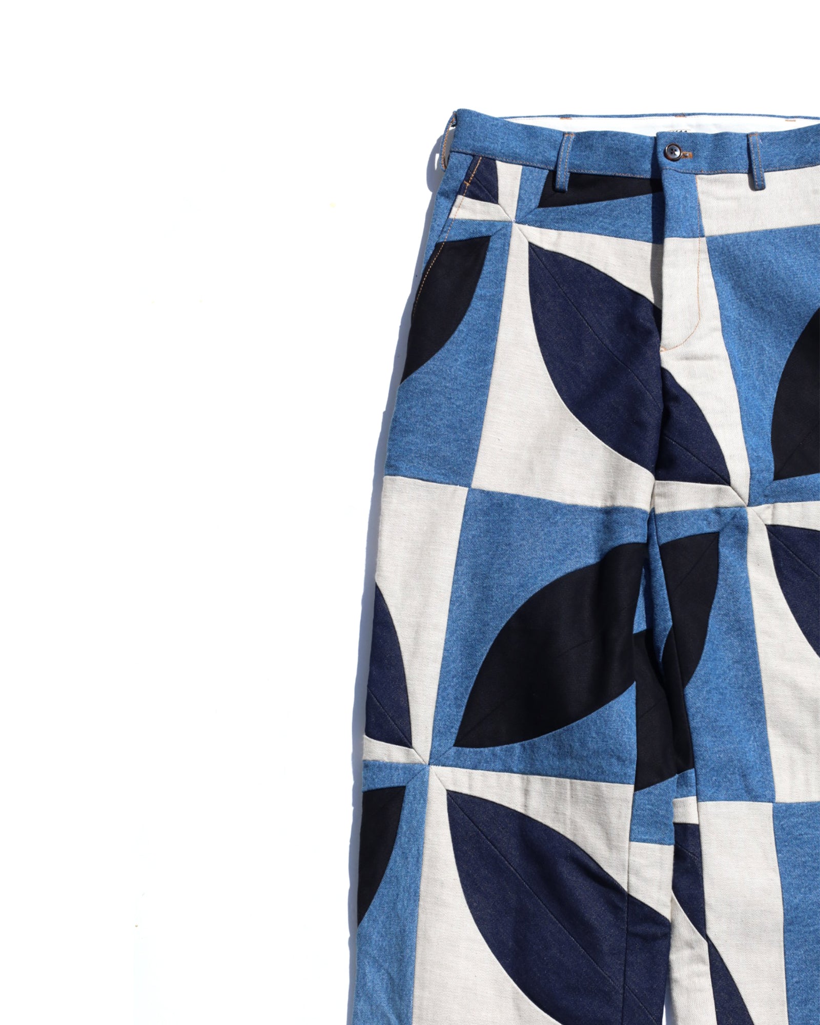 Pants made of a large patchwork of four different denim fabrics. The pattern is based on an expression often used in American quilts around the 1960s.
