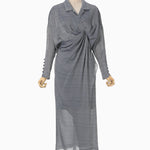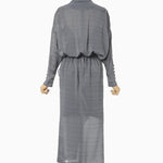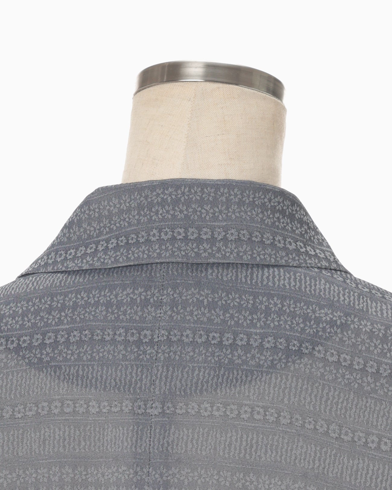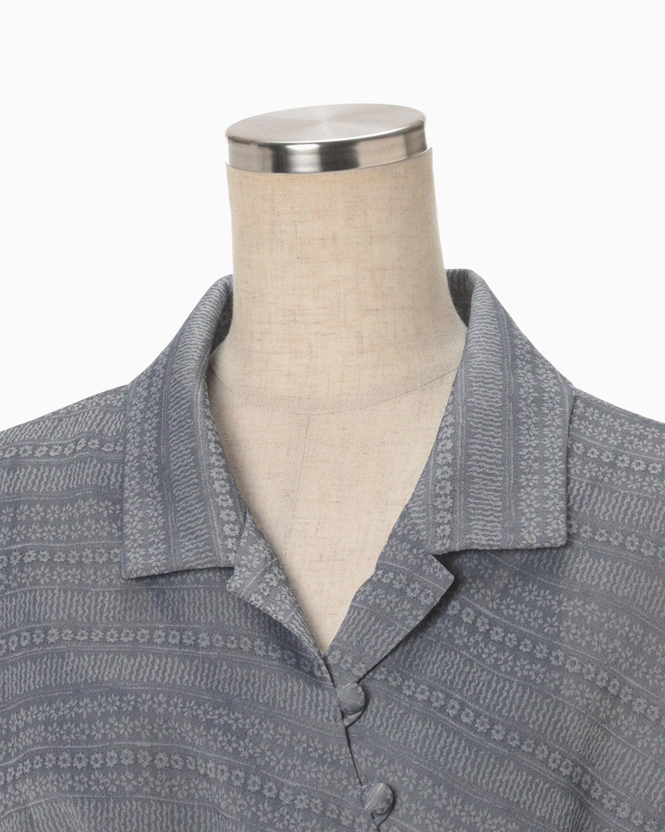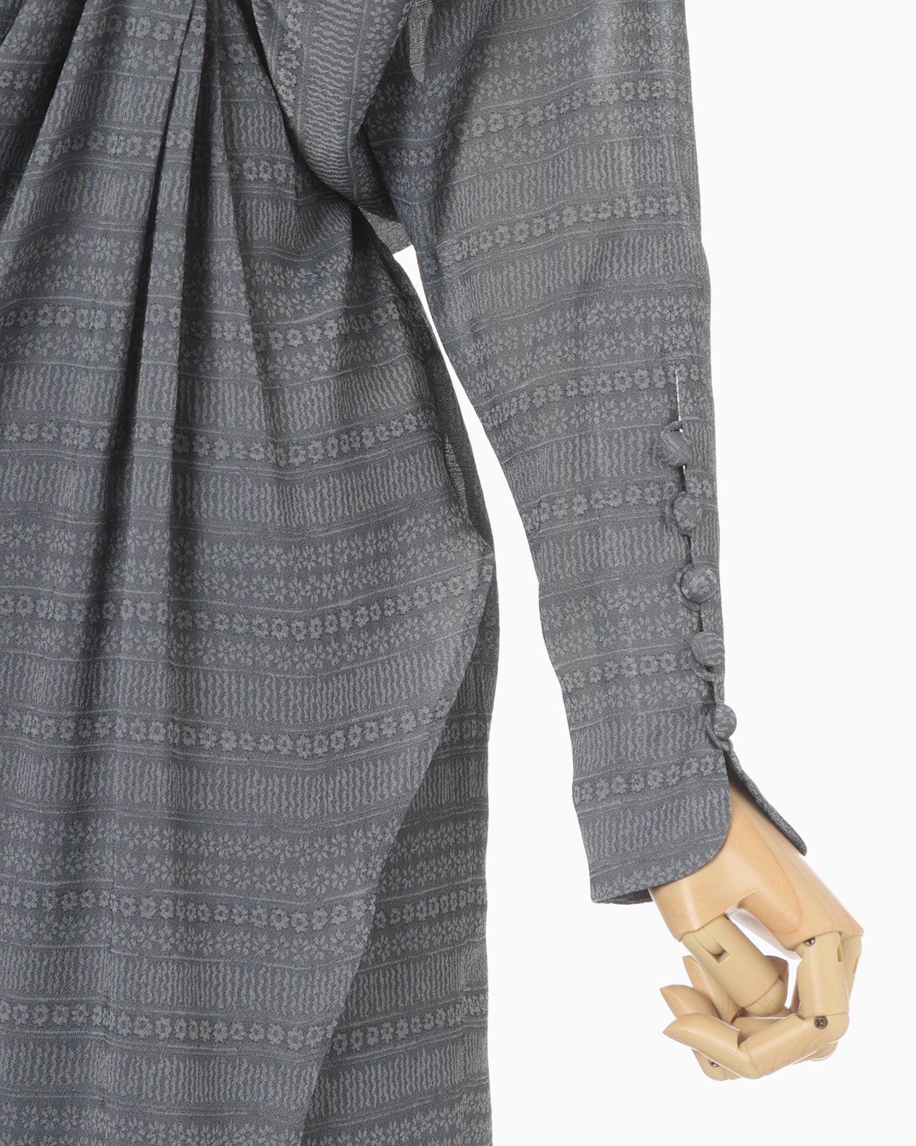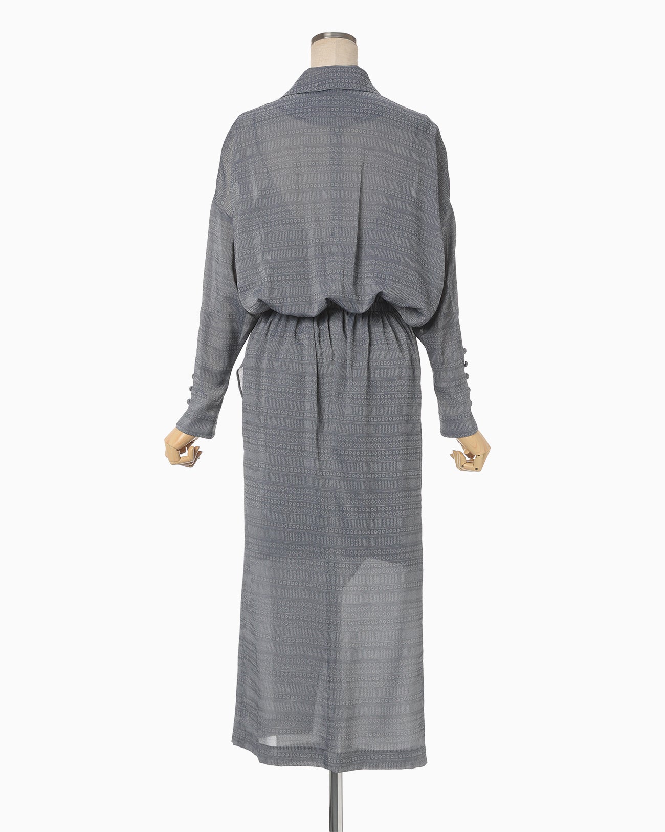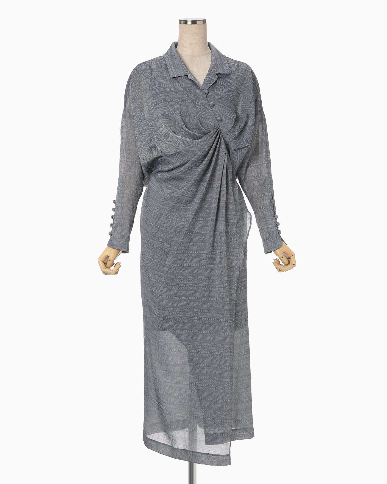 A drape dress featuring Mishima Karatsu floral patterns expressed through jacquard weaving. The dress combines an elegant sheer look with a firm material, resulting in an iconic design that stands out. With a refreshing texture and smooth movement, it suits various occasions. An inner camisole is included, making it easy to pair with simple styles.