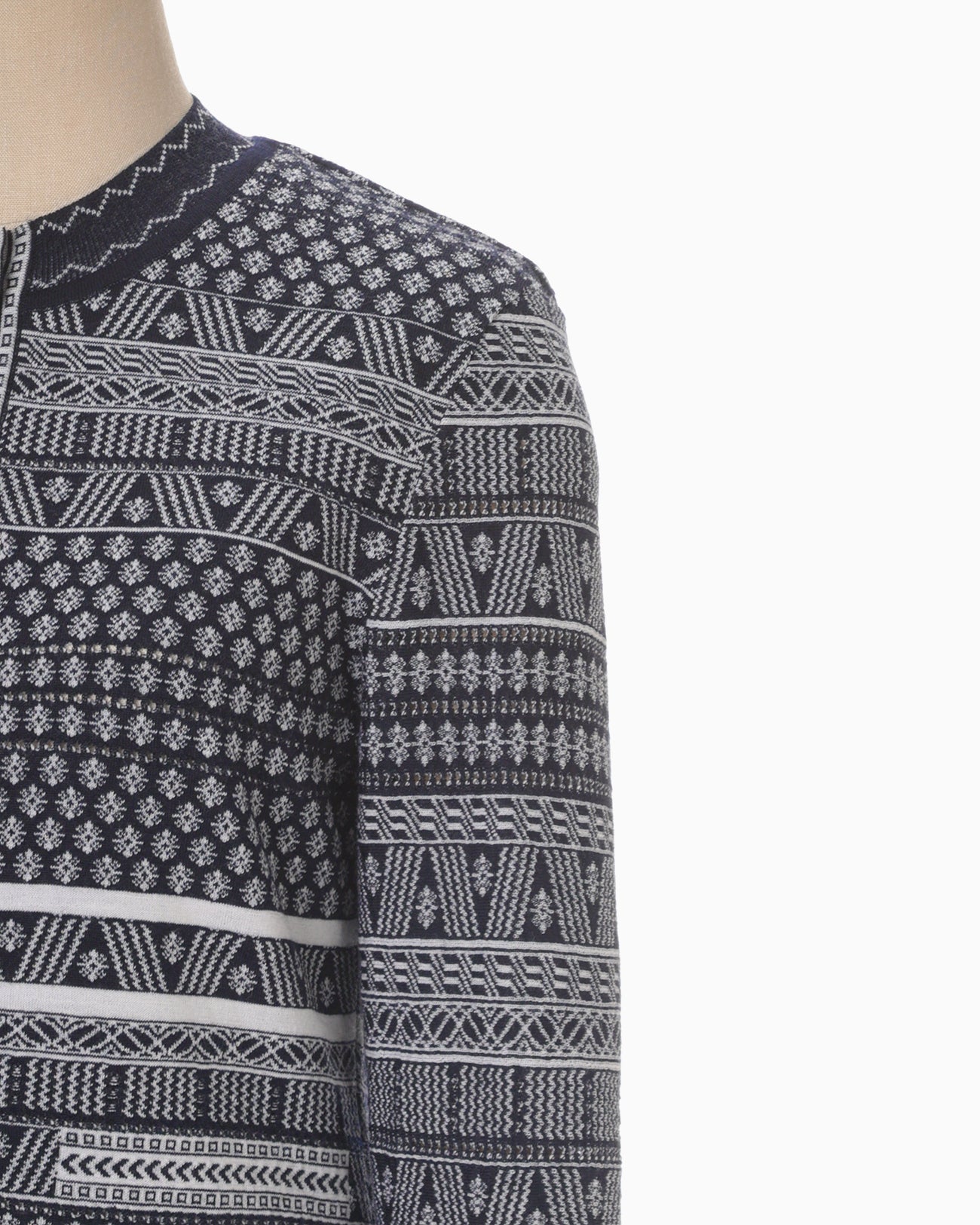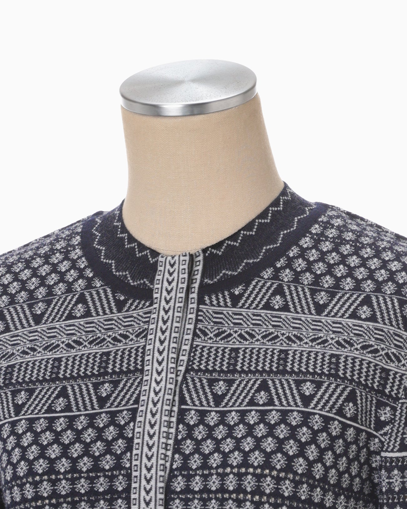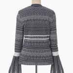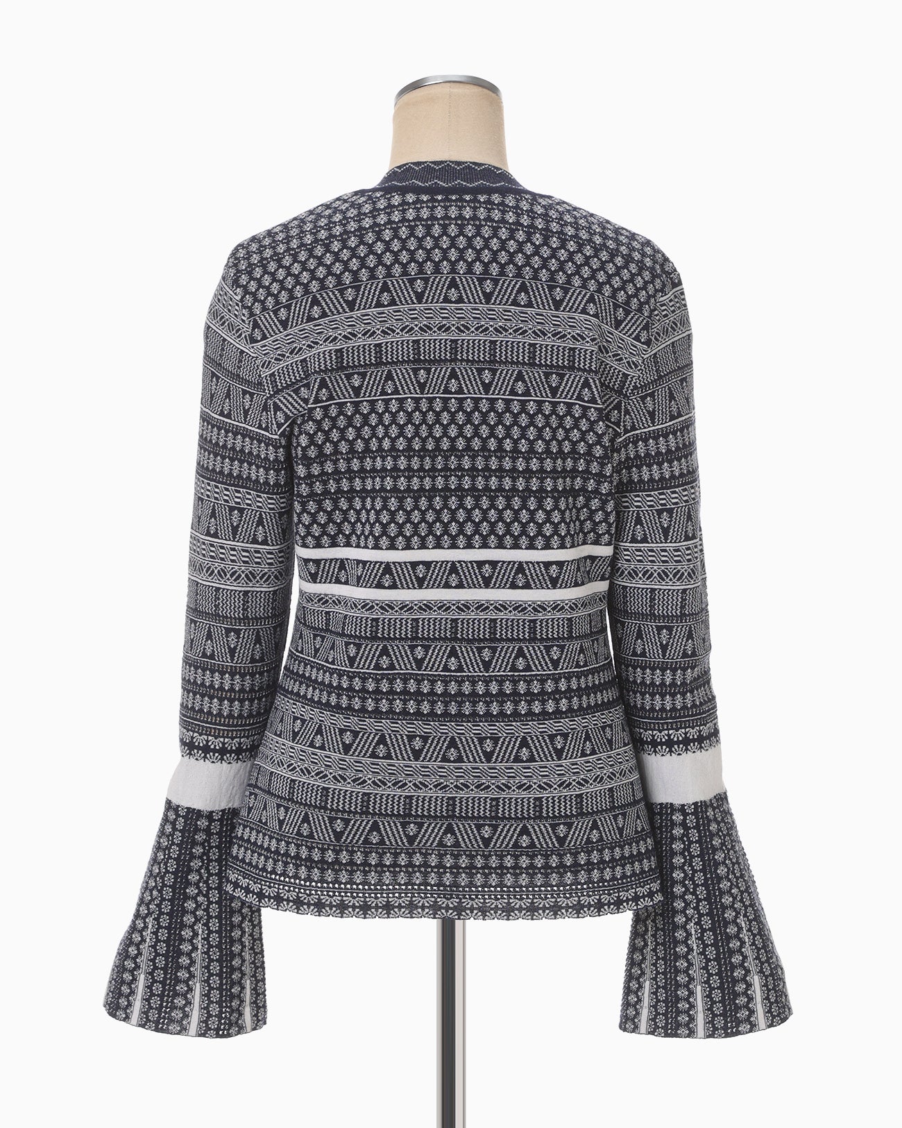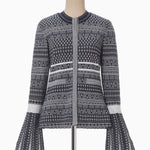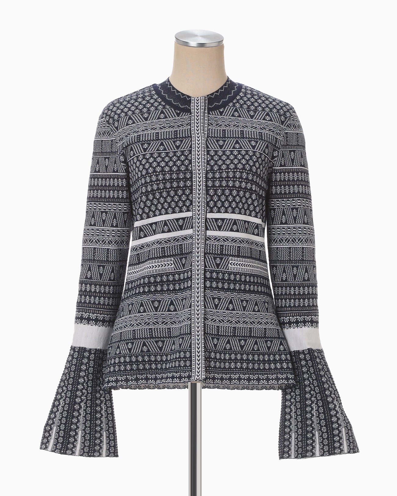 A cardigan featuring Mishima Karatsu-inspired floral patterns expressed in knit. The design captures the delicate lines and surface undulations reminiscent of hand-crafted pottery through various knitting techniques, creating subtle textures and three-dimensional effects. The cardigan is adorned with small floral motifs throughout, with flared cuffs that add a dramatic touch, making it suitable for a range of styles from casual to elegant.