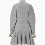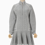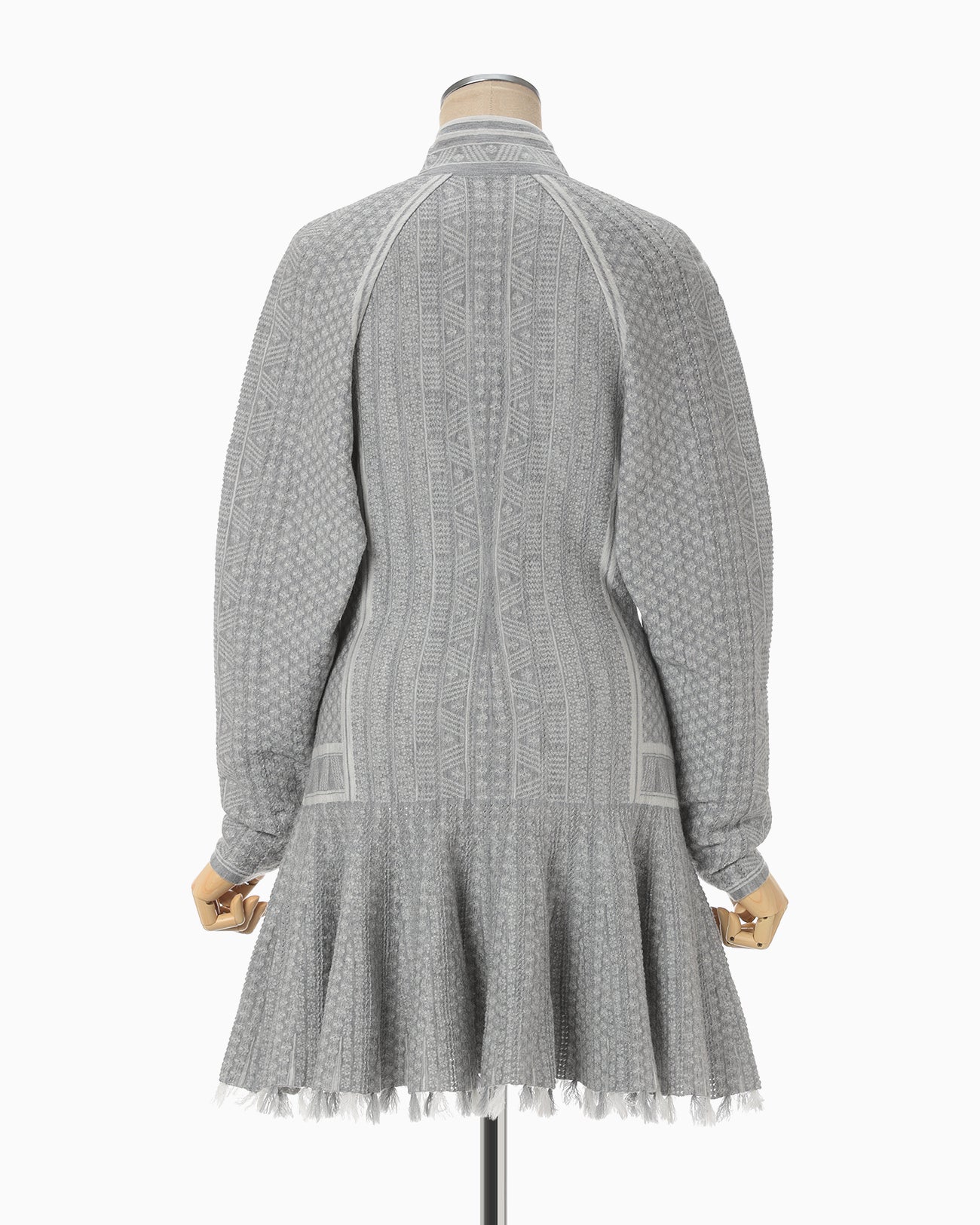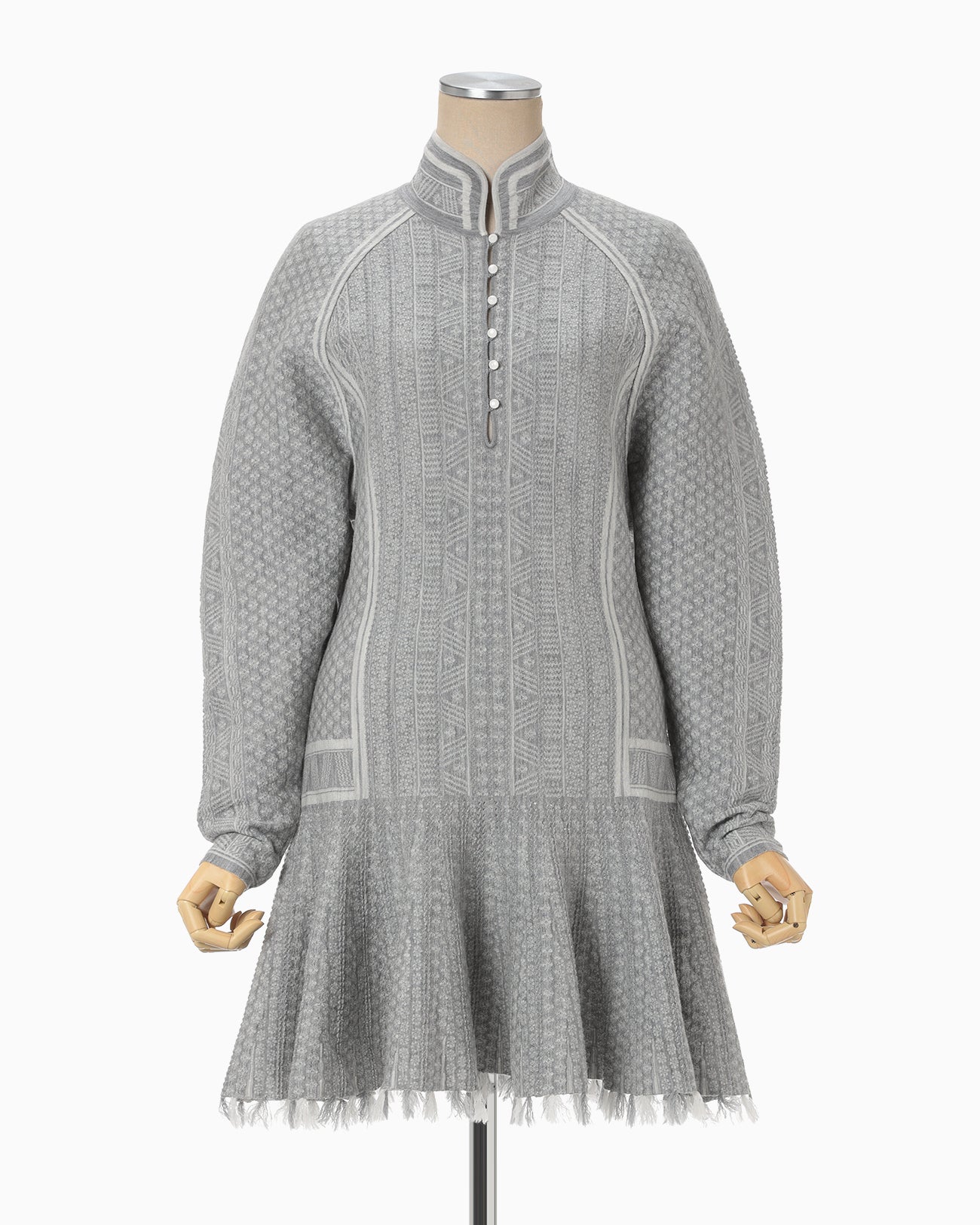 A mini dress featuring Mishima Karatsu-inspired floral patterns expressed in knit. The delicate lines and surface undulations, reminiscent of hand-crafted pottery, are represented through various knitting techniques to create a textured and dimensional design. The dress showcases a compact bodice and a voluminous flared skirt, with small floral motifs spread across the entire fabric. White lines on the bodice enhance the silhouette for a flattering look. The mini-length skirt can also be worn over leggings or bottoms for a tunic-style outfit, making it versatile for both casual and elegant occasions.