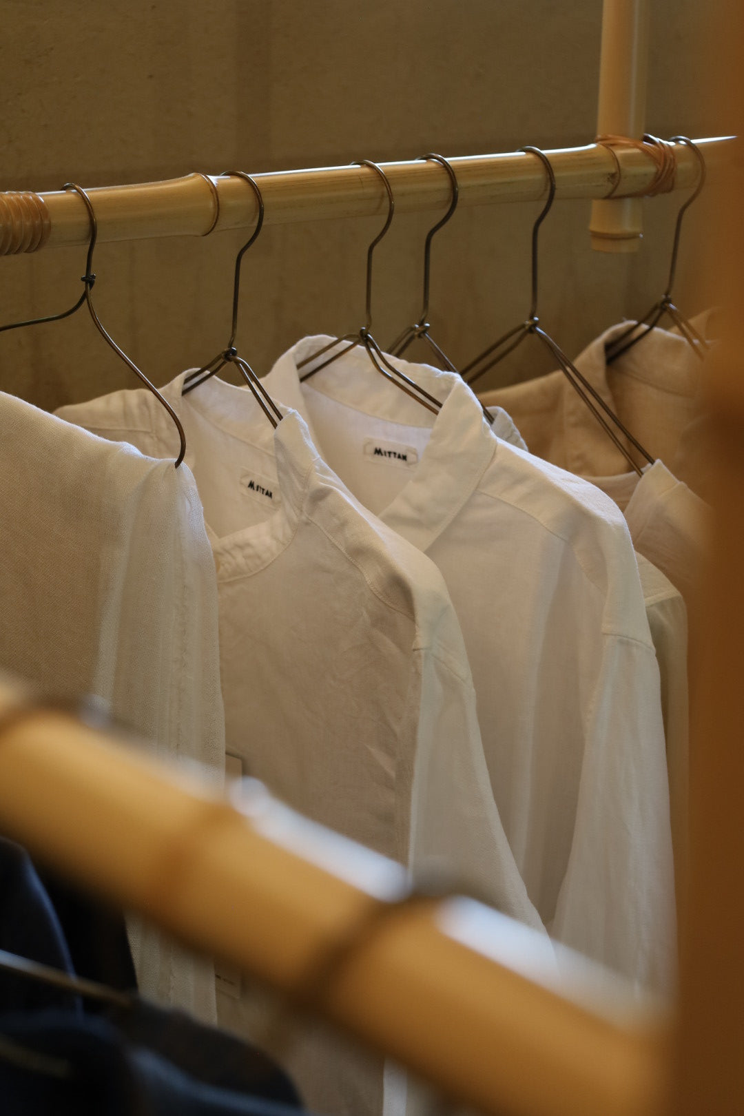 This wide-fit shirt is crafted from a medium-weight hemp fabric with a slightly denser weave than typical hemp textiles. After weaving, the fabric is softened at a finishing facility in Shiga, removing the usual stiffness and giving it the feel of well-worn, long-loved hemp. The result is a naturally draping material with an aged softness, designed for ease, breathability, and timeless versatility.