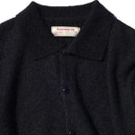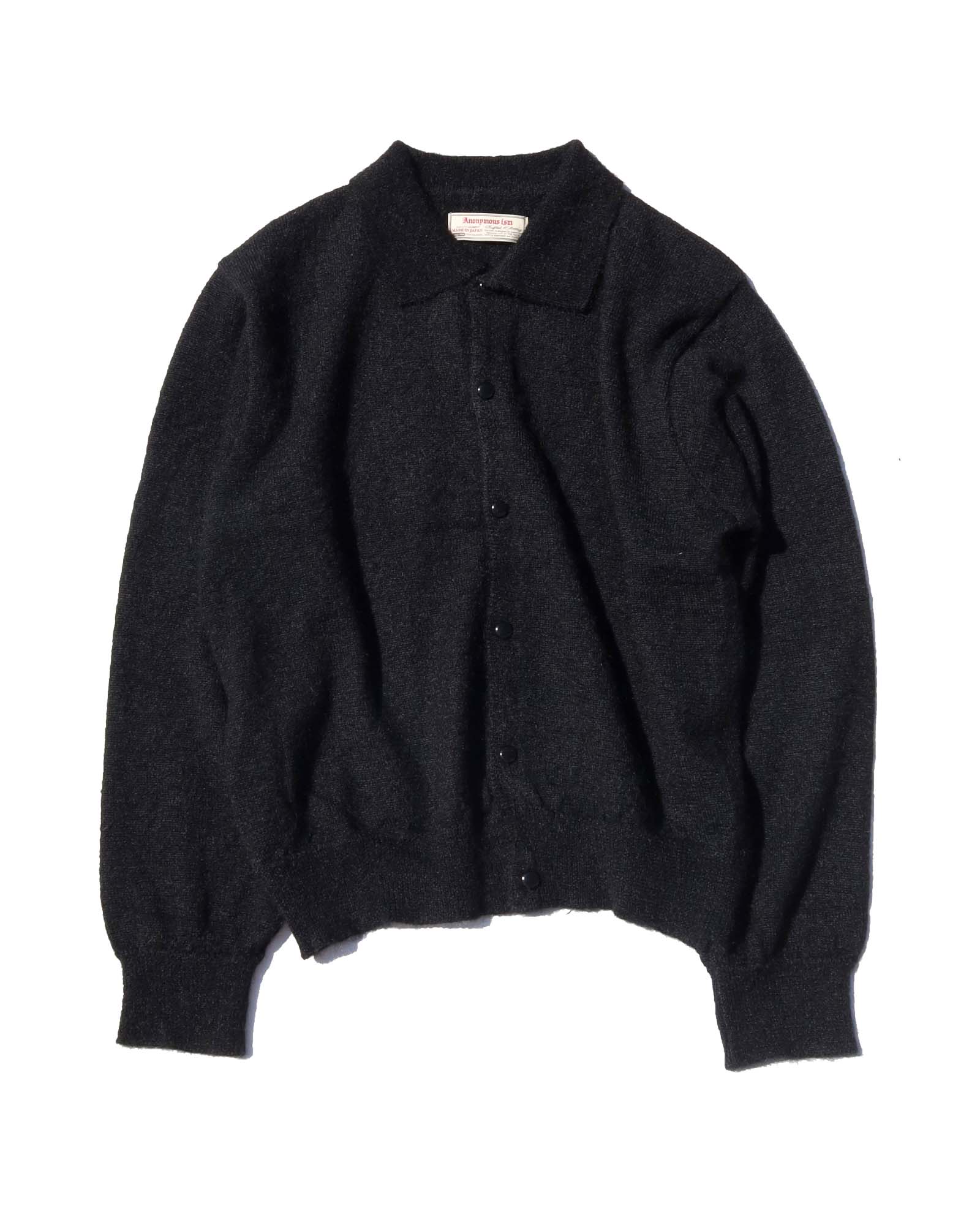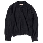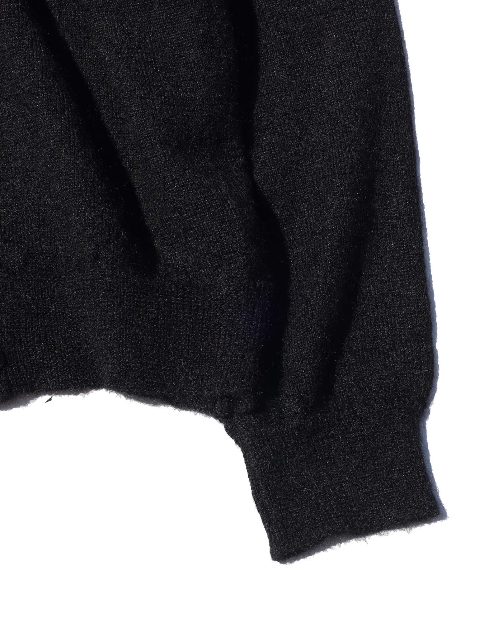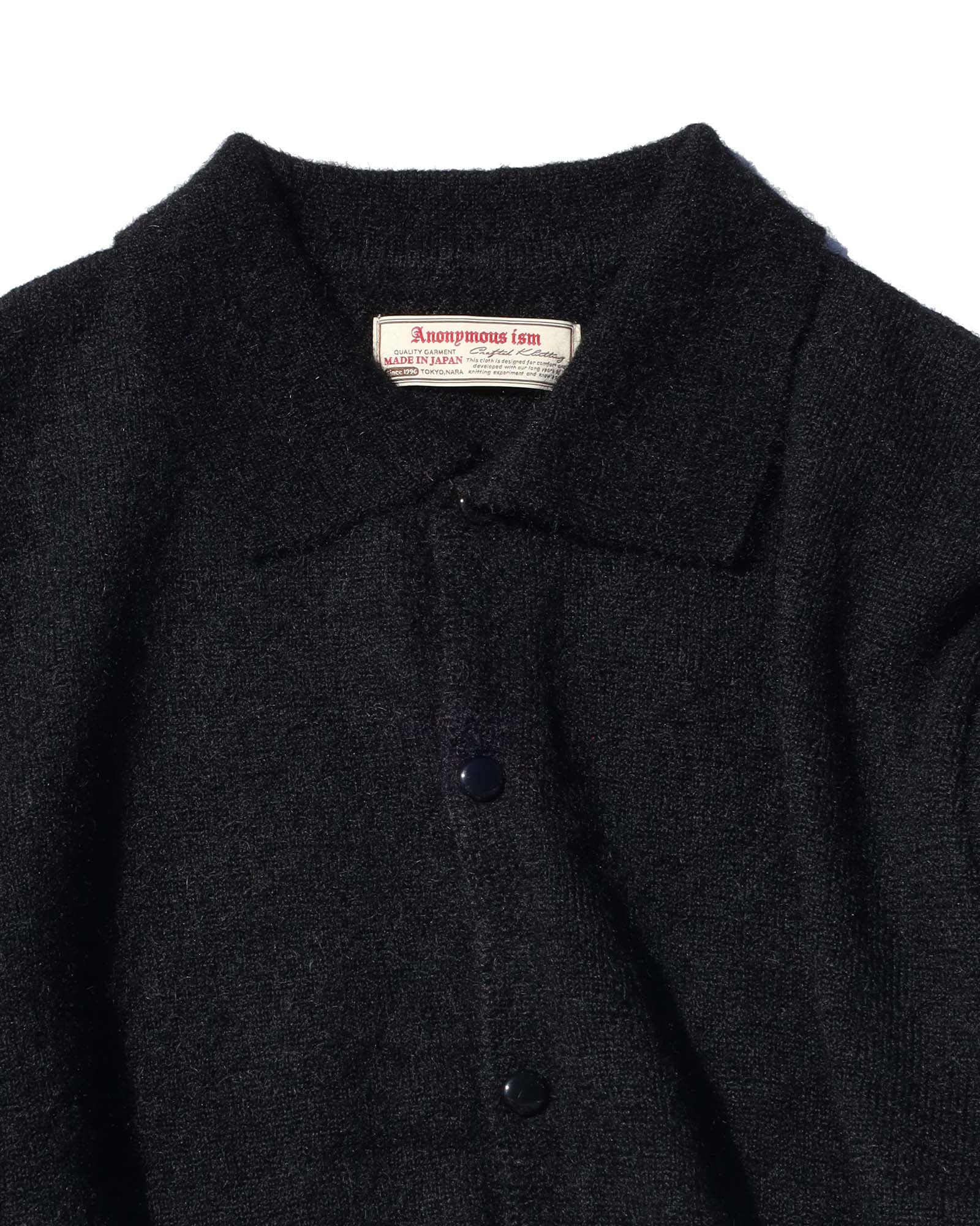 This polo cardigan is crafted from yarn with a high proportion of kid mohair, providing versatile wearability as a standalone piece like a polo shirt or as an outer layer like a cardigan. The mohair yarn is lightweight, soft, and warm with a plush texture. Available in green, blue, and black.
