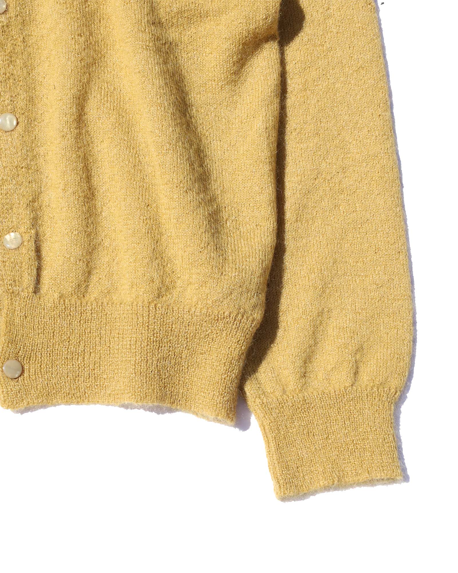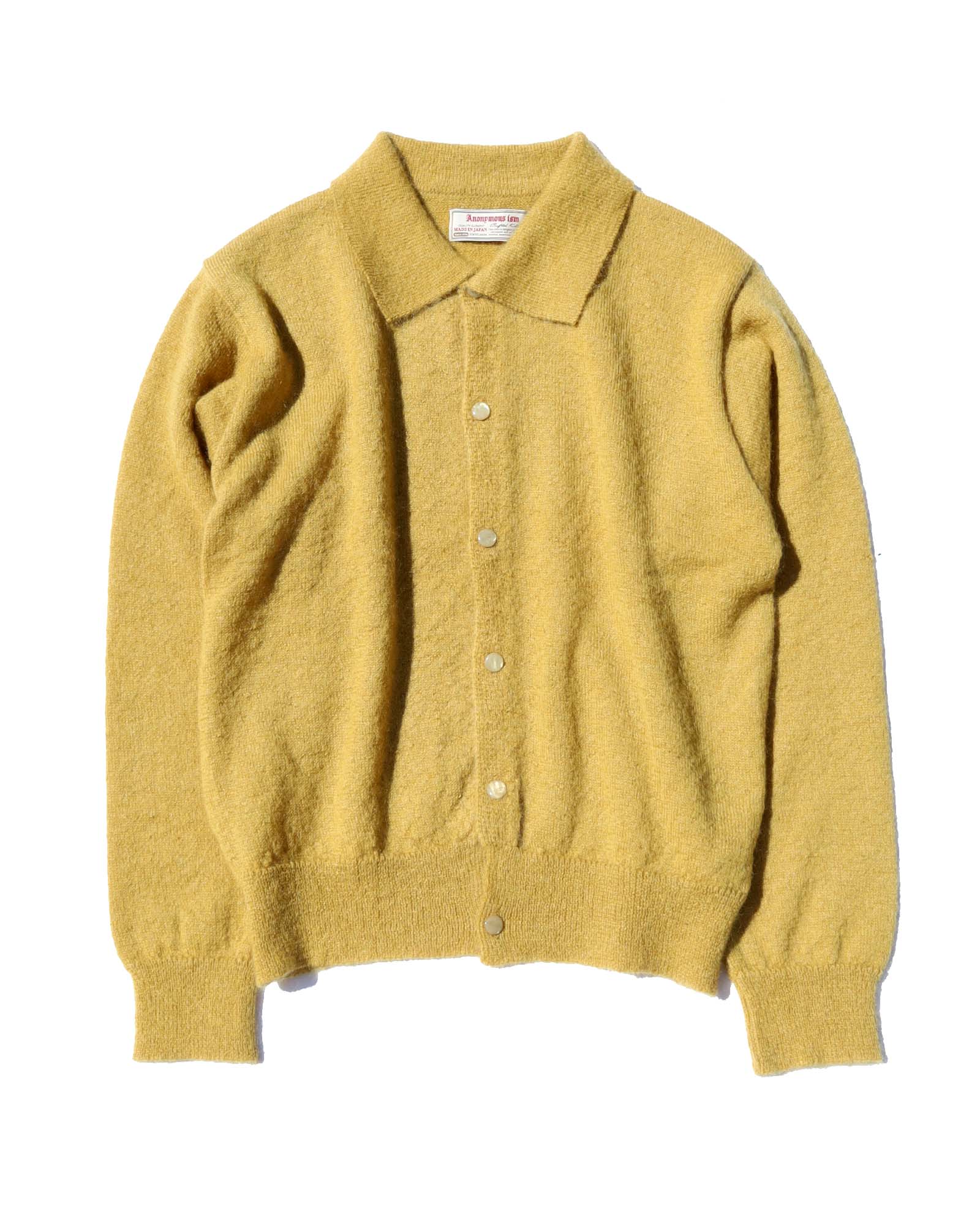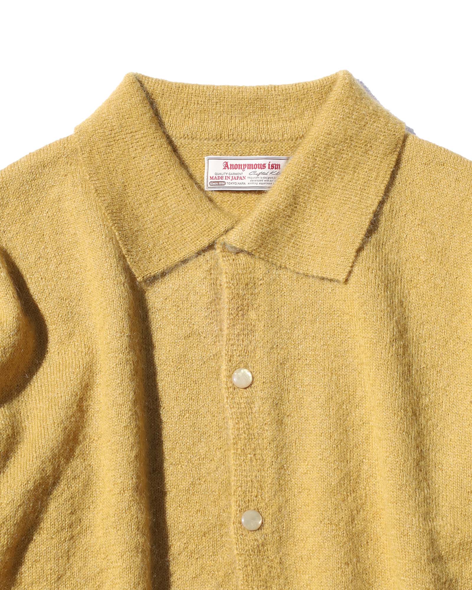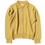 This polo cardigan is crafted from yarn with a high proportion of kid mohair, providing versatile wearability as a standalone piece like a polo shirt or as an outer layer like a cardigan. The mohair yarn is lightweight, soft, and warm with a plush texture. Available in green, blue, and black.