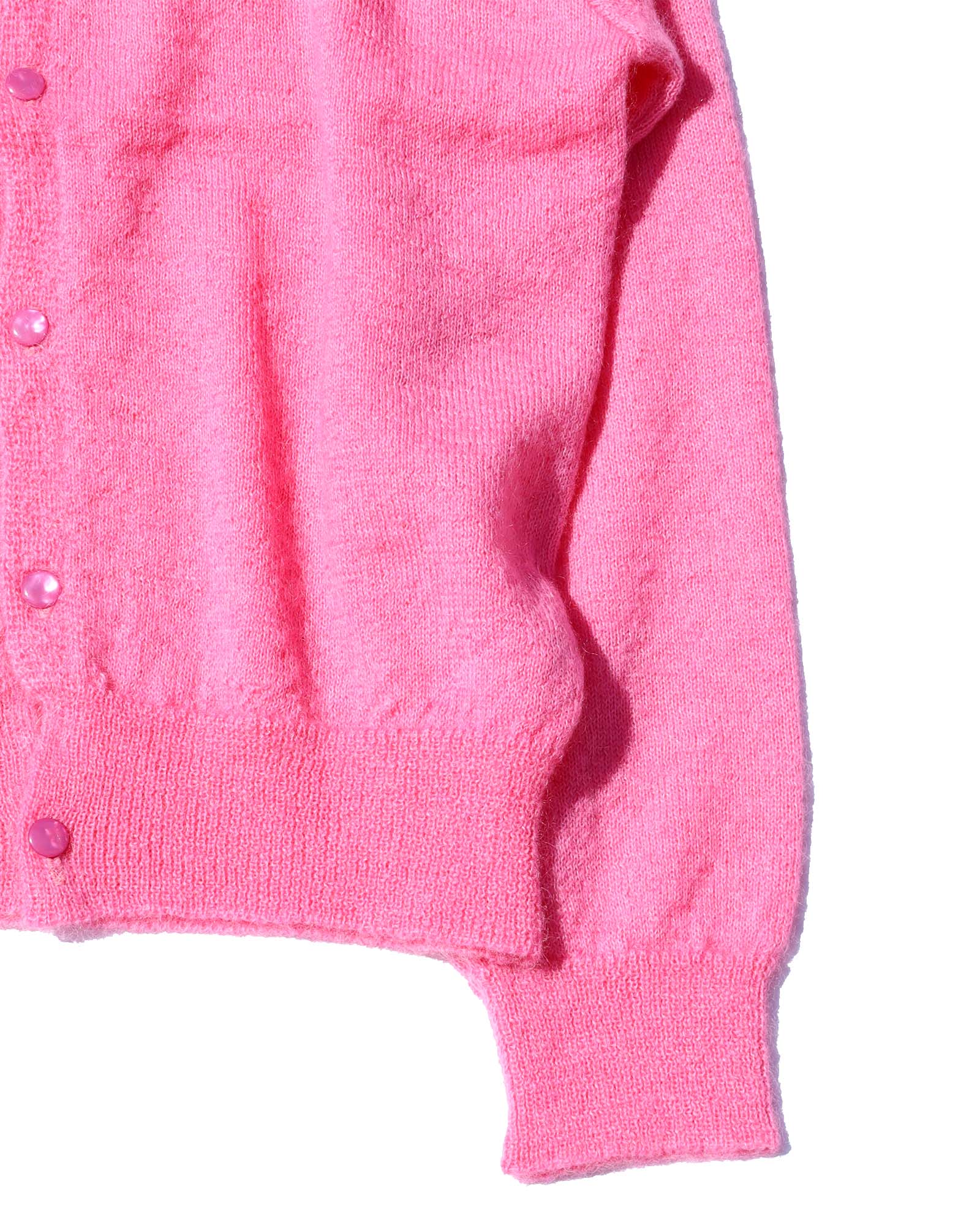 This polo cardigan is crafted from yarn with a high proportion of kid mohair, providing versatile wearability as a standalone piece like a polo shirt or as an outer layer like a cardigan. The mohair yarn is lightweight, soft, and warm with a plush texture. Available in green, blue, and black.