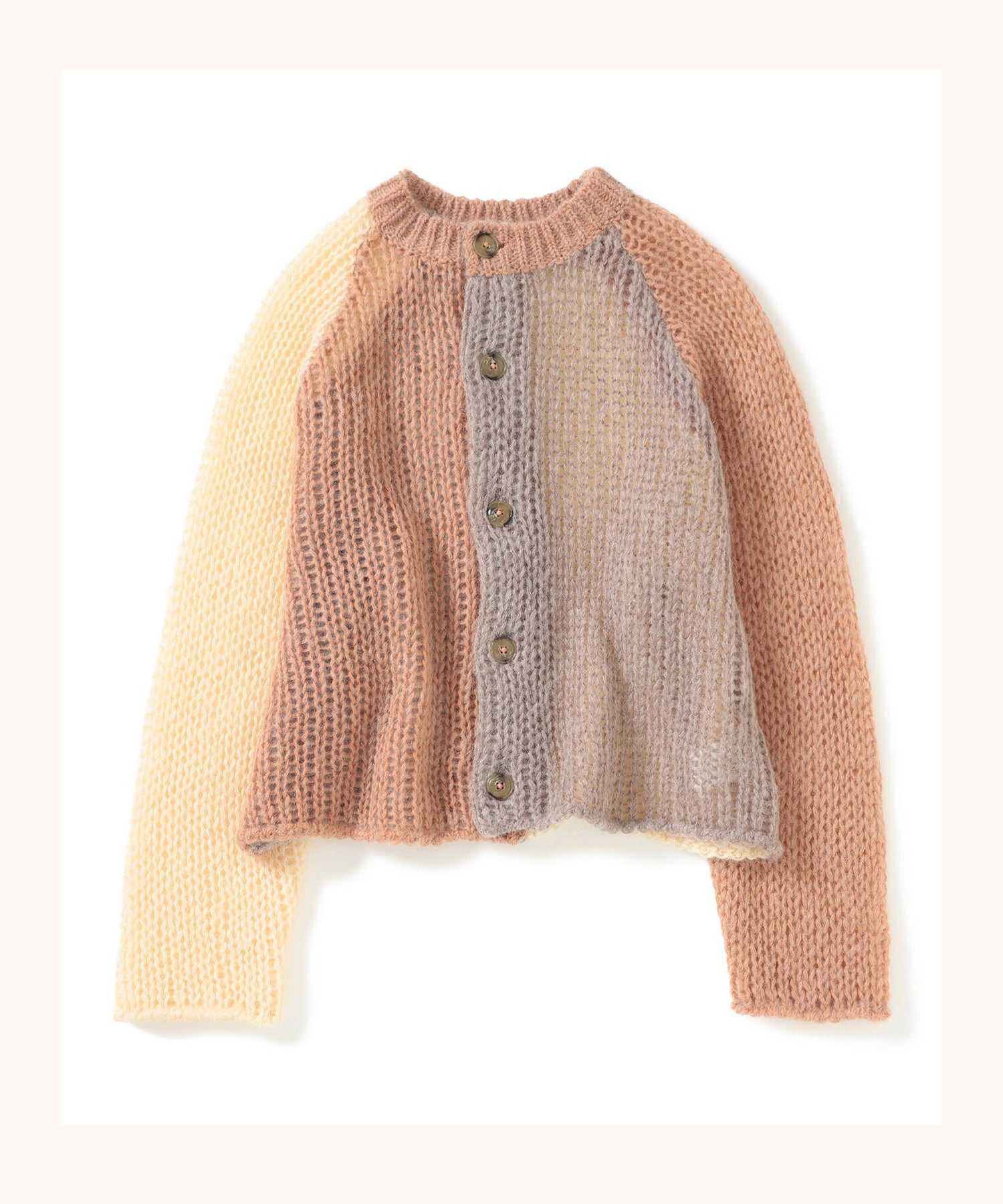 Evoking a vintage mood, this mohair cardigan is crafted with a loose knit tension that mimics the relaxed feel of hand‑knits. Based on classic mohair knits, it features raglan seams, bold “crazy” colour block patterning, and carefully selected buttons and ribbed collar for a balanced look. The playful yet casual design delivers signature BEAMS BOY charm with premium comfort.
