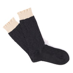 Made from 100% organic cotton thread. This cotton is a sustainable material. (Organic cotton) Made with cotton thread that is environmentally and human-friendly and made without the use of chemicals. The entire sock fabric is reinforced with ultra-fine elastic threads to prevent tearing and reduce the feeling of tightness. The sock body is woven into a noble gothic rope pattern, and the elastic opening has a soft design that makes it easy to wear for long periods of time. The rubber pattern is off-white and woven to look like a neat collar, resembling uneven soccer fabric. The white part of the rubber opening can be folded back like a collar for a cute look. The seams of the toes are stitched one by one using a method called hand linking. The fabric is flat so it doesn't feel bulky.