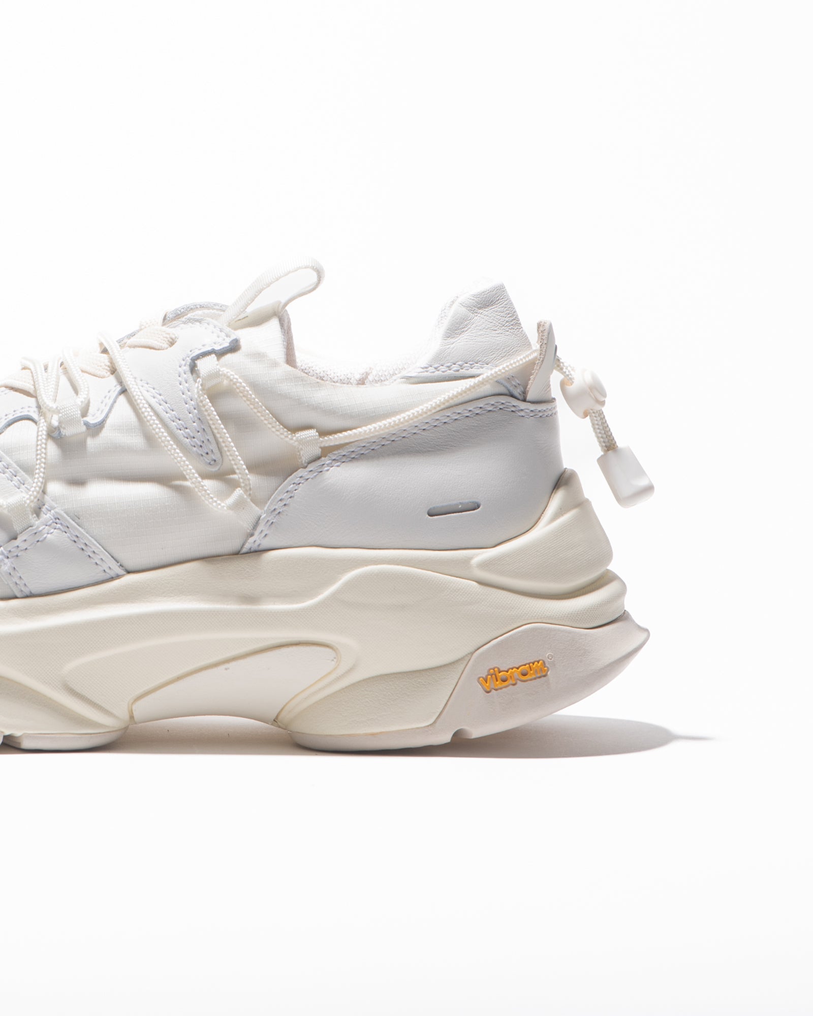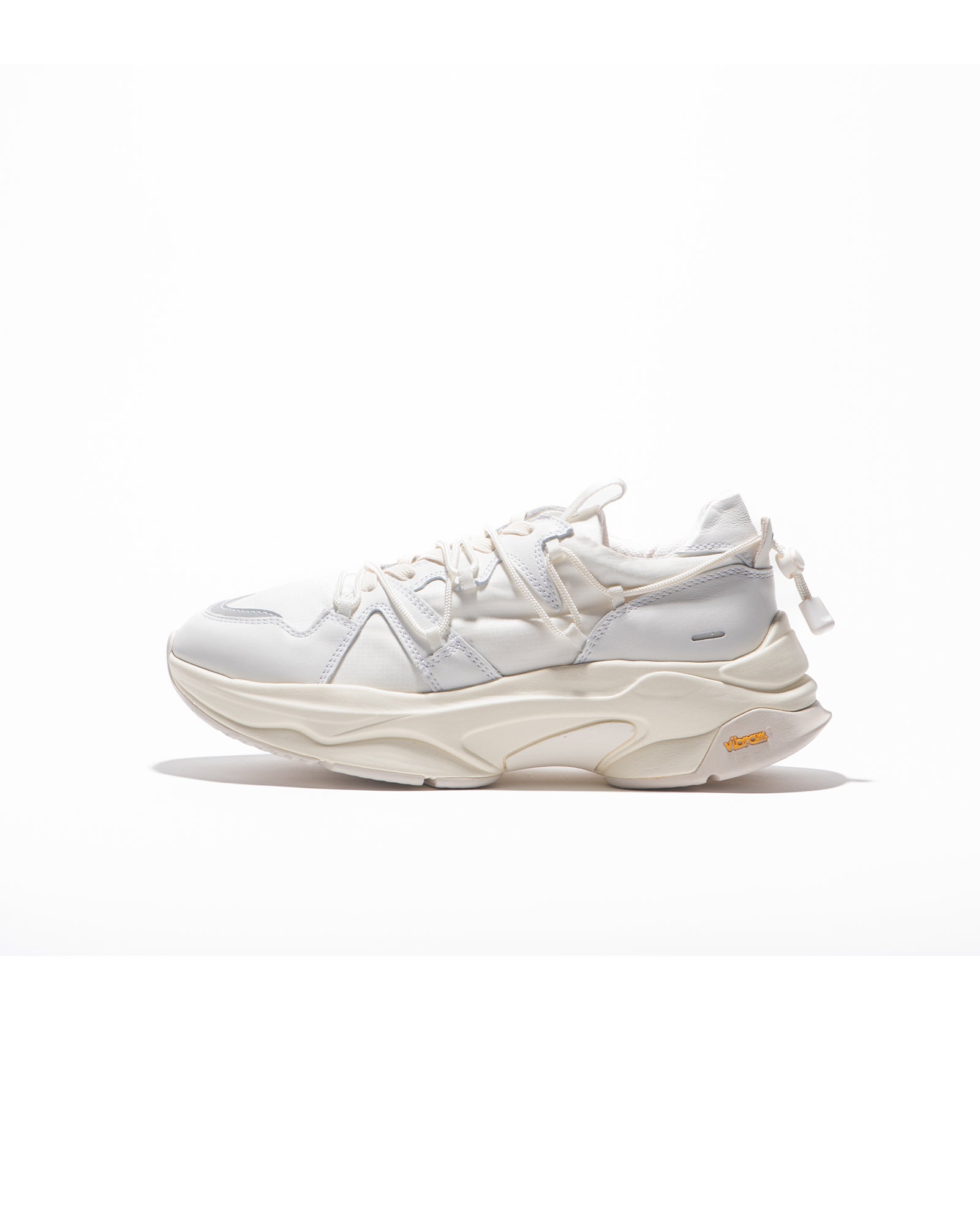 A pair of shoes designed with the image of parkour, a free running sport centered on acrobatics that developed from French military training and involves only one's own physical abilities such as running, jumping, and climbing. The outsole uses Vibram 879C, a running shoe sole with high cushioning and grip, to achieve landing and running that can handle hard actions such as parkour. Furthermore, the slip-on design, which is a feature of snucore shoes, makes it easy to put on and take off, but since this sport requires a precise fit, we designed the shoes to wrap another shoelace around the entire upper. , you can create a hold that suits you. A parkour practitioner is called a traceur in French.