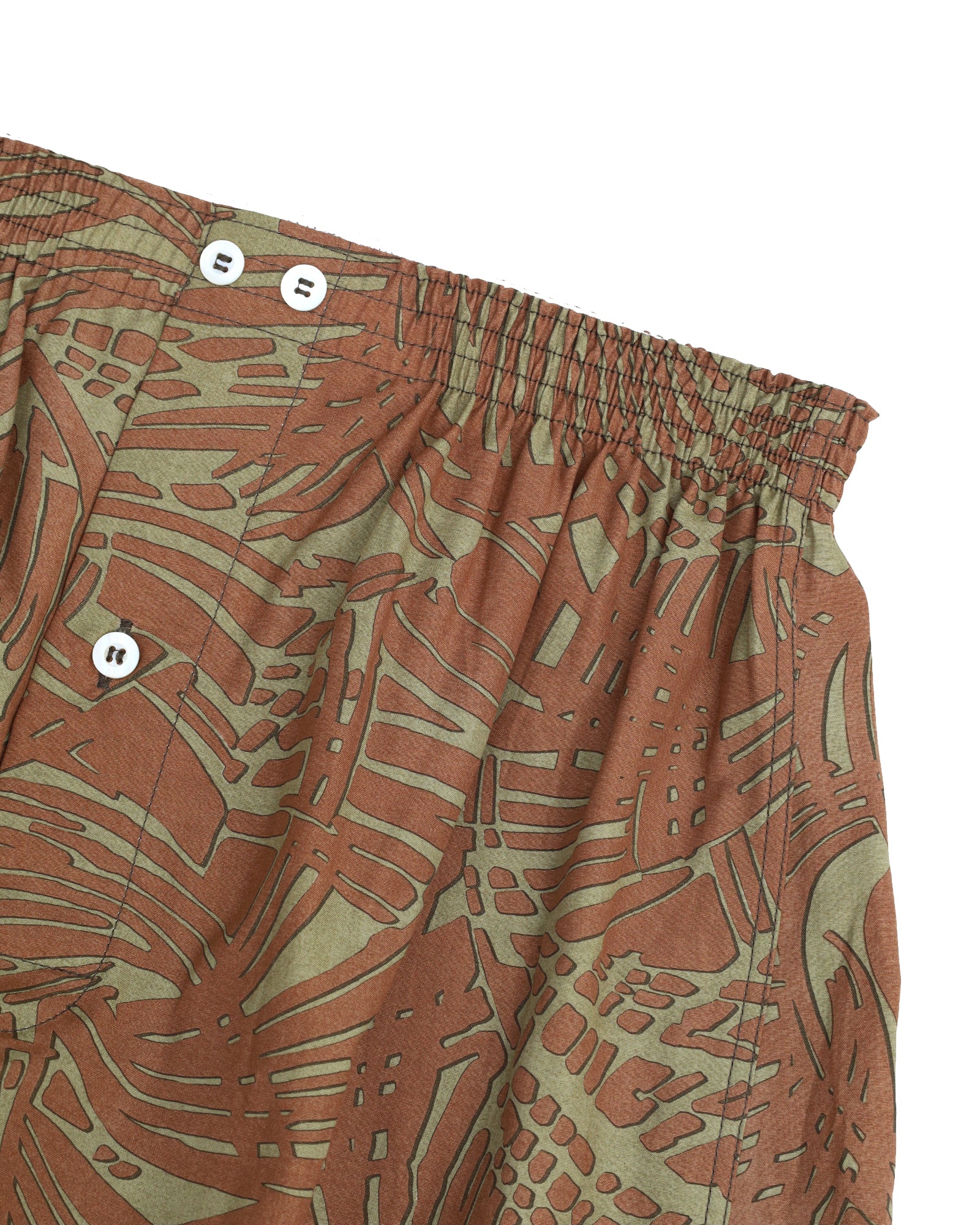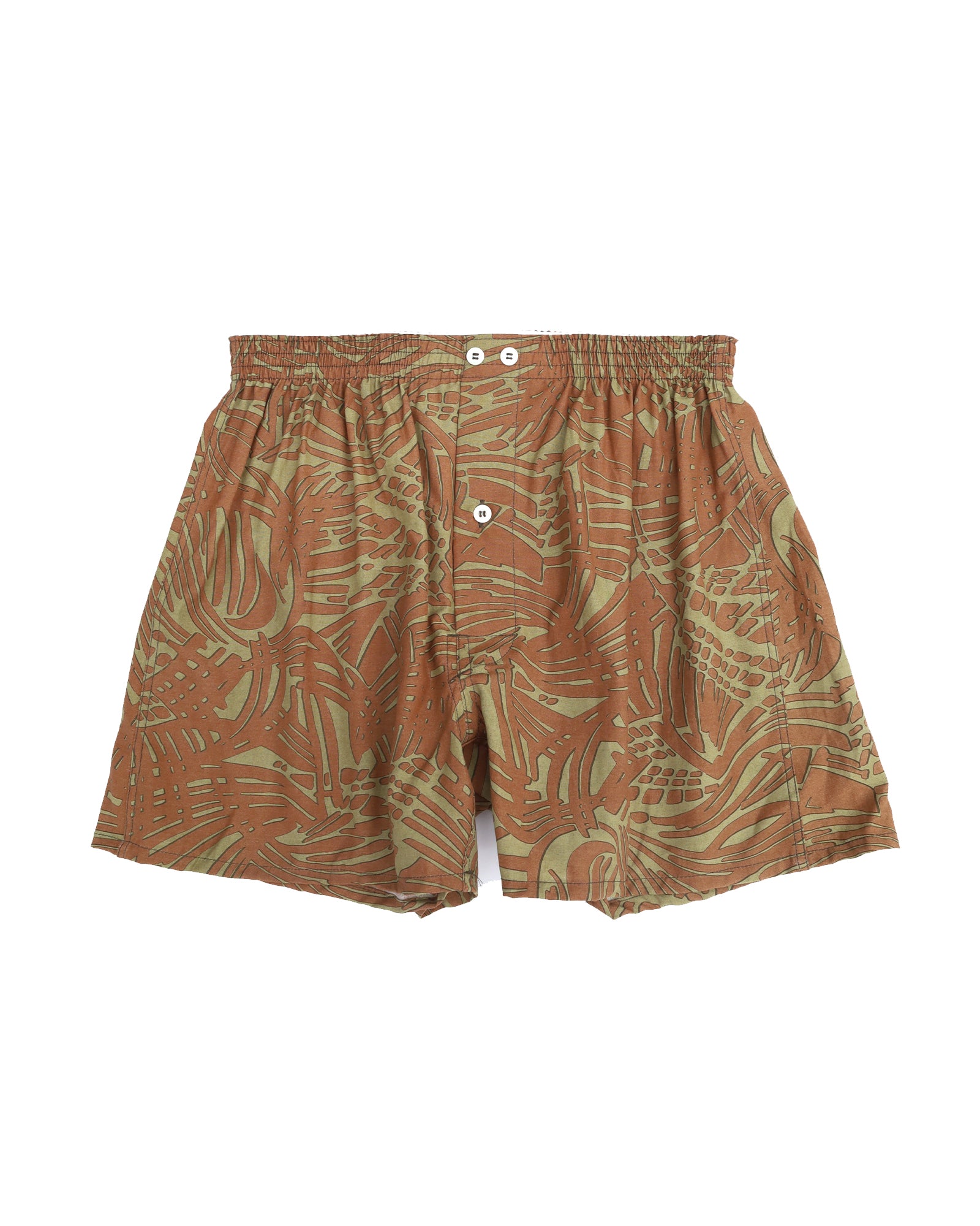 A relaxed boxer crafted from a soft blend of rayon and cotton, featuring a breezy palm tree print that adds a playful touch to everyday comfort.