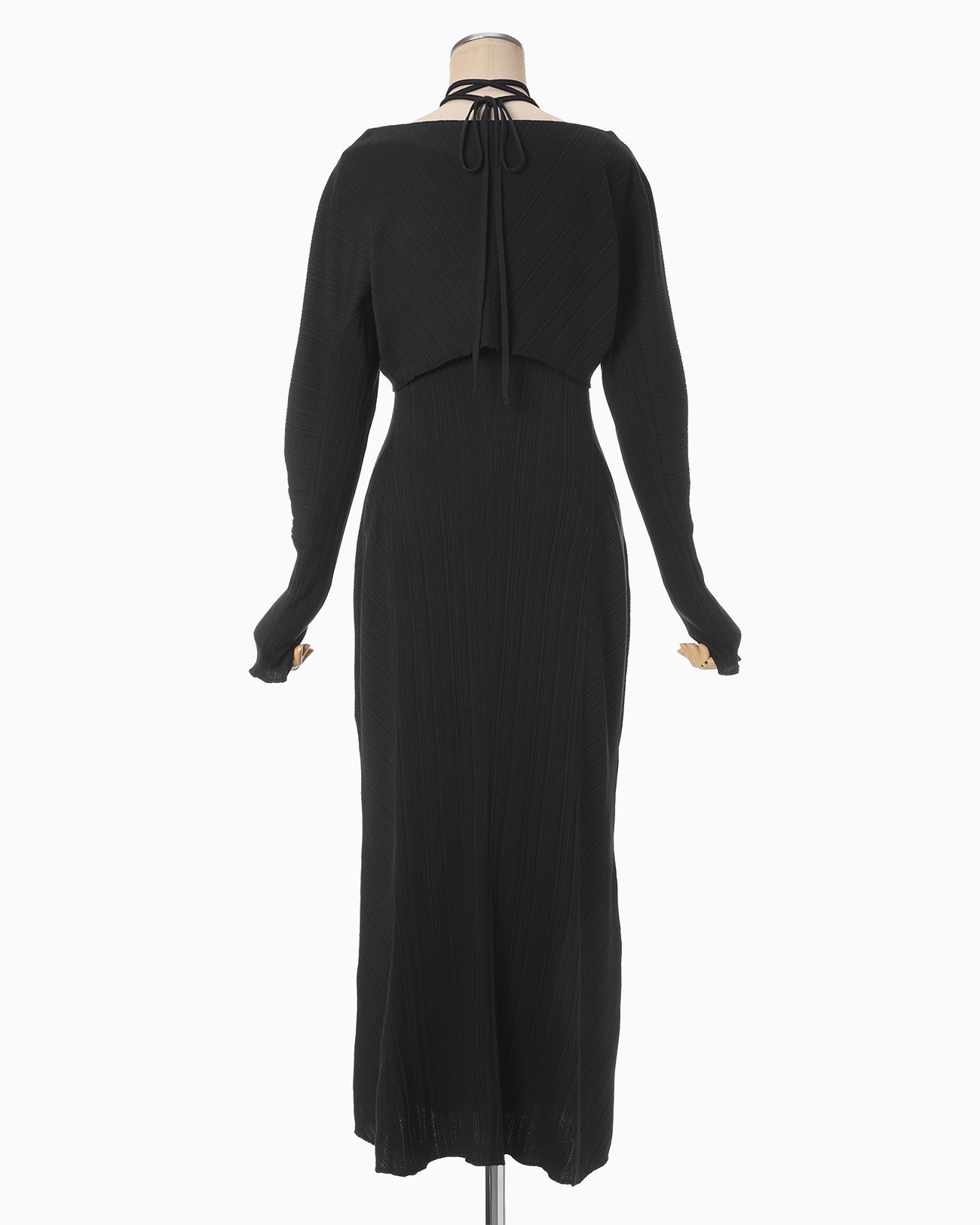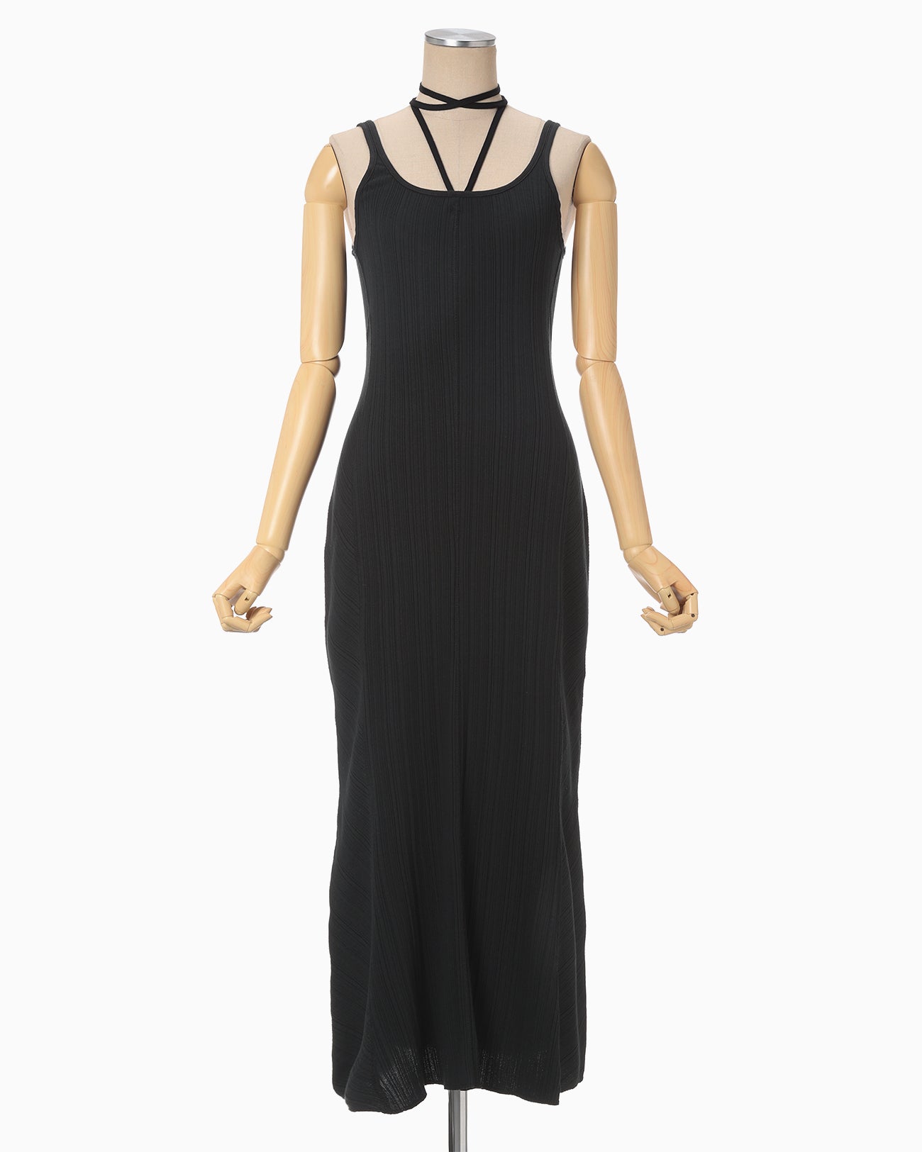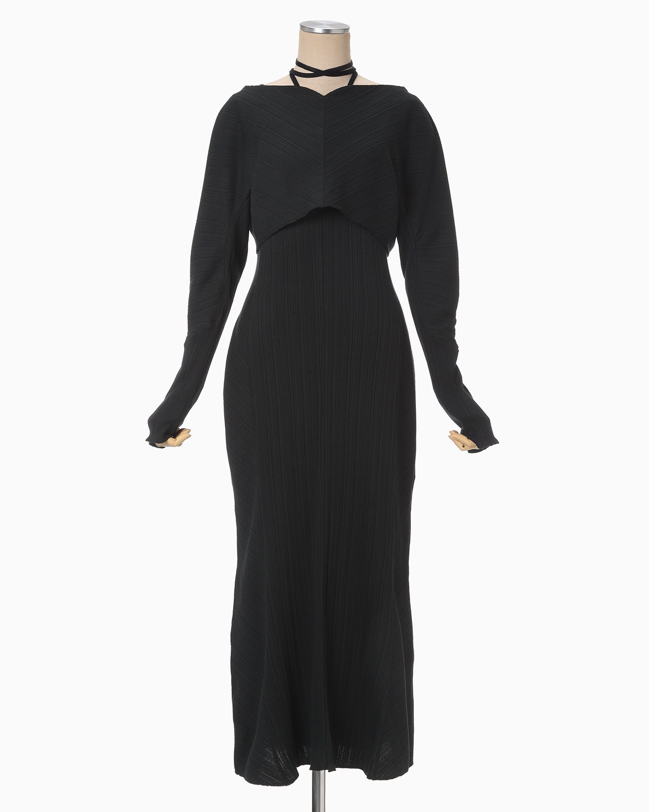 A jersey dress made from organic cotton with random ribbing, offering a soft texture, dimensional look, and comfortable feel. The dress features a two-way styling option with a pullover cropped top and a sleeveless dress that can be worn separately. It can be used year-round, either as a single piece or as a set, providing versatile styling possibilities.