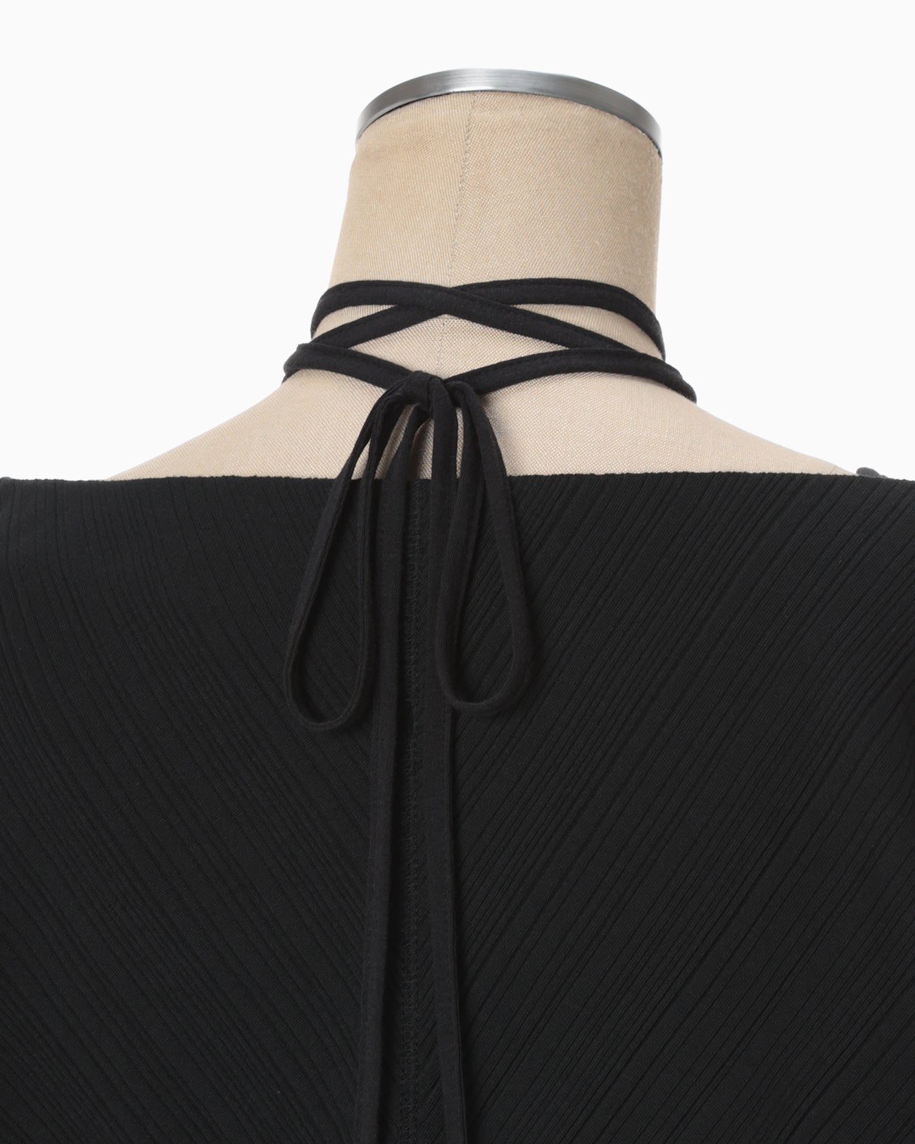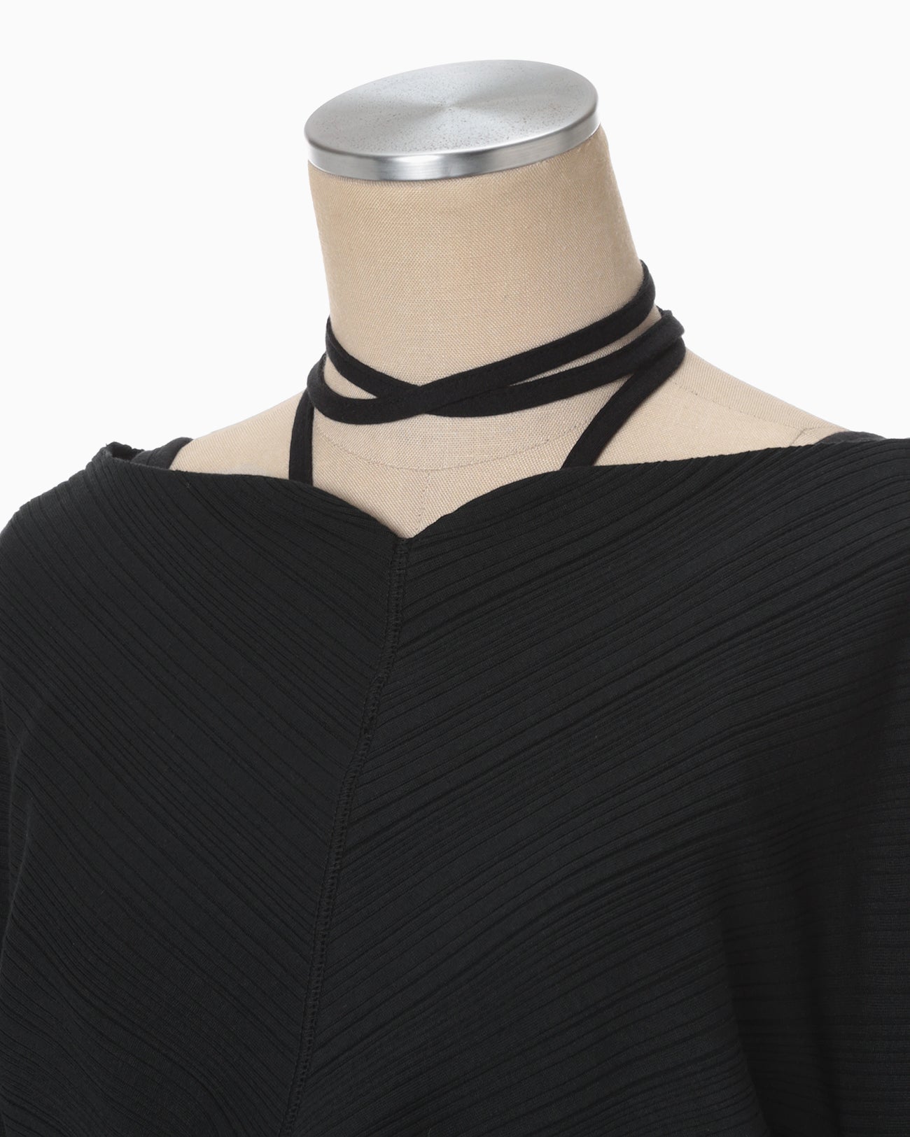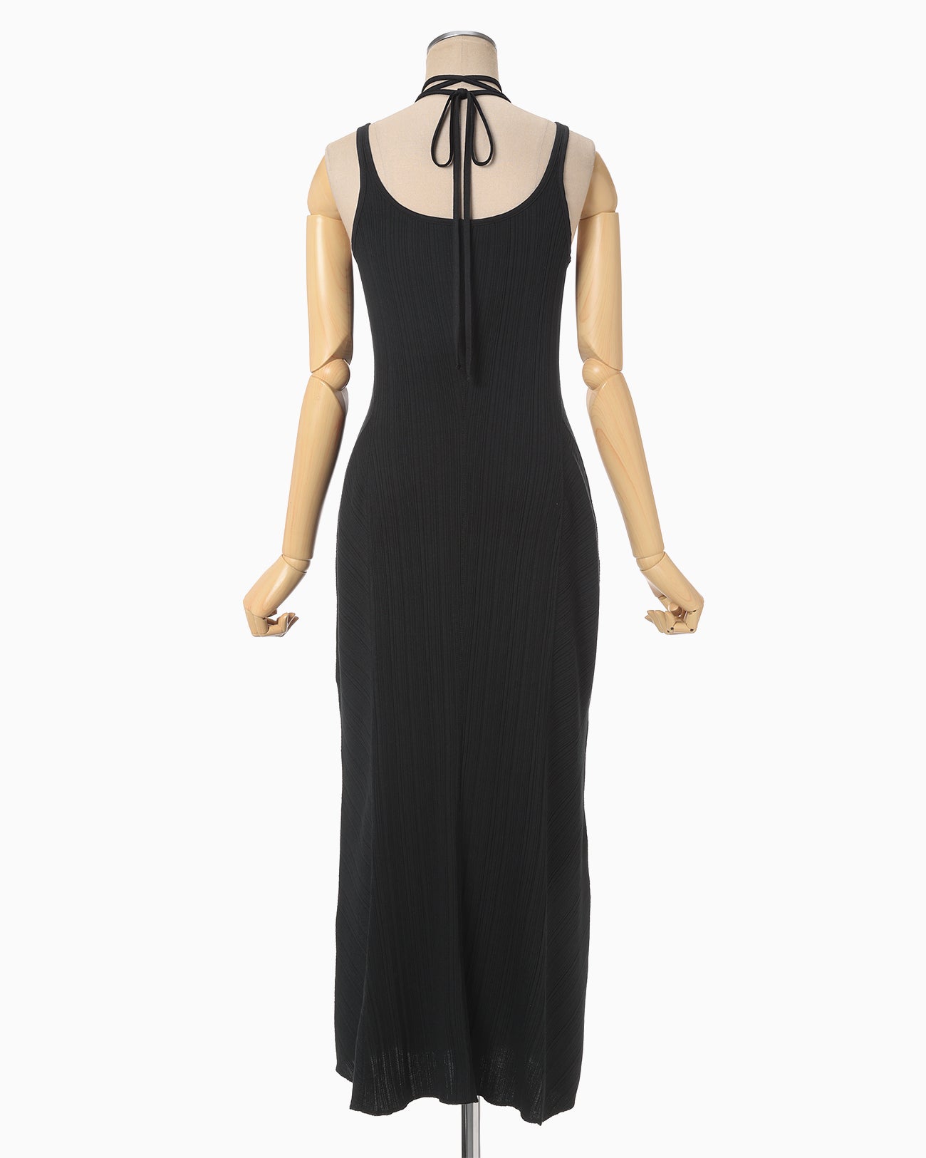 A jersey dress made from organic cotton with random ribbing, offering a soft texture, dimensional look, and comfortable feel. The dress features a two-way styling option with a pullover cropped top and a sleeveless dress that can be worn separately. It can be used year-round, either as a single piece or as a set, providing versatile styling possibilities.