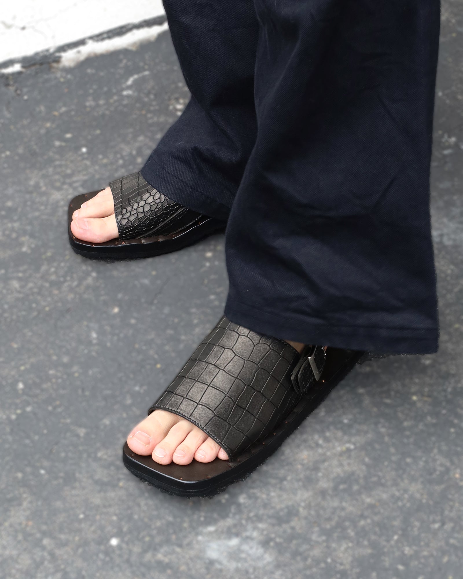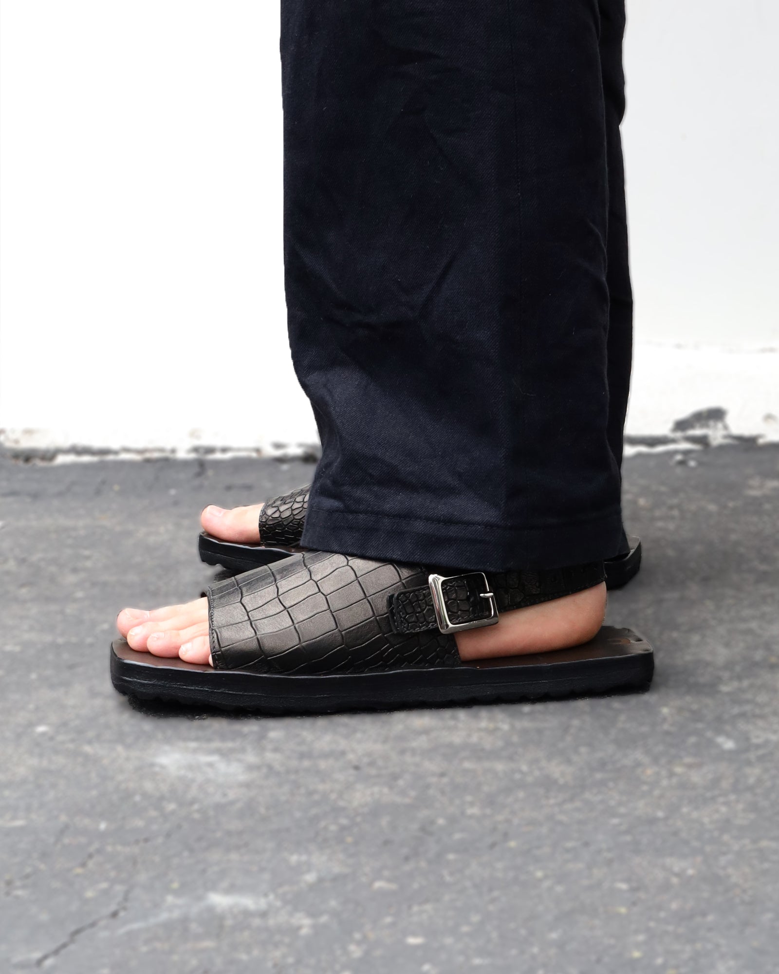 Exclusively crafted for Anonymous Ism Shop, the Sam sandal merges traditional craftsmanship with exquisite detail. Made from premium Latigo leather using San Francisco’s time-honored tanning techniques, it features a realistic scaled texture that echoes genuine exotic skins. The elevated arch design ensures a fatigue-free experience, while the custom-fit feel develops with wear. Finished with a striking buckle reminiscent of the brand’s jewelry work, Sam is a standout in sophistication and comfort.