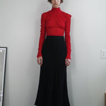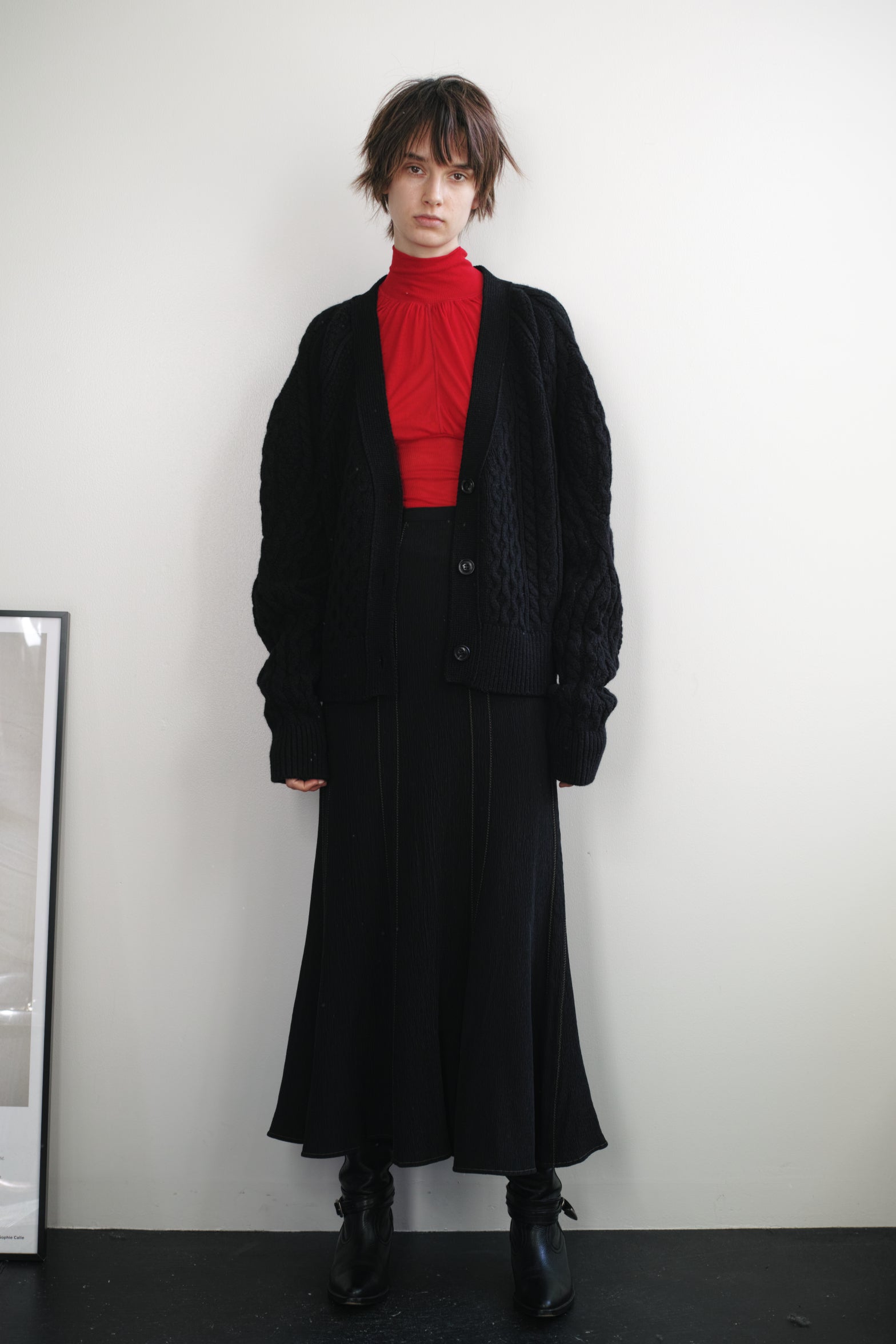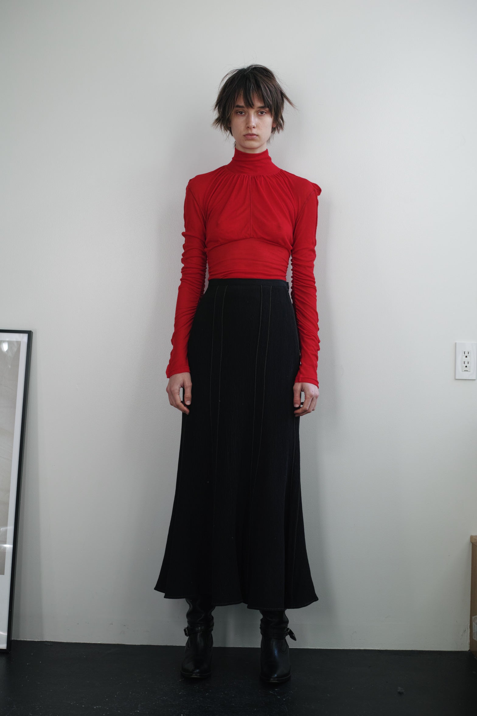 A high-neck top made from 90% Tencel and 10% cashmere. The luxurious Tencel-cashmere fabric combines the smooth, moisture-absorbing properties of Tencel with the softness and warmth of cashmere. It is lightweight, comfortable, and environmentally friendly, with a refined sheen. The top features gathers that accentuate the silhouette, adding a sophisticated touch to the design.