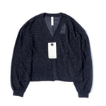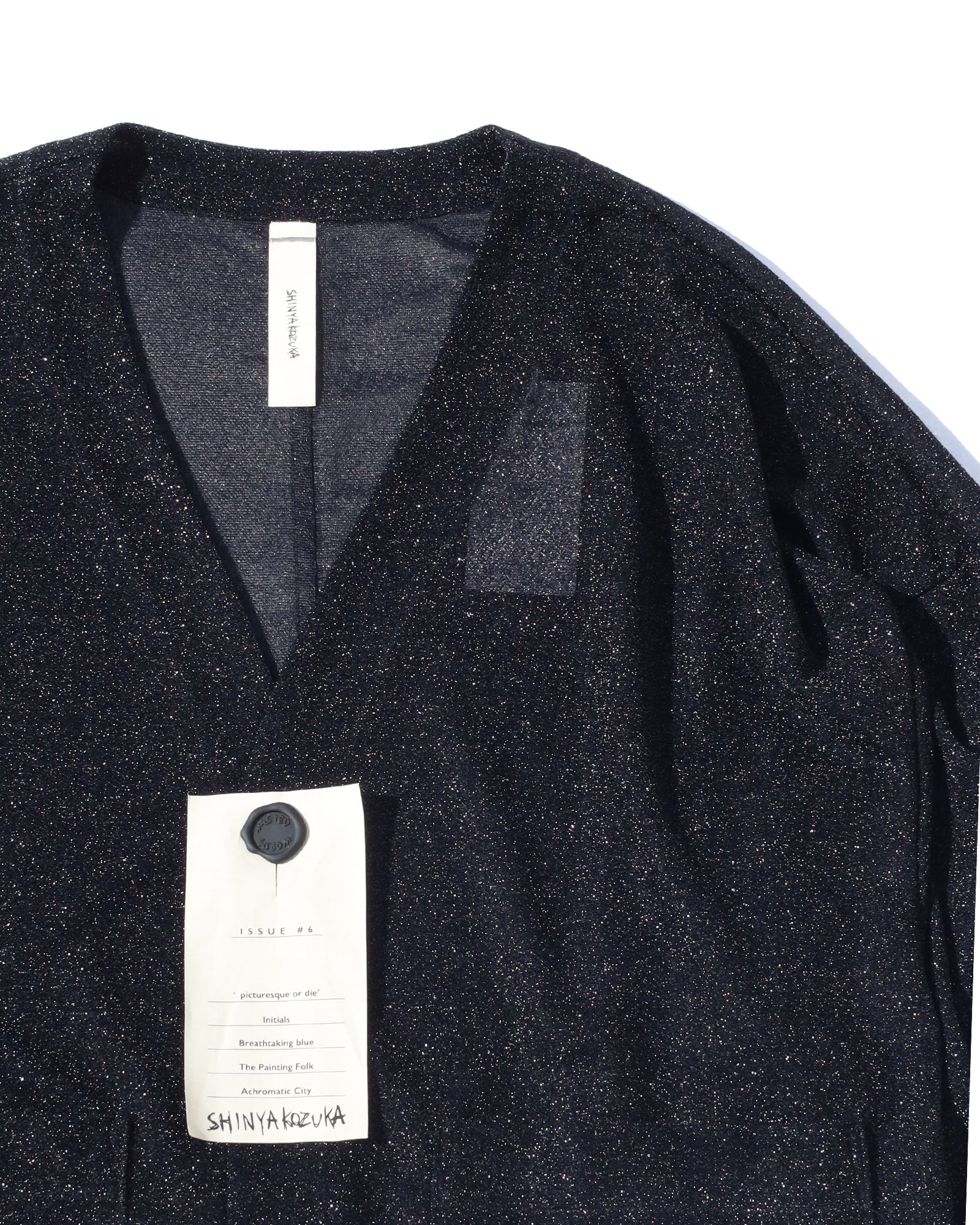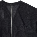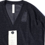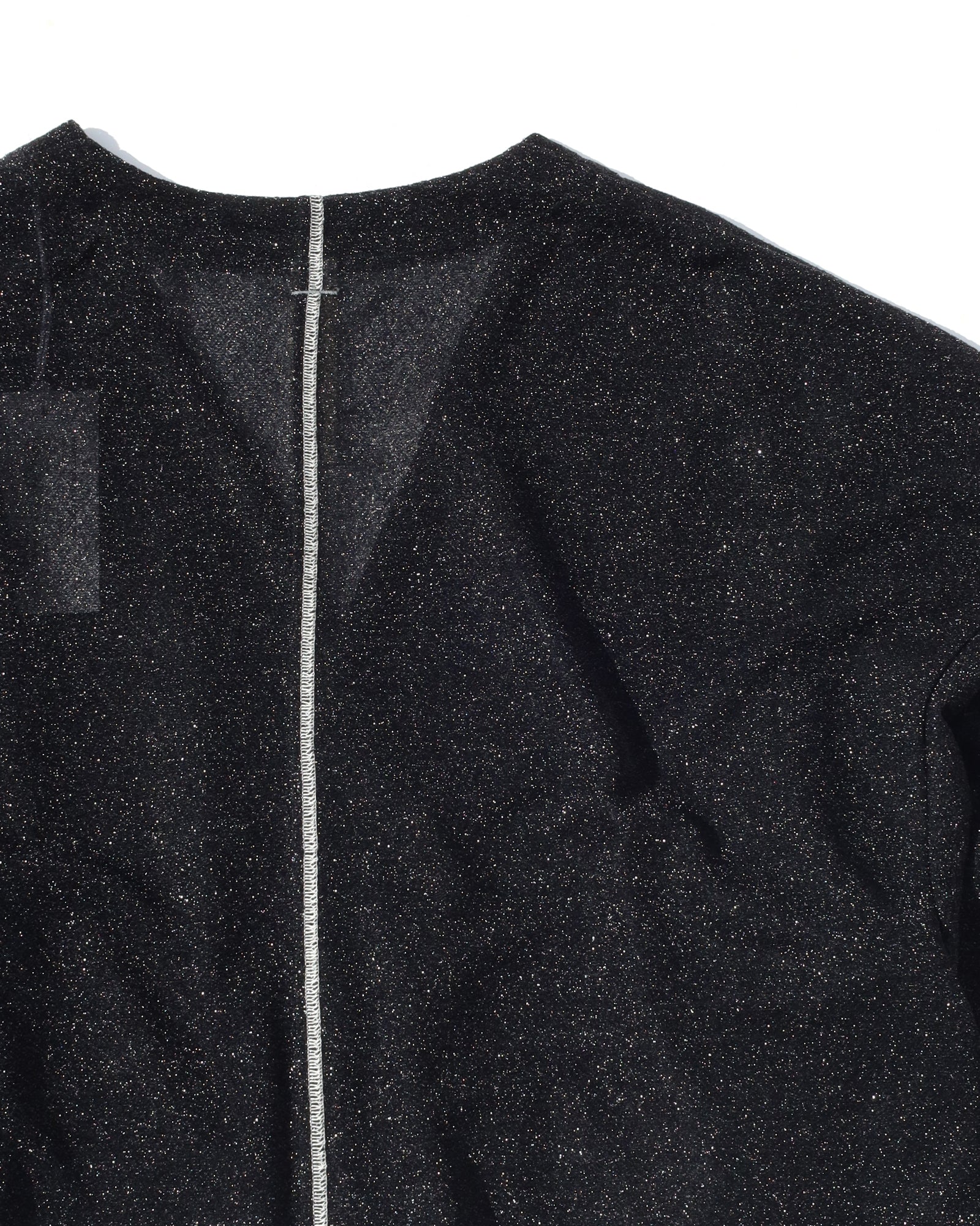 True to its name, the Massive Cardigan is a super oversized knit that embraces volume and shimmer. Crafted from a lightweight glitter jersey, it drapes generously over the body while offering flexibility, breathability, and a fluid silhouette. The tightly ribbed cuffs allow the sleeves to pool or be pushed up for varied styling, adding structure to the relaxed shape.