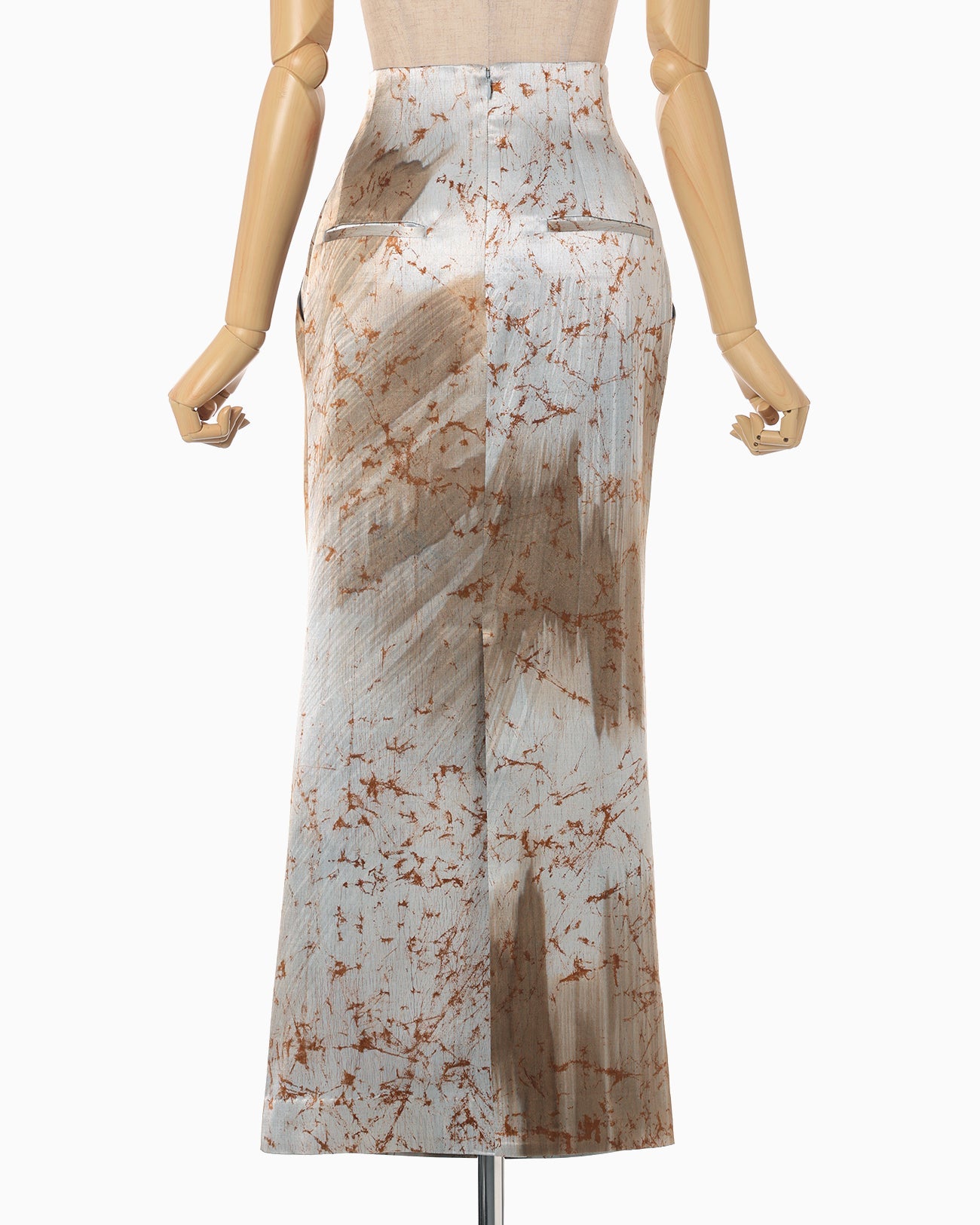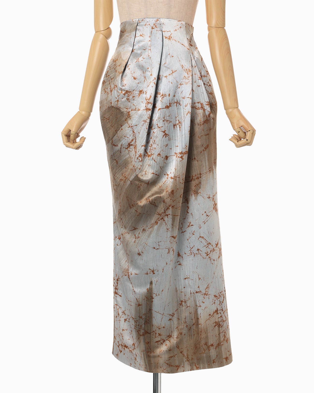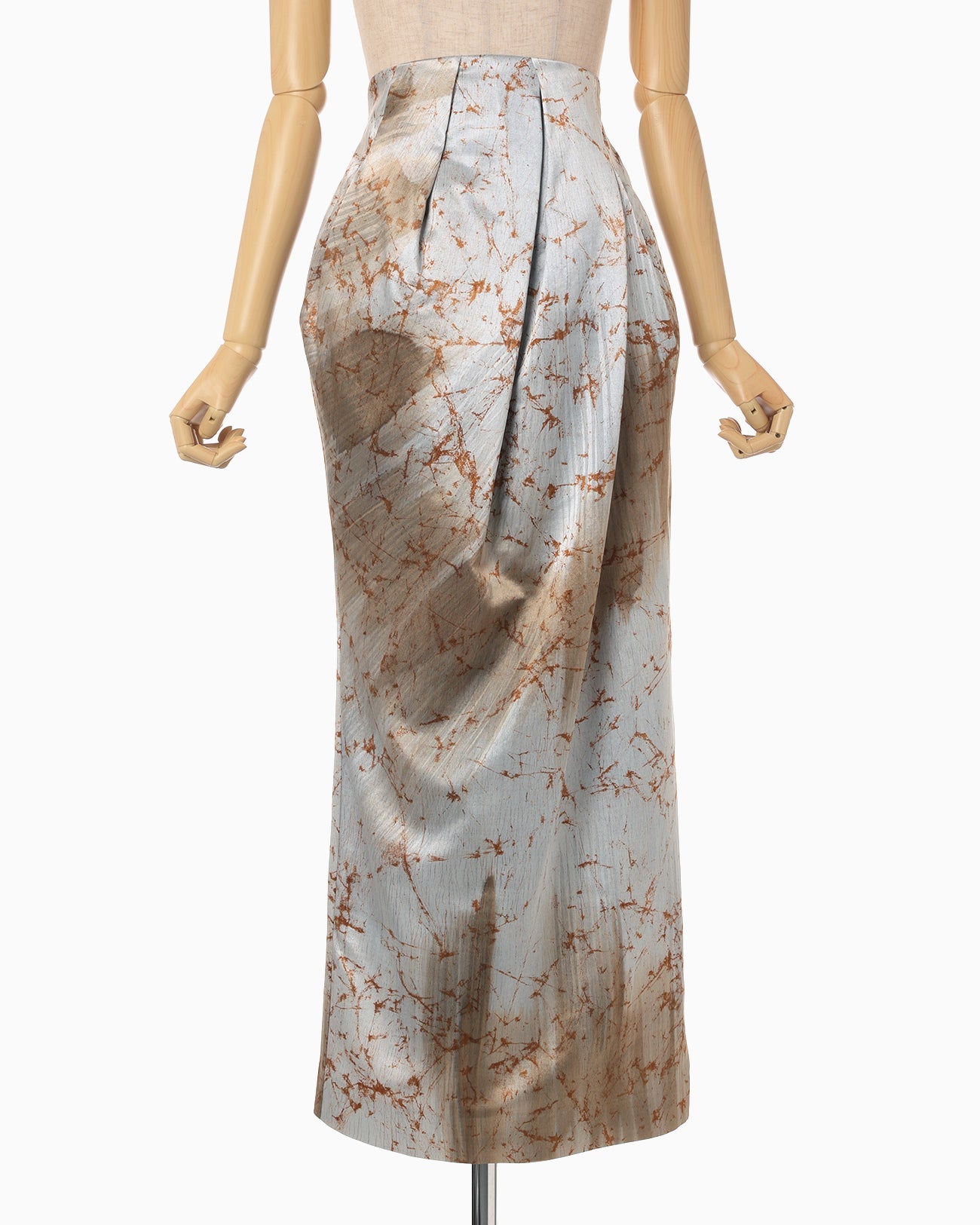 An I-line skirt made from silk-wool satin with a luxurious sheen, hand-dyed to create a pattern that mimics the iridescent and mottled look of glazing. Each piece features a unique, original textile that evokes "wearable ceramics," making it a symbolic design of the season. The high waist and rounded silhouette from the hips resemble a vase, while the tuck details and back slit add an elegant touch.