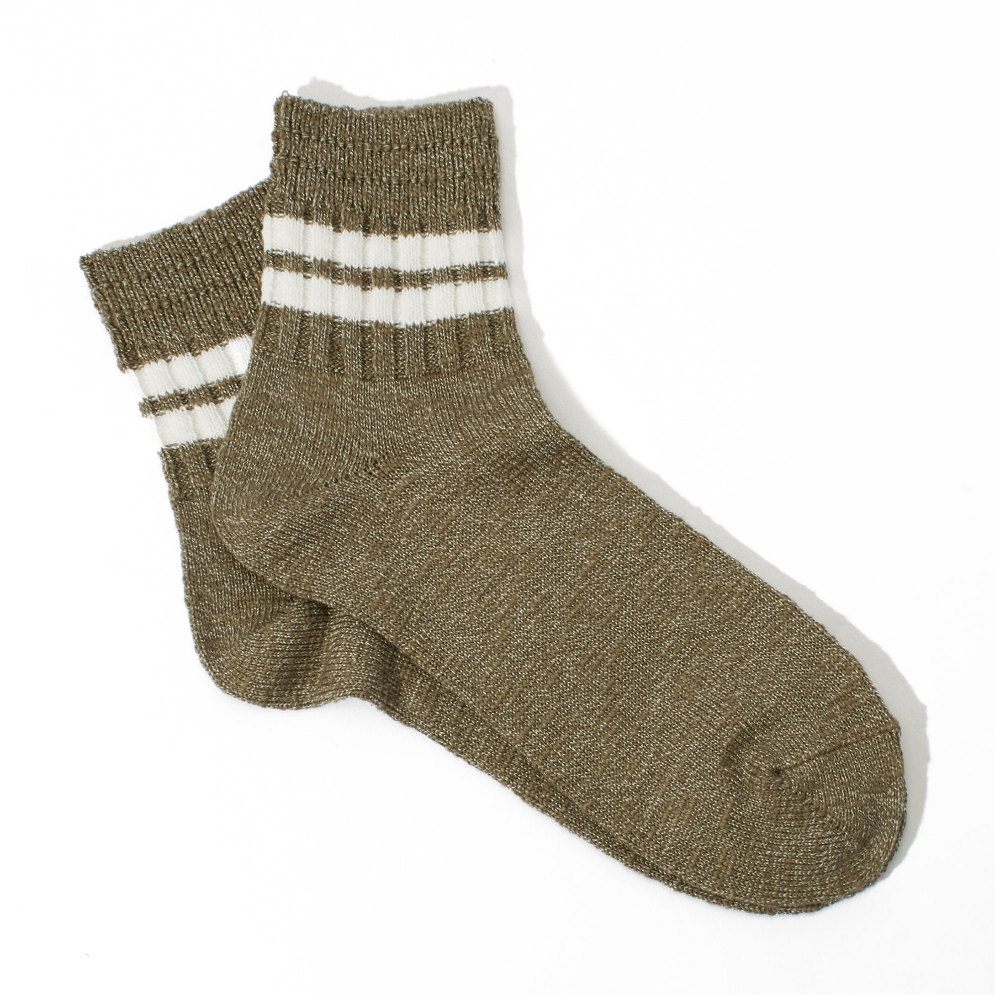 Thick yet very soft, these socks are crafted from a cotton-acrylic blended yarn for the perfect balance of durability and comfort. The textured fabric, enriched with slub yarn, adds depth, while the striped cuff and subtle knit variations create distinctive accents that set them apart from traditional tennis socks.