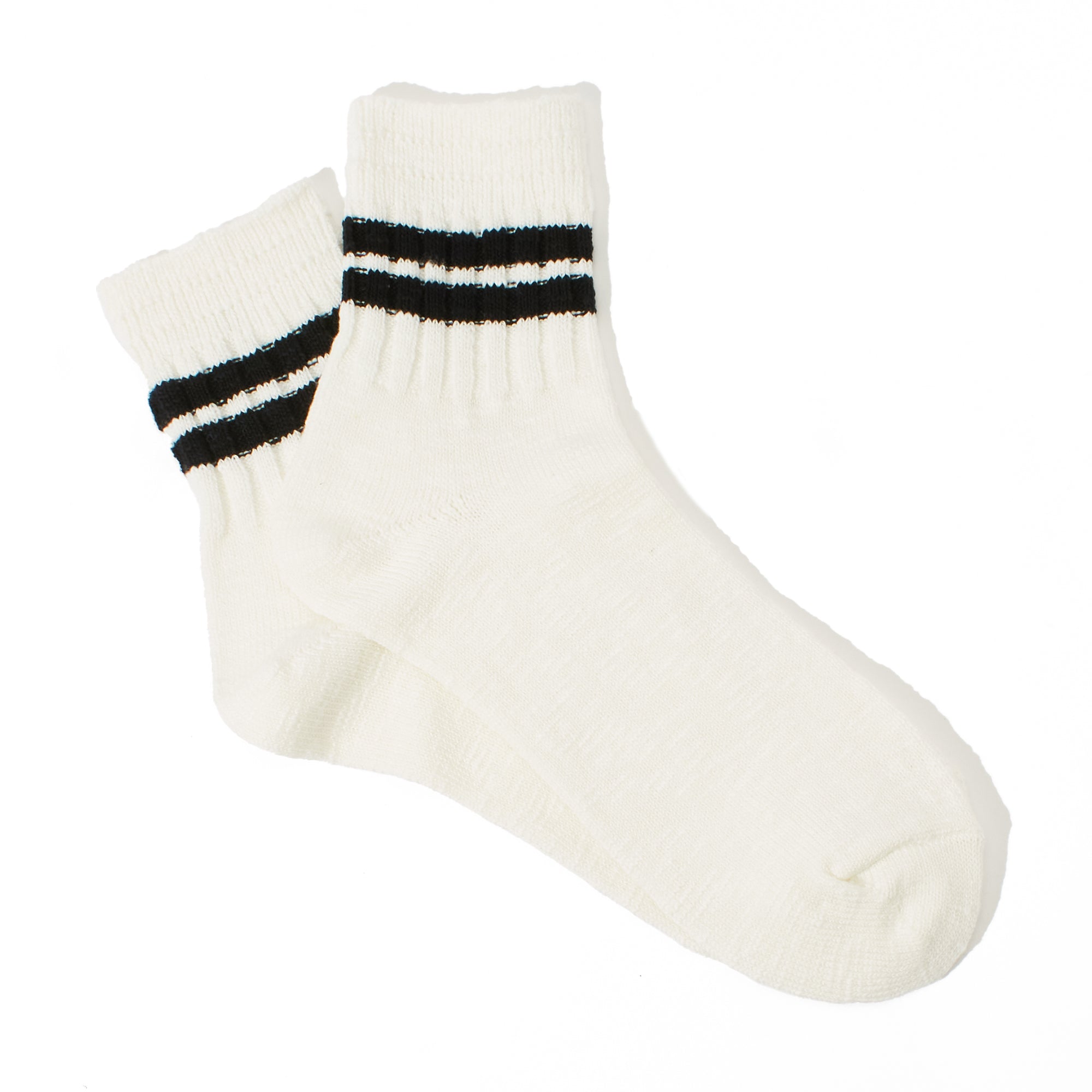 Thick yet very soft, these socks are crafted from a cotton-acrylic blended yarn for the perfect balance of durability and comfort. The textured fabric, enriched with slub yarn, adds depth, while the striped cuff and subtle knit variations create distinctive accents that set them apart from traditional tennis socks.
