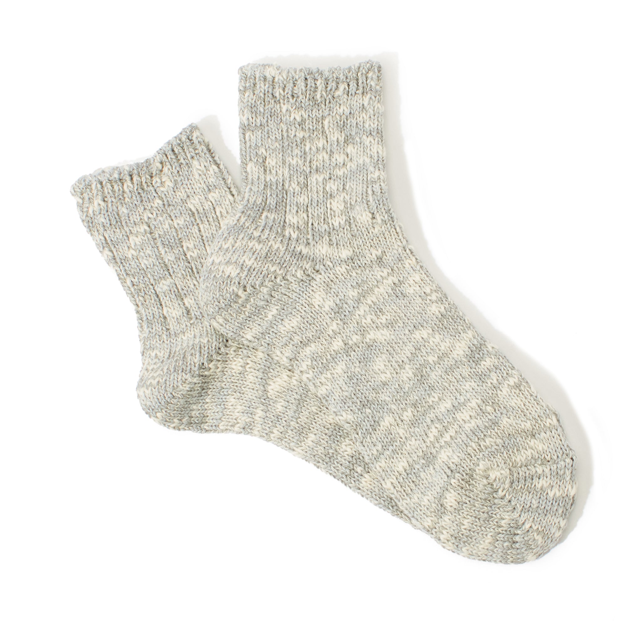 These quarter-length socks feature thick slub yarn for a bold yet understated look. While they may appear simple, they are crafted by pushing the knitting machine to its gauge limits, blending multiple yarn thicknesses to create a plush, voluminous texture with exceptional softness and depth.