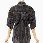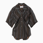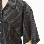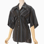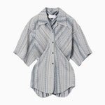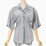 This open-collar shirt features a custom stripe jacquard pattern inspired by Okinawa’s traditional Minsa weaving. By combining cupro yarns for the warp and weft with fine polyester filament yarns for the design, the fabric creates a delicate textured surface with visual depth. Drape details from the chest to the waist elevate the relaxed silhouette into an elegant piece. Lightweight and breathable, it's perfect for spring and summer layering, easily adapting to casual or more refined looks.
