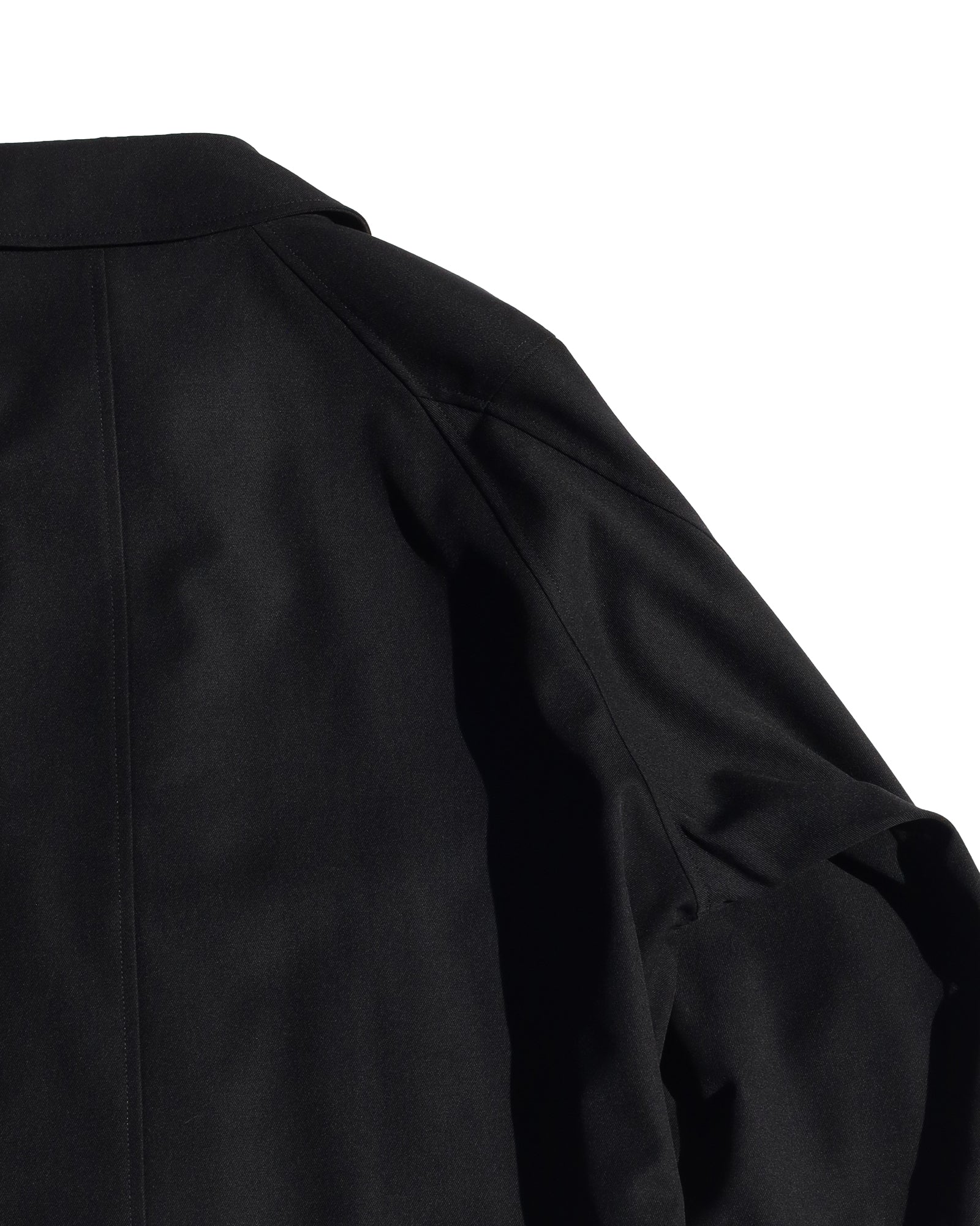 The T/W Short Jacket blends traditional tailoring with technical design for versatile outerwear that moves with you. Featuring a modified split raglan sleeve—set-in at the front and raglan at the back—it ensures a natural range of motion around the shoulders. Crafted from high-density T/W Burberry cloth, this piece offers a structured silhouette, wind protection, and lasting durability. A large chin strap and snap-adjustable hem round out its weather-resistant functionality.