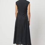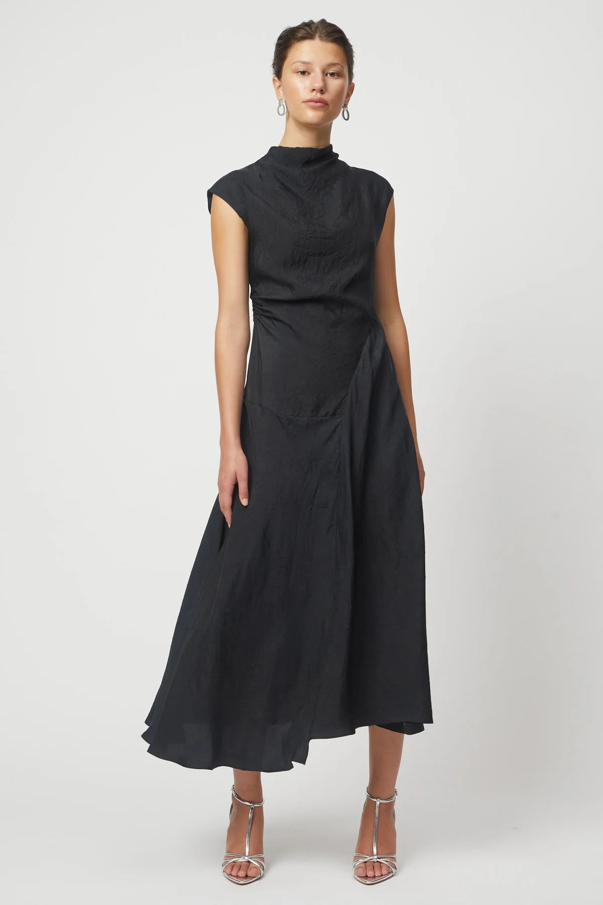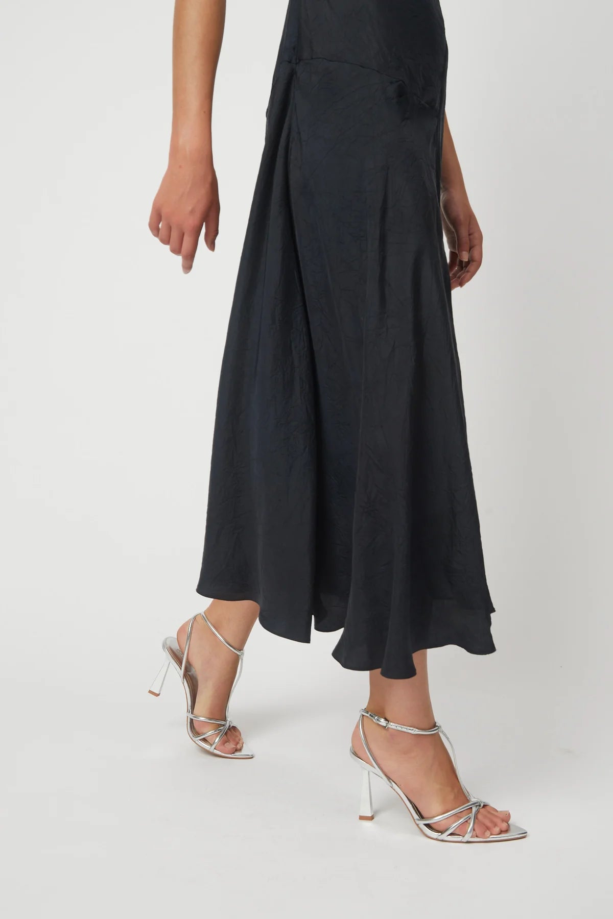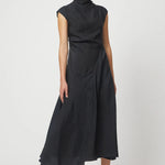 Sleeveless dress in our signature crinkled cupro, tailored body transitions into an asymmetrical flowy skirt. The Twisted Dress is a new Atelier Delphine classic and an all season wardrobe essential.