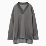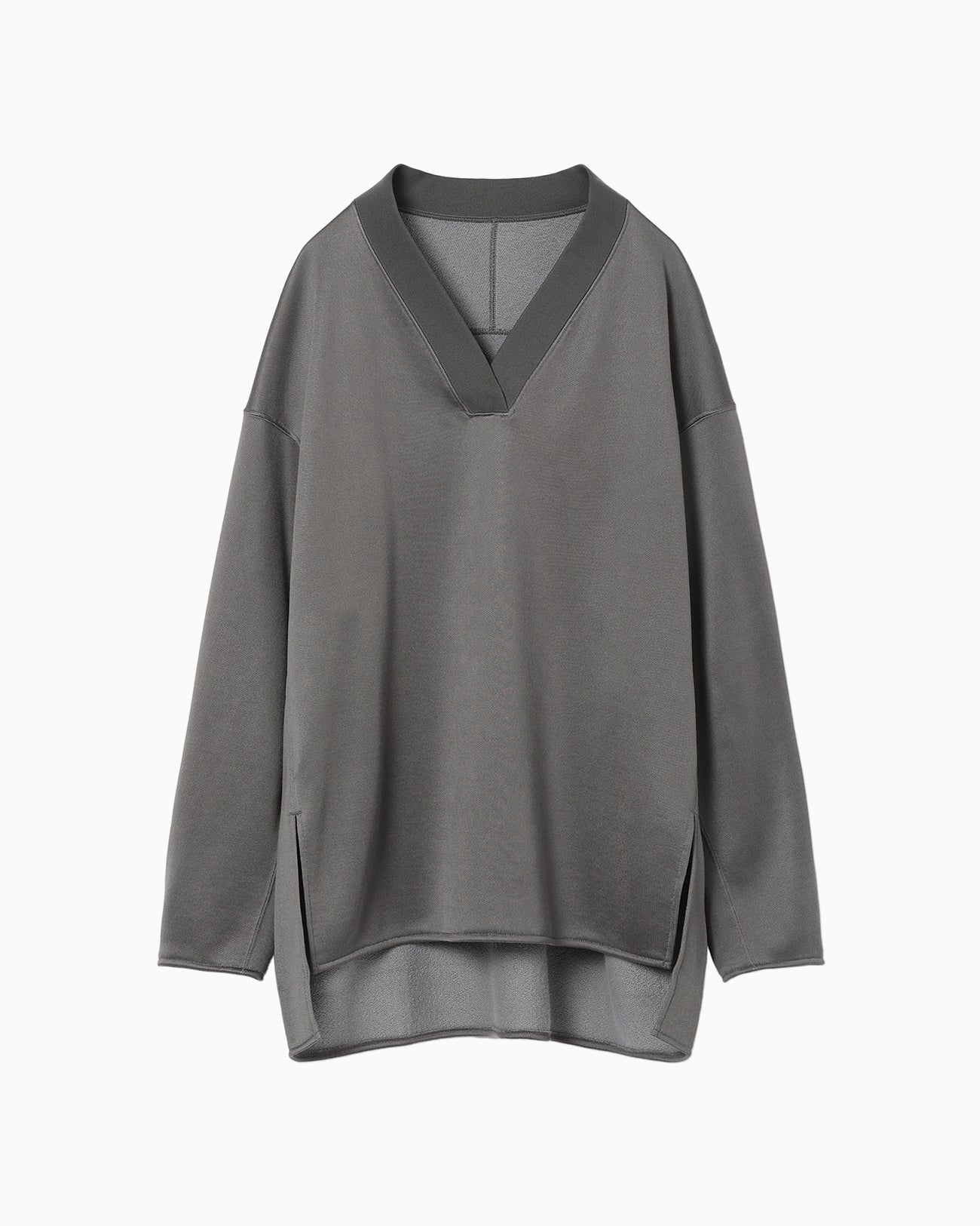 This V-neck sweatshirt top delivers both comfort and elegance in one piece. The outer surface is made of smooth cupro, while the inner terry fabric is cotton, giving it a light and soft feel. The deep V-neck adds a sensual flair, gracefully framing the neckline. Though oversized and relaxed, the silhouette retains a refined appeal, making it a staple for elevated everyday wear.
