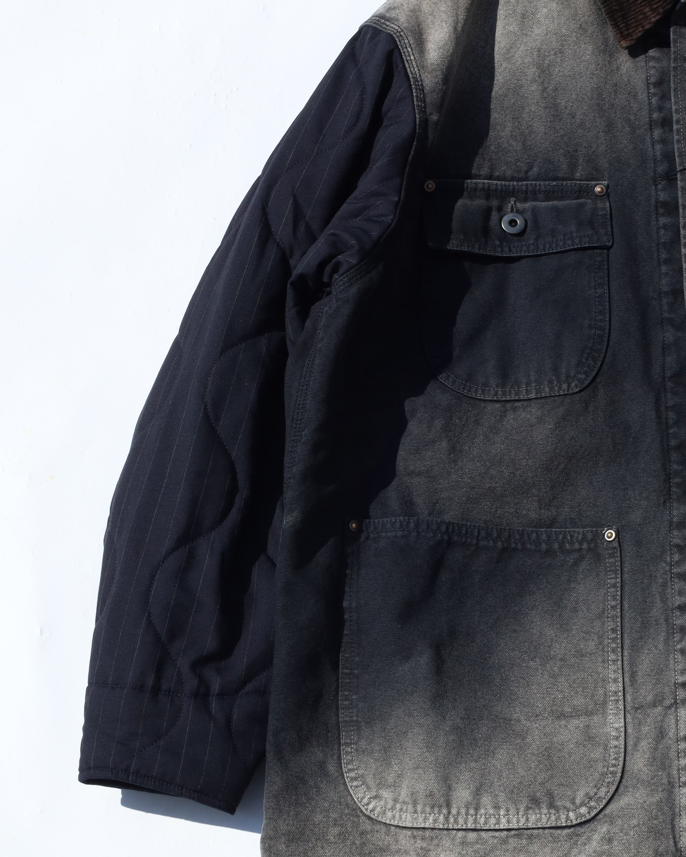 A standout from KHOKI’s FW collection, the Vintage Effect Work Jacket reinterprets classic workwear with elevated fabric choices and artisan finishing. Crafted from 100% cotton with 100% wool sleeves, the jacket features a hand-applied vintage wash, giving each piece its own unique patina. Quilted for warmth and texture, it merges function with visual depth—an iconic docking piece that encapsulates the brand’s distinctive style.